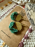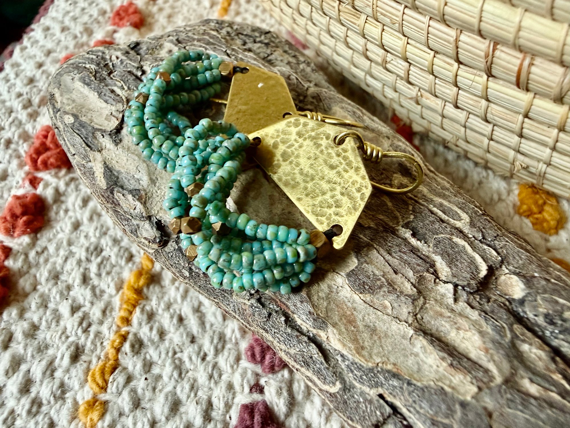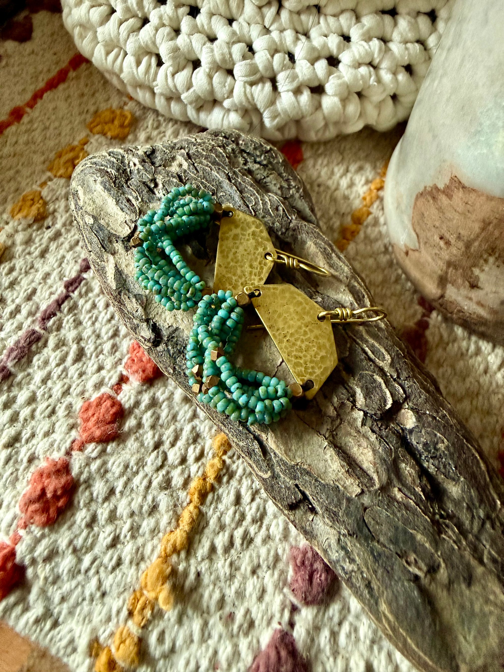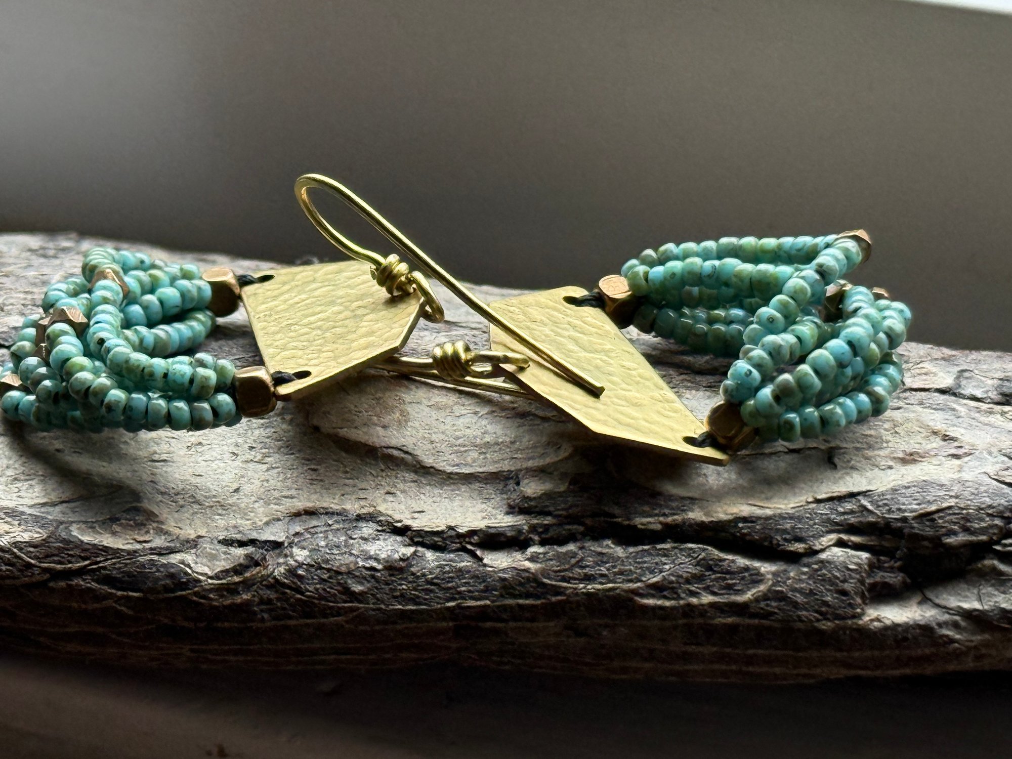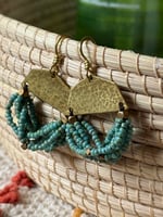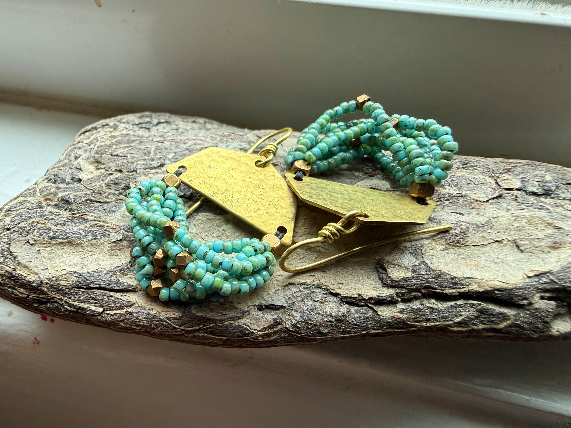 A solid brass blank was delicately hammered by me and ornate with strings of Czech glass beads in blue. Finished with solid brass ear wires.