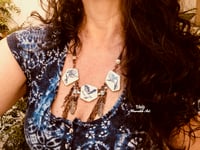 I built this statement necklace featuring these unique handcrafted bird ceramic beads (bird images were fired into the ceramic for ever, they won't fade) accompanied by stones, glass bead, metal feathers in rusty finish, cascades of antique copper chain, solid copper coiled links, solid copper jump rings, solid copper beads, and my handmade clasp to finish the chain (all chain has closed links).