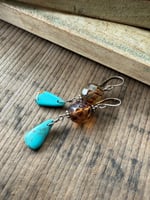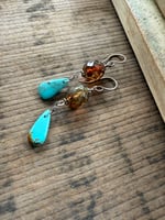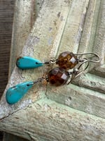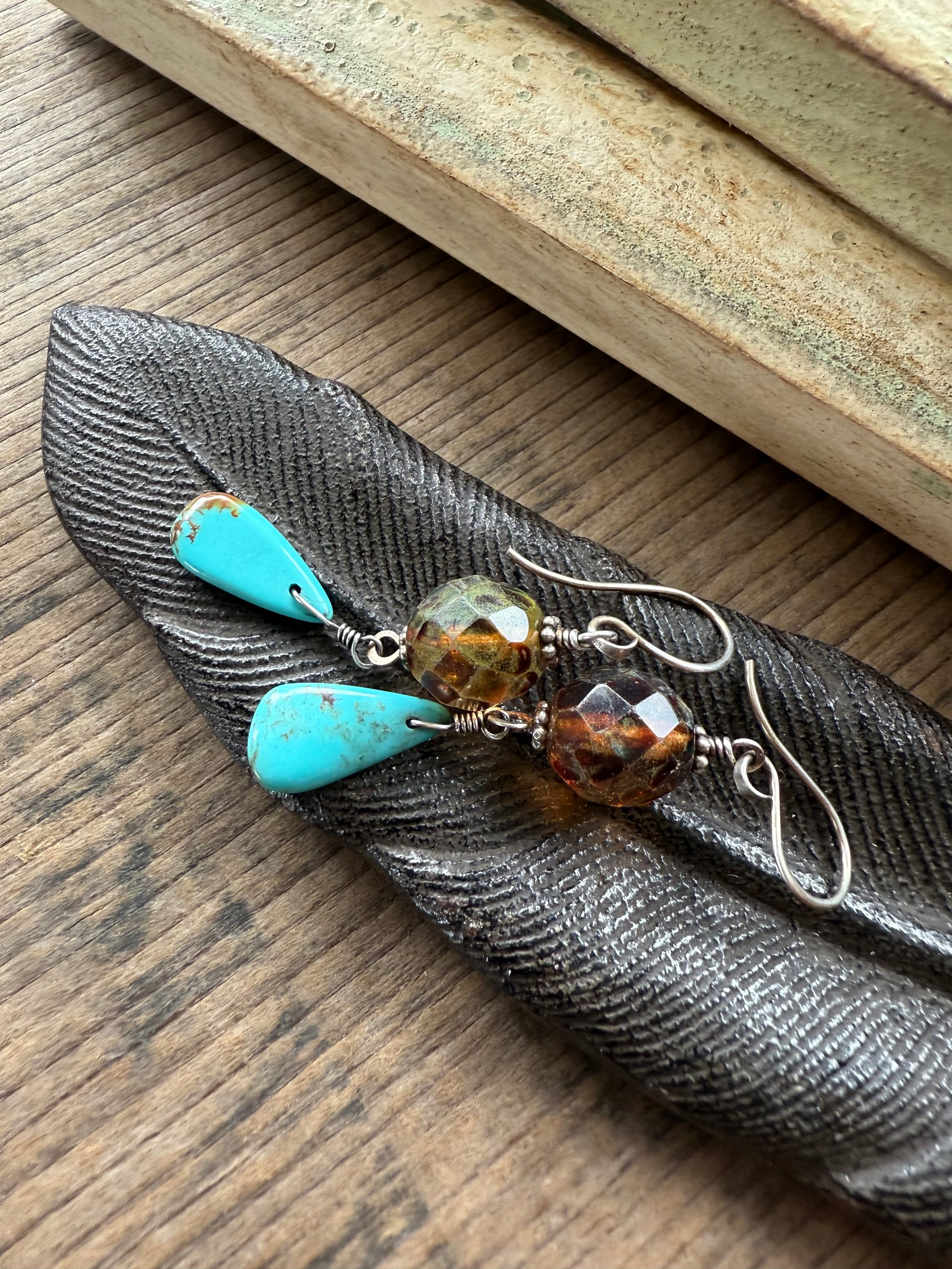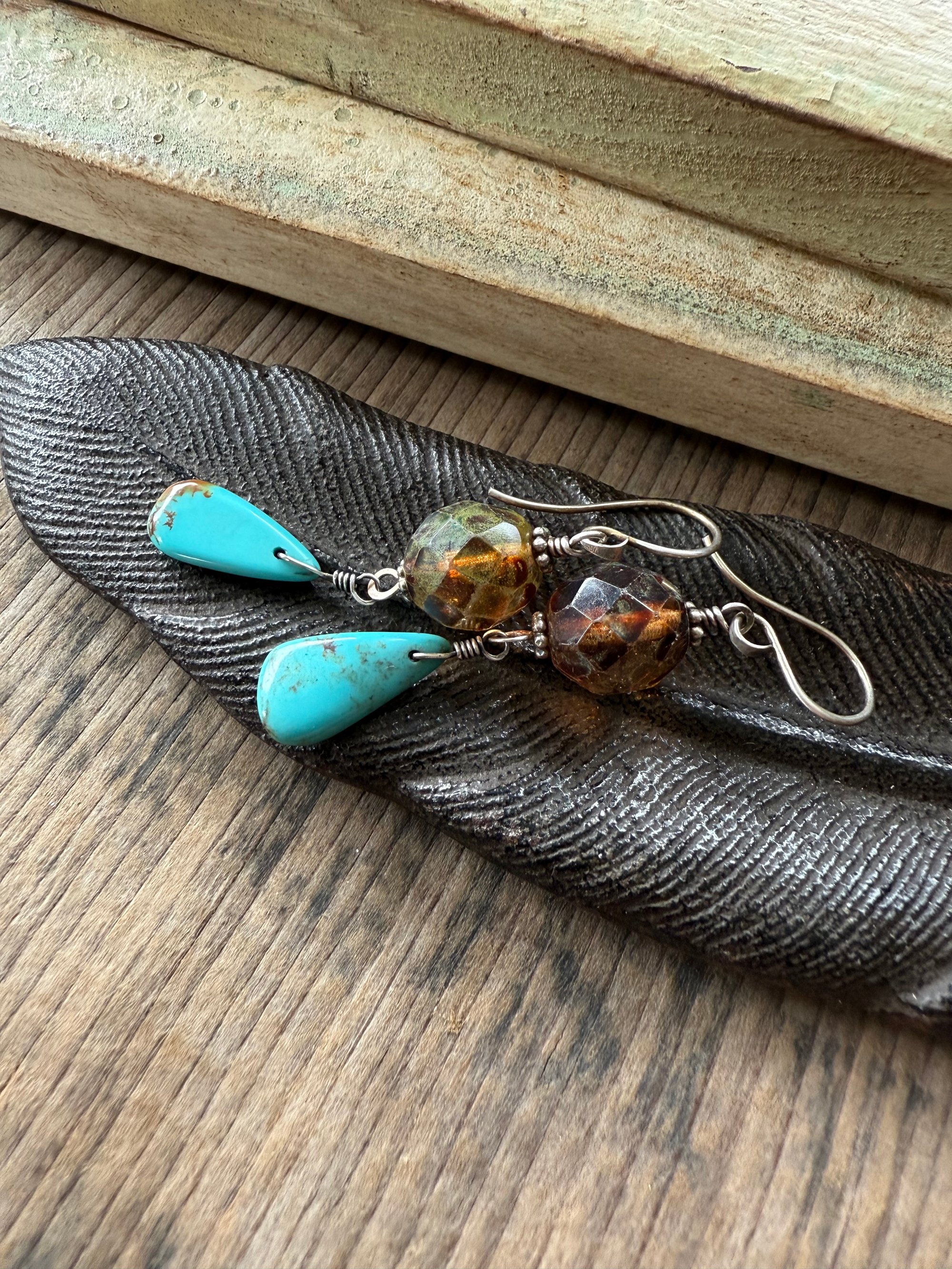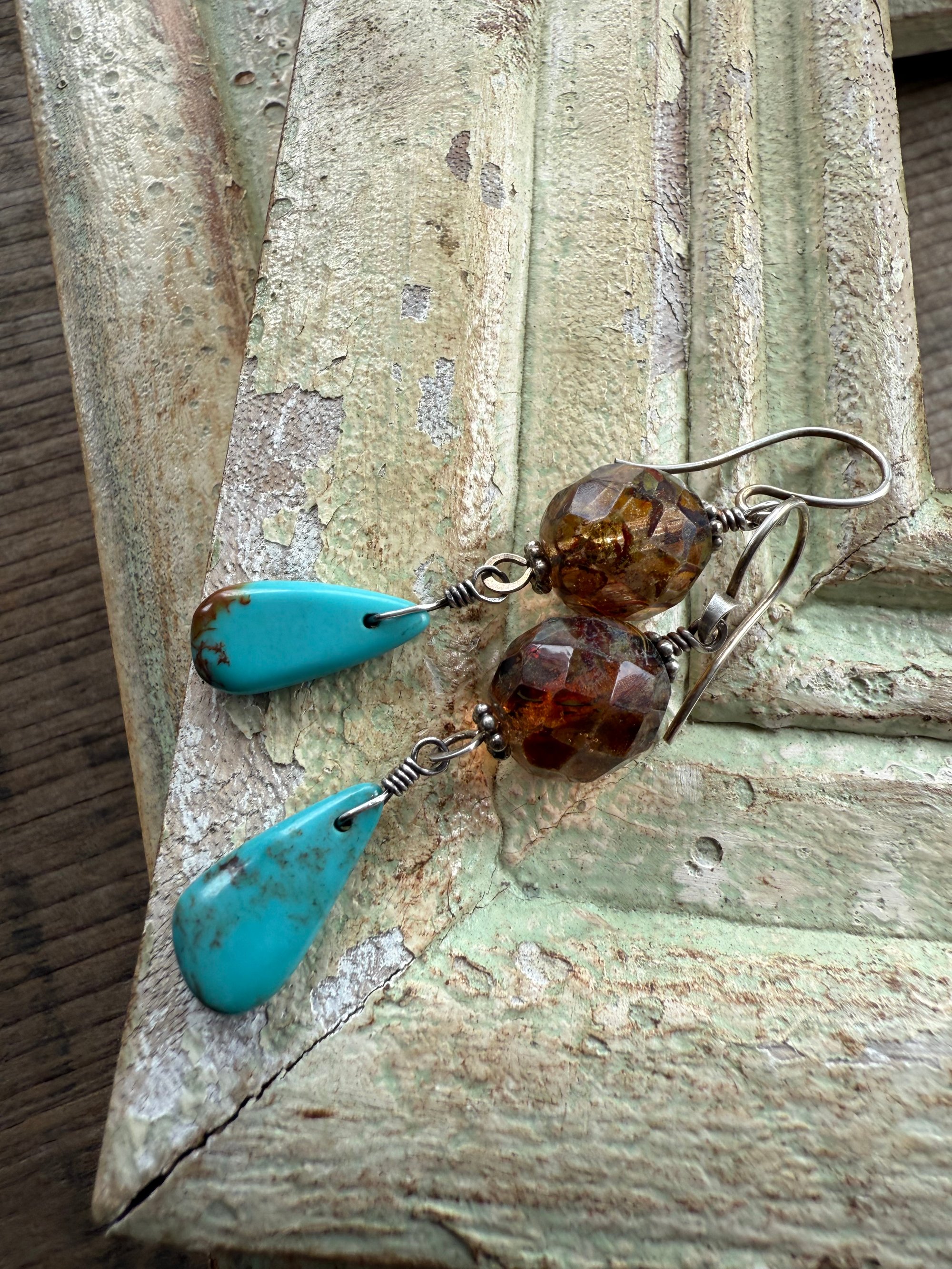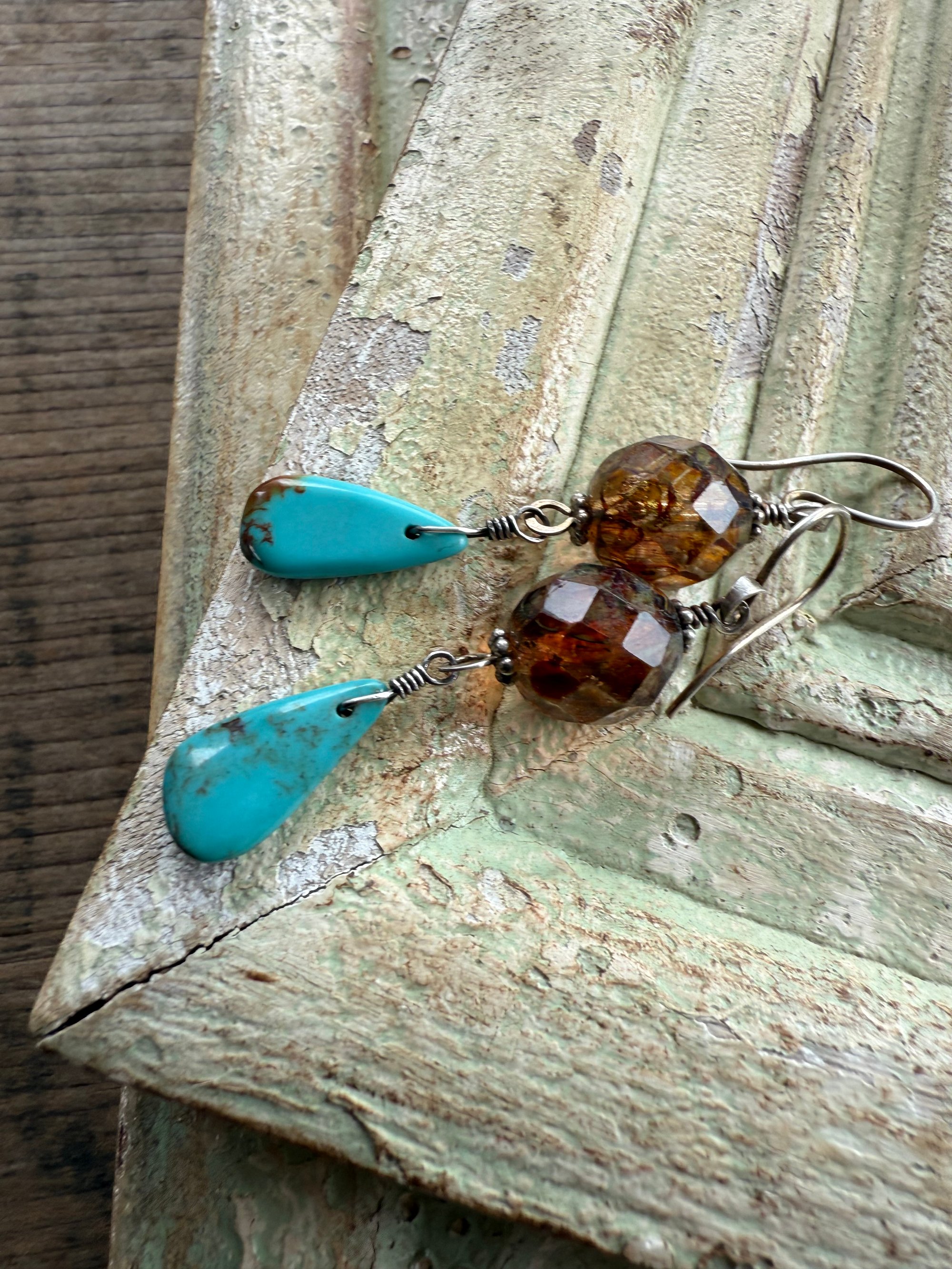 A faceted Czech glass in earthy brown and a Kingman Turquoise in my sterling silver construction. Sterling ear wires.