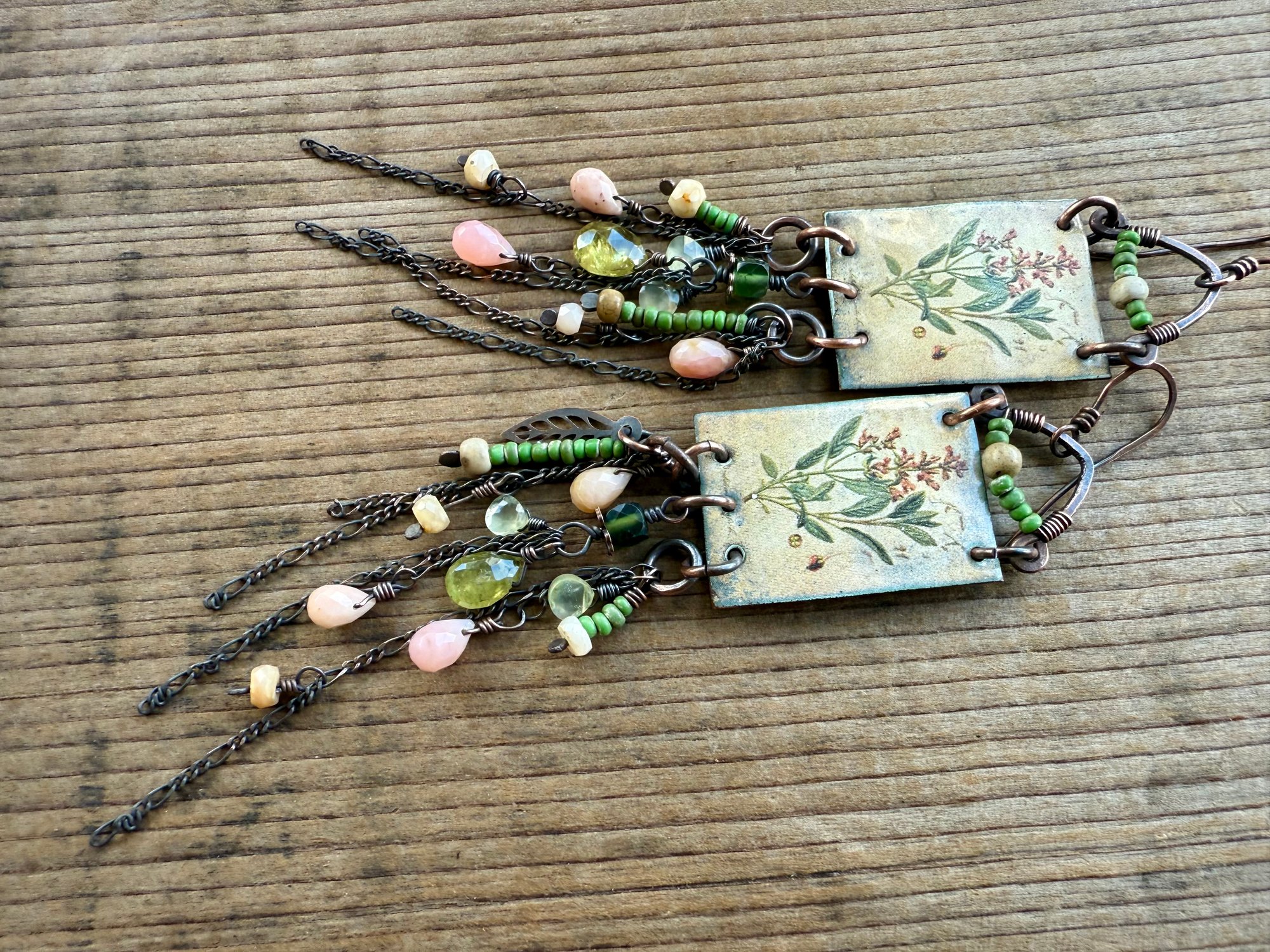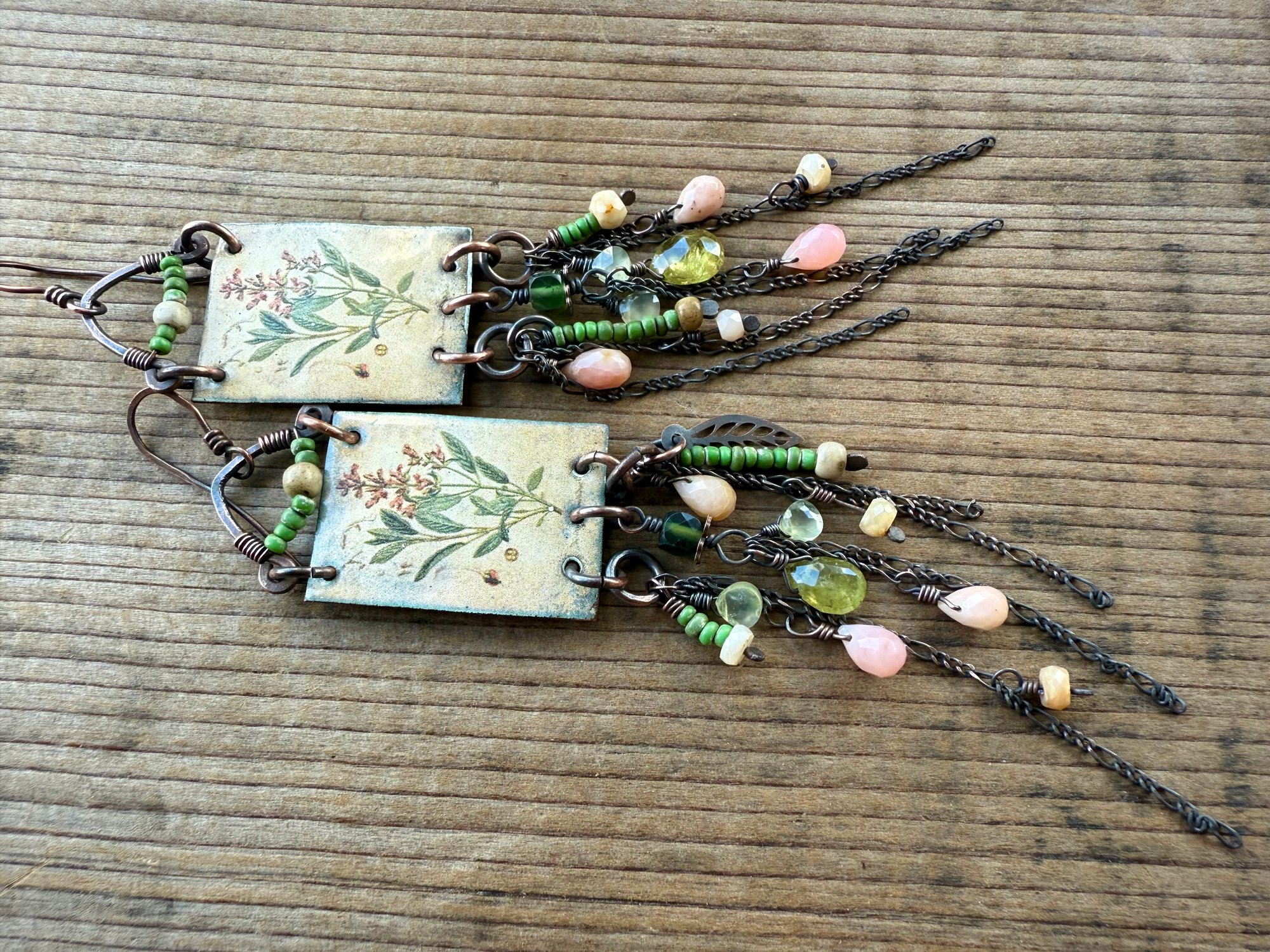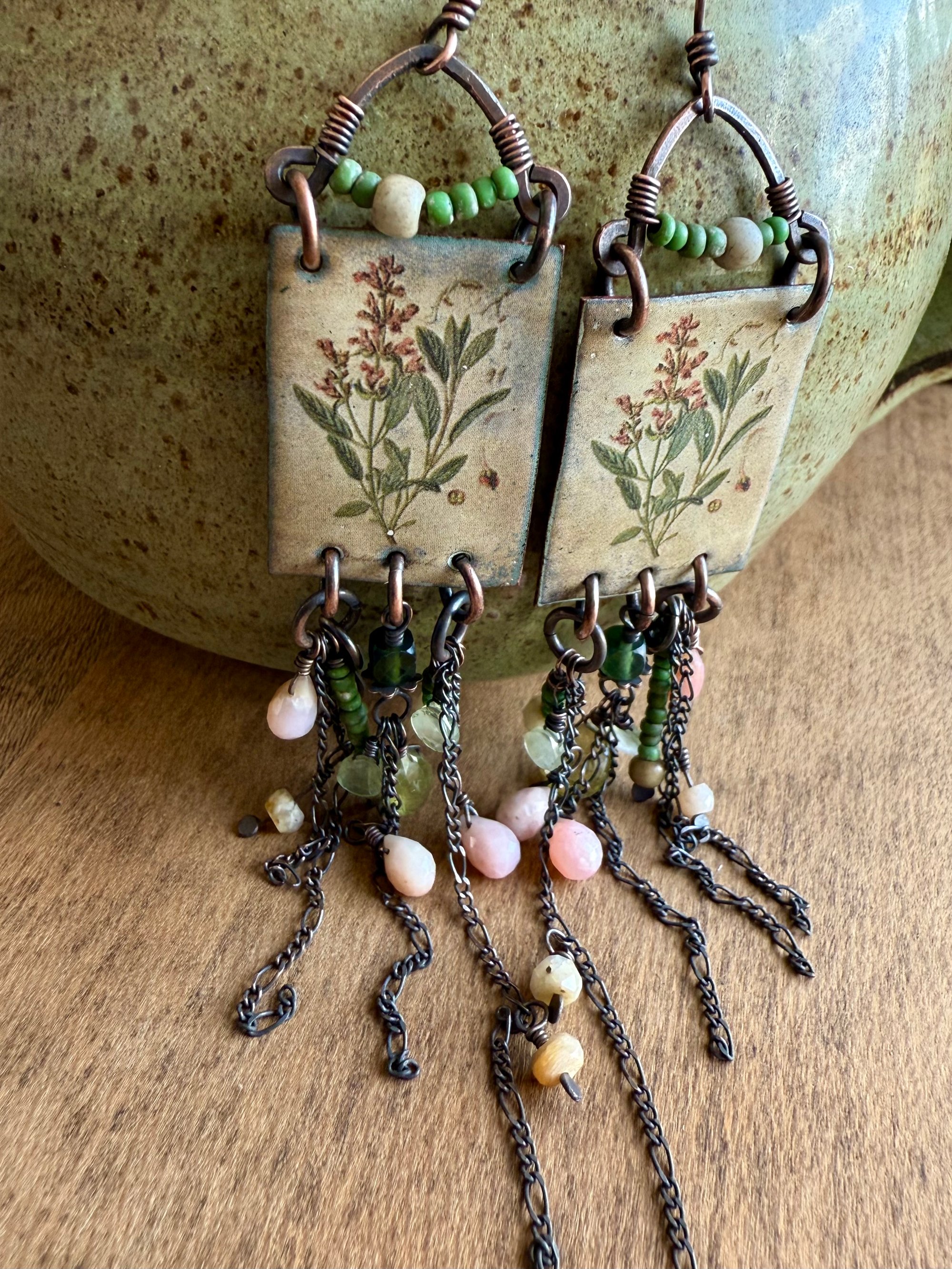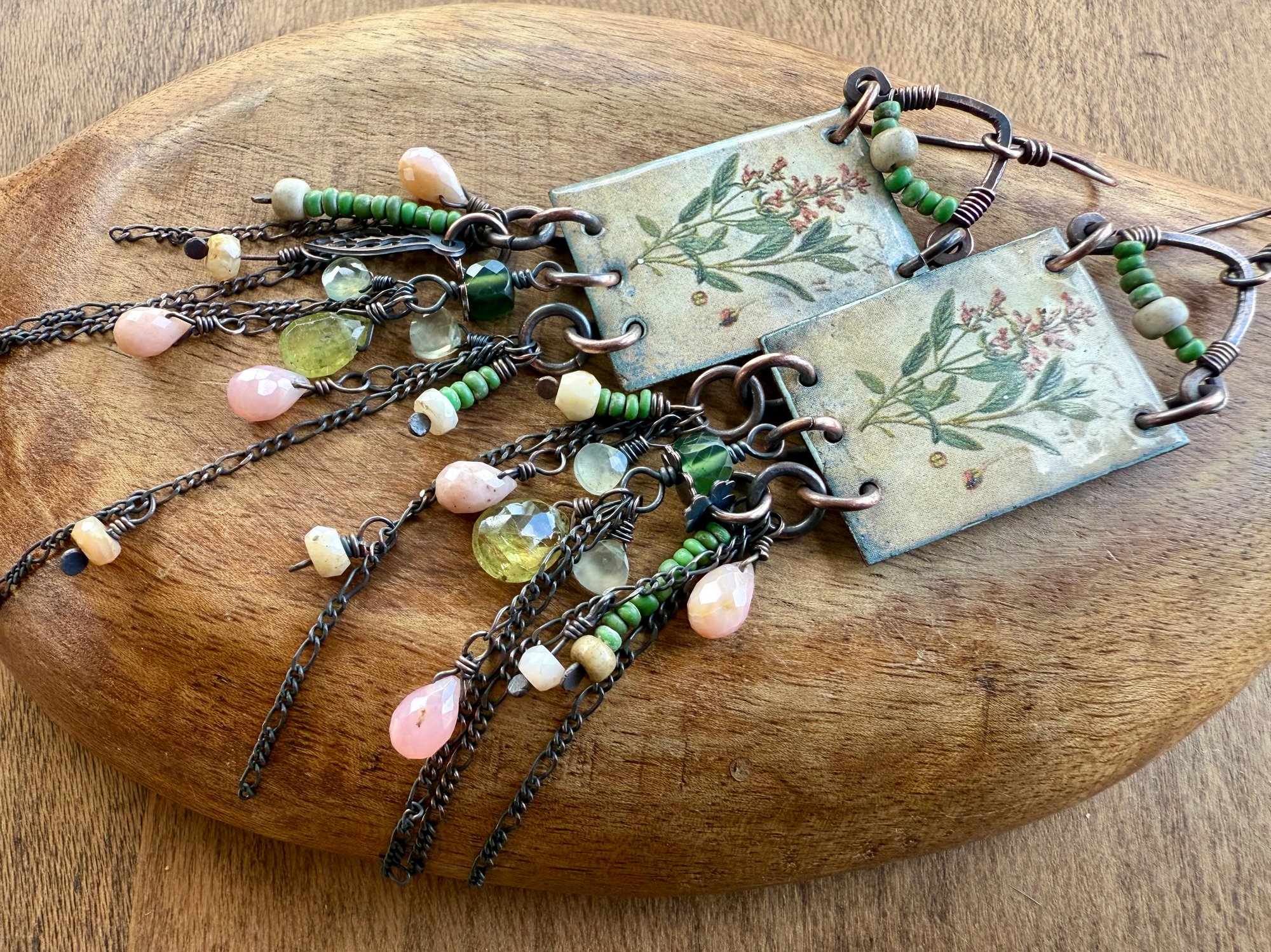 Vintage Flowers motif on artisan enamel charms as focal, ornate bellow with Indonesian glass beads in green and natural colors, sections of antique copper chain, pink Opal stones, Prehnite stone, green Garnet stone, dark Vesuvianite 3d squares. Hold at the top with a loop ornate with green Indonesian glass seed beads in green and beige and finished with solid copper ear wires.