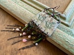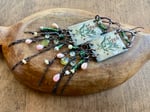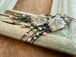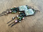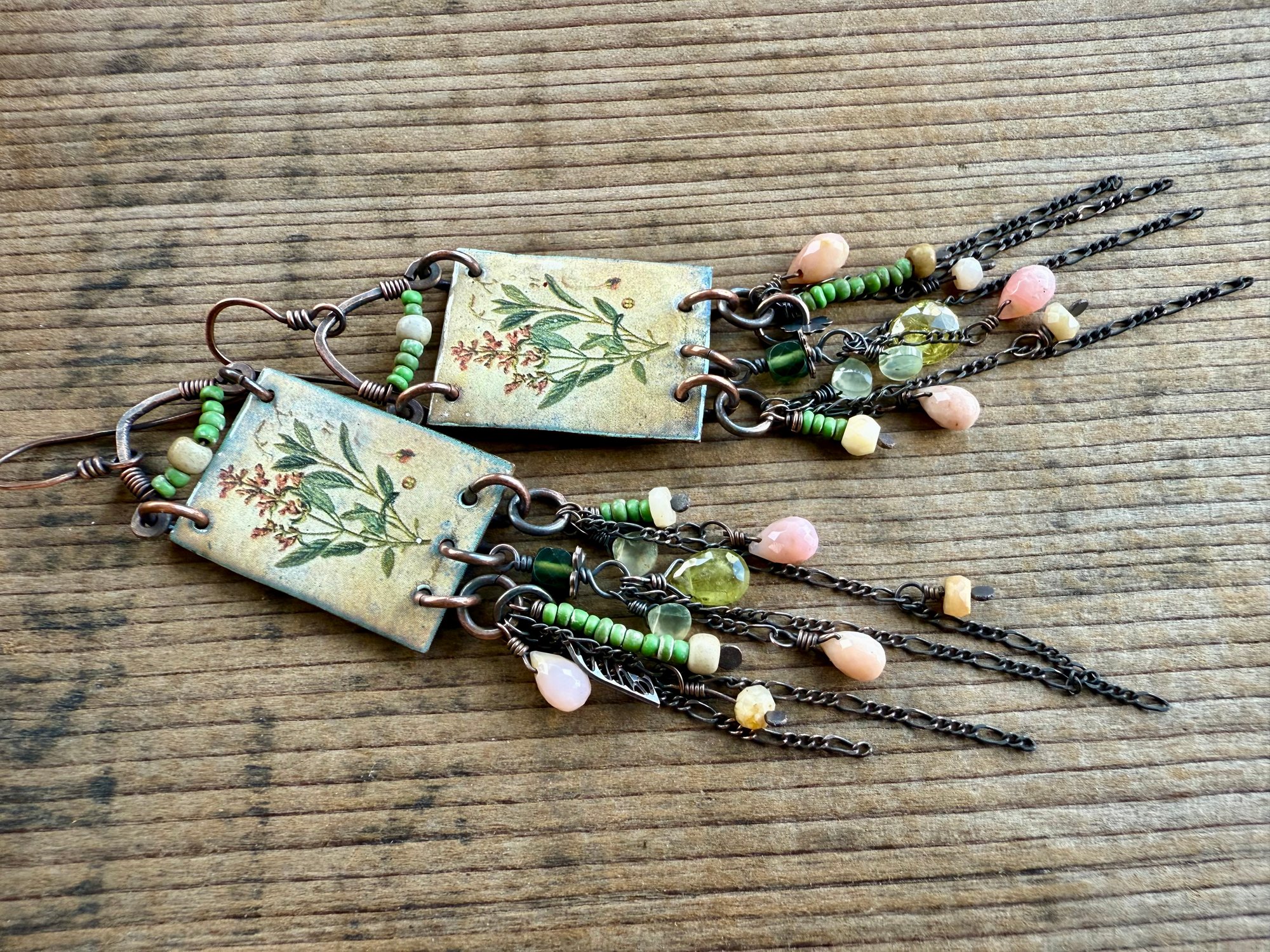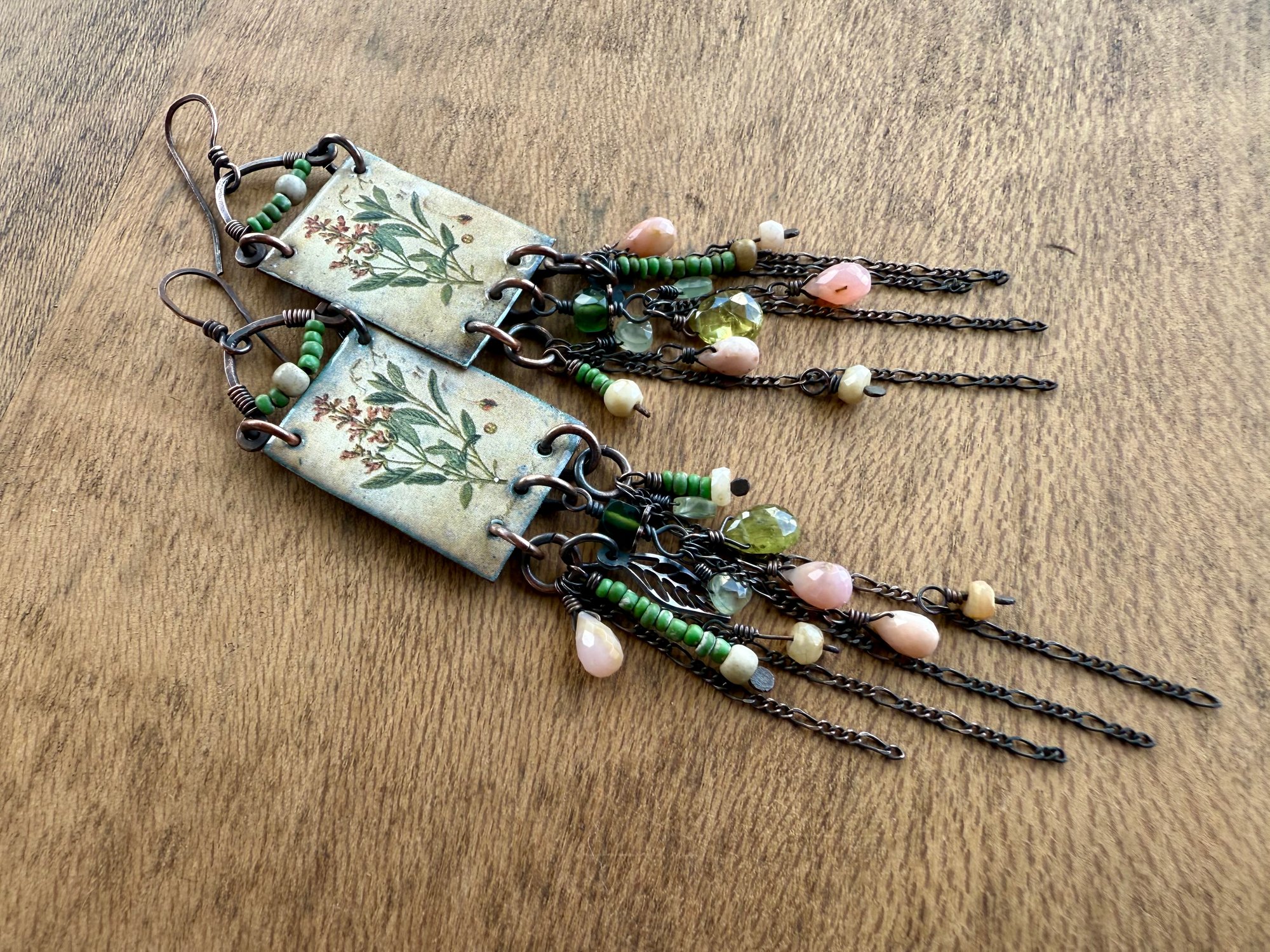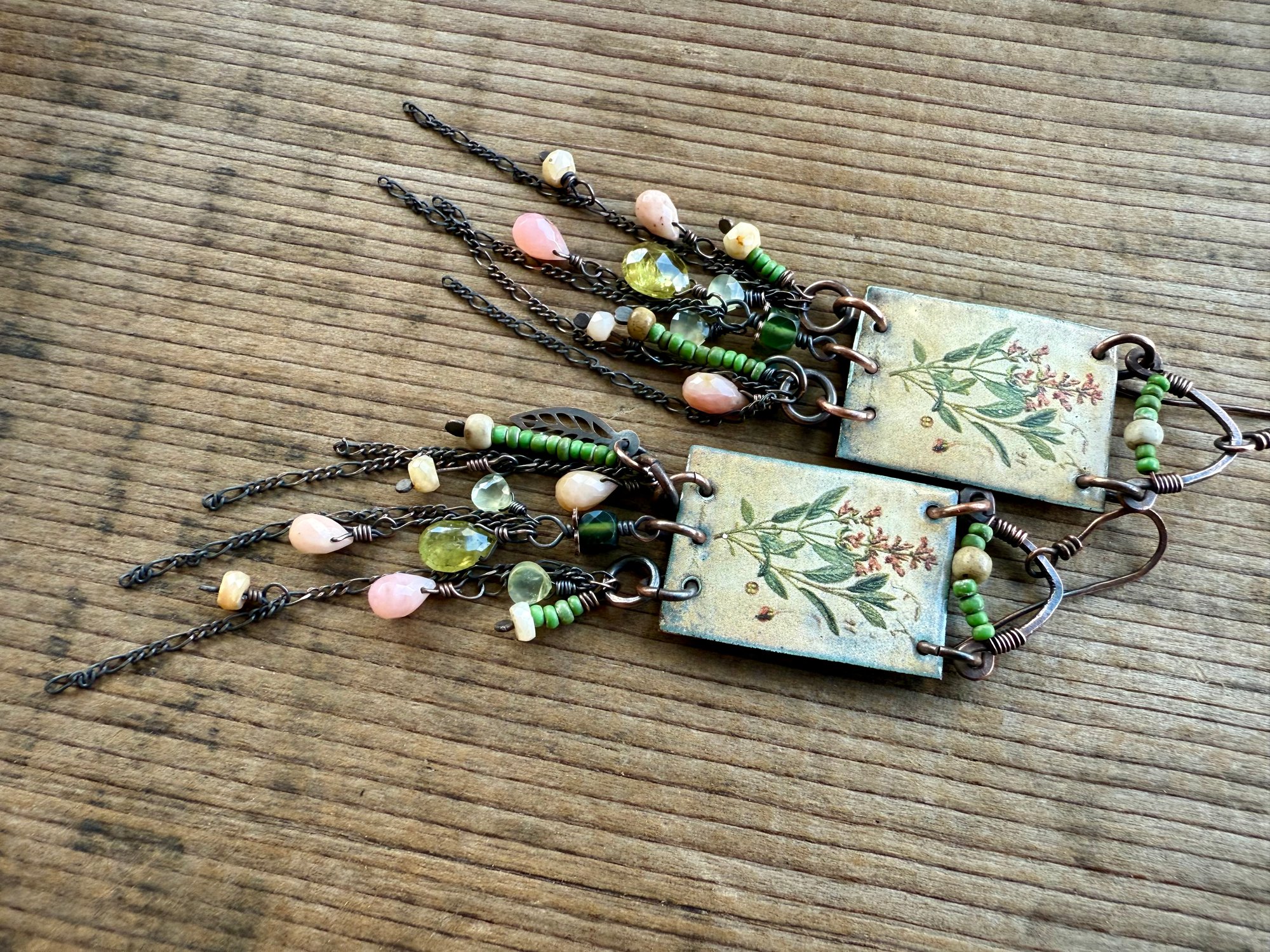 Vintage Flowers motif on artisan enamel charms as focal, ornate bellow with Indonesian glass beads in green and natural colors, sections of antique copper chain, pink Opal stones, Prehnite stone, green Garnet stone, dark Vesuvianite 3d squares. Hold at the top with a loop ornate with green Indonesian glass seed beads in green and beige and finished with solid copper ear wires.