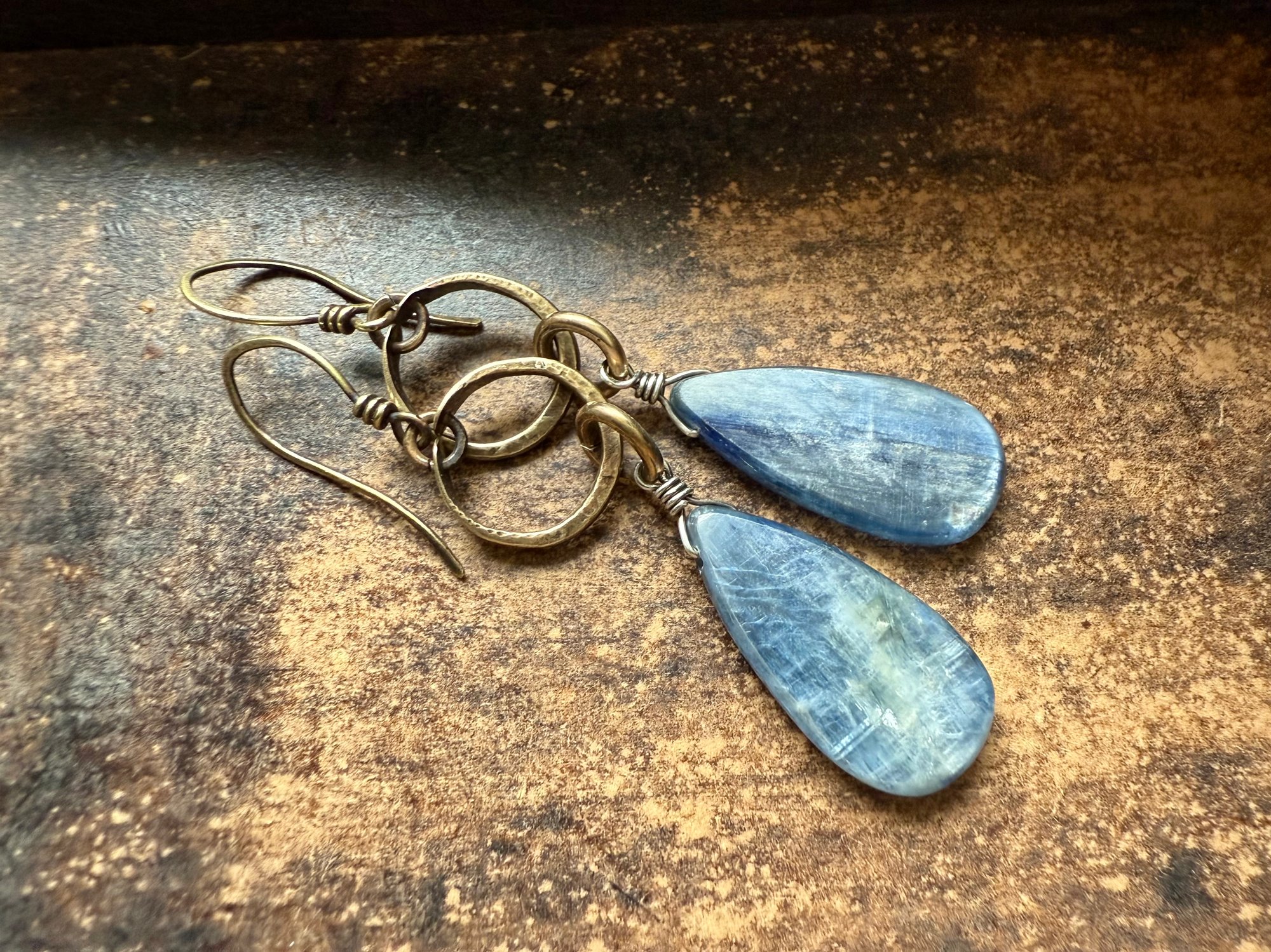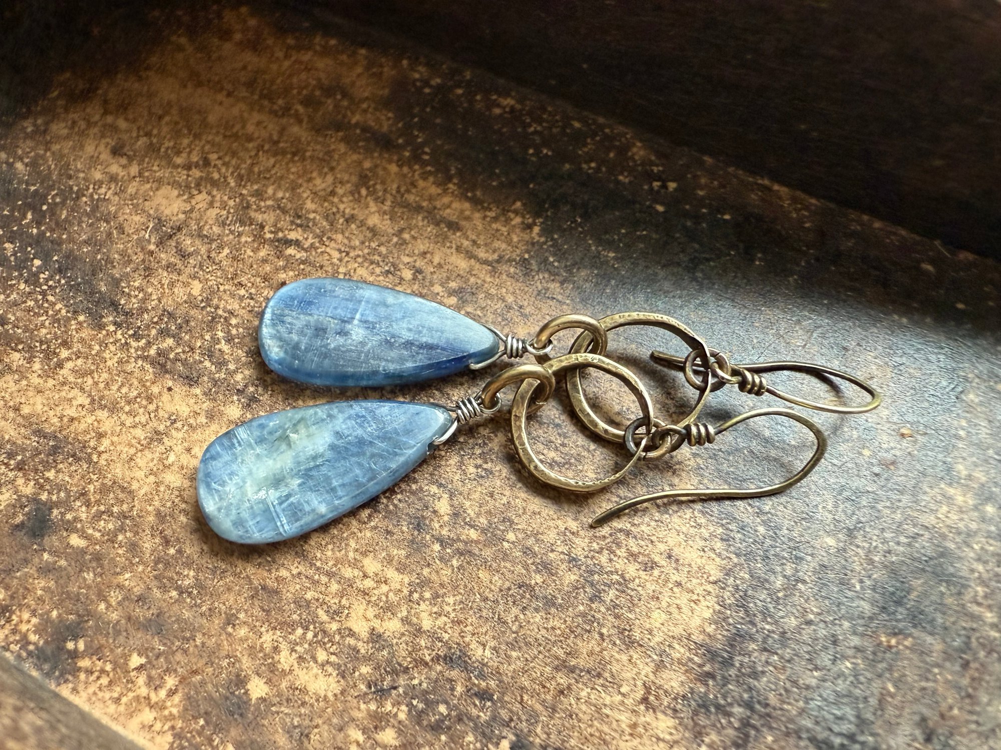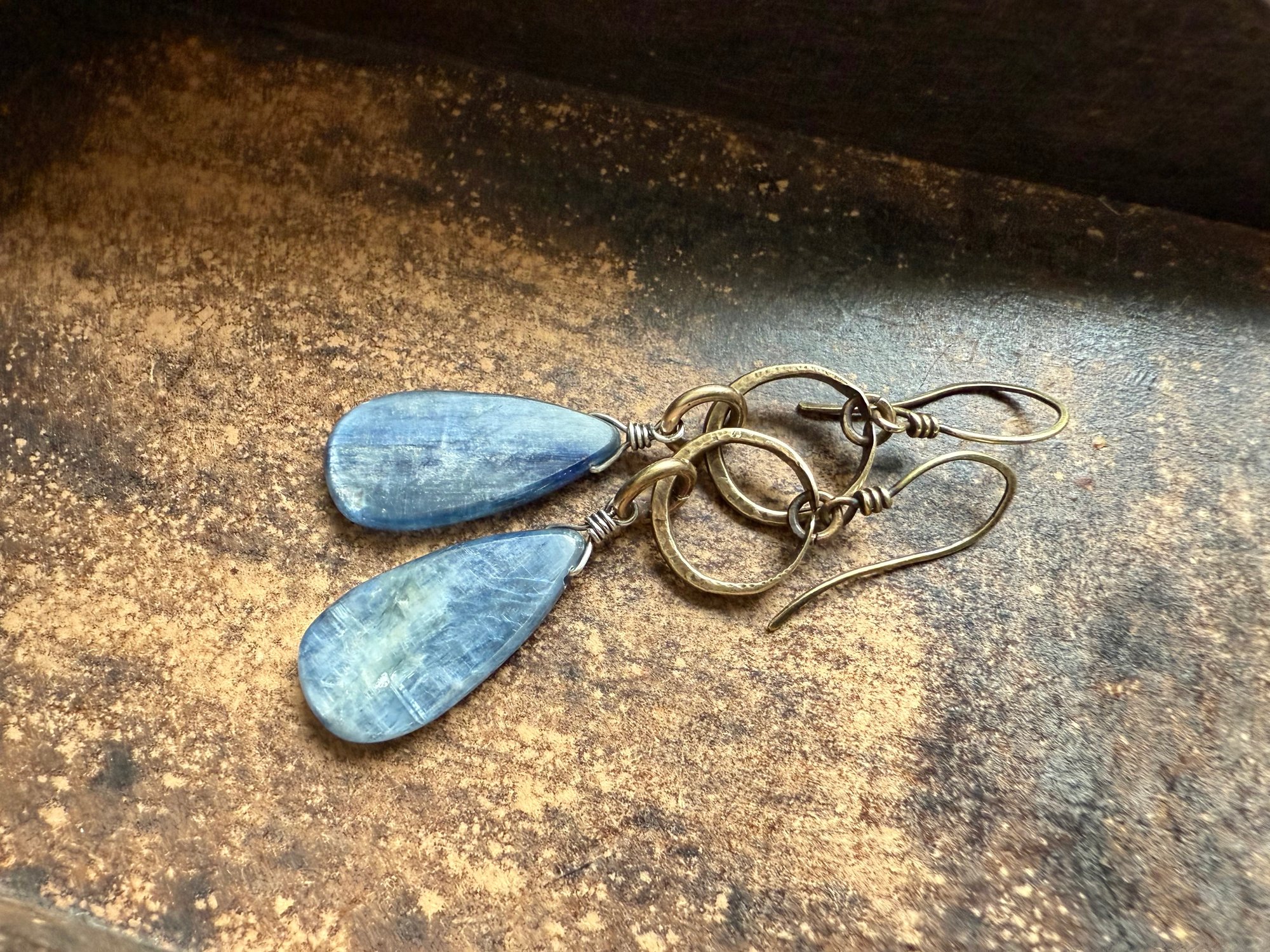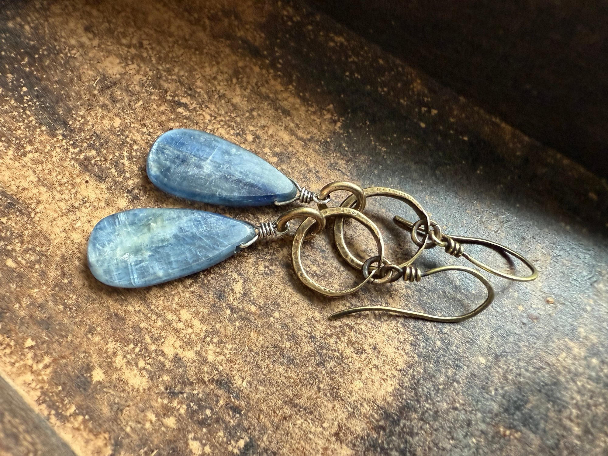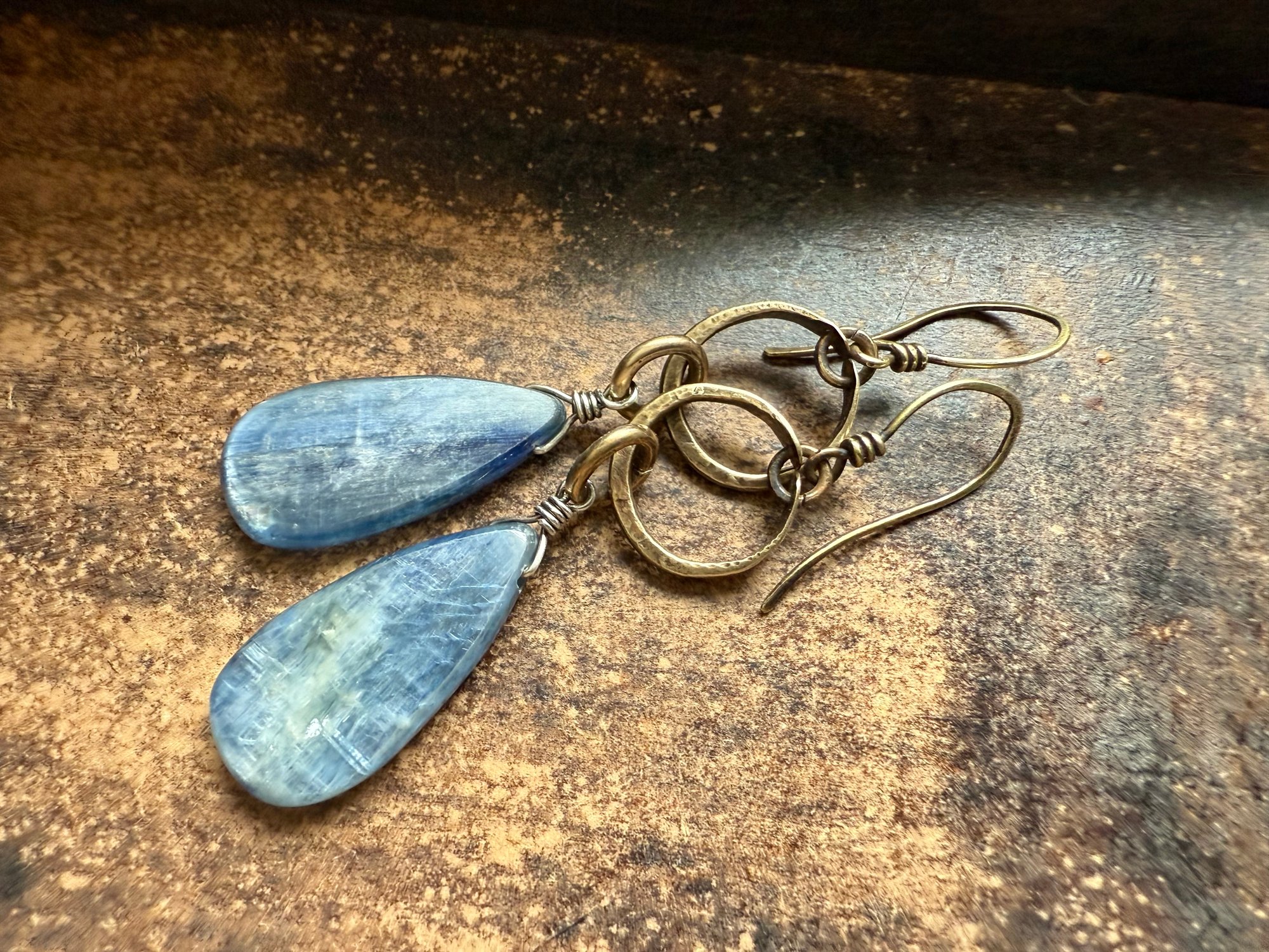 A large, natural blue Kyanite stone is wrapped with sterling silver wire and dangles bellow my hand forged solid brass loops and ear wires.