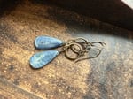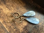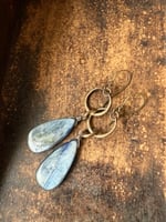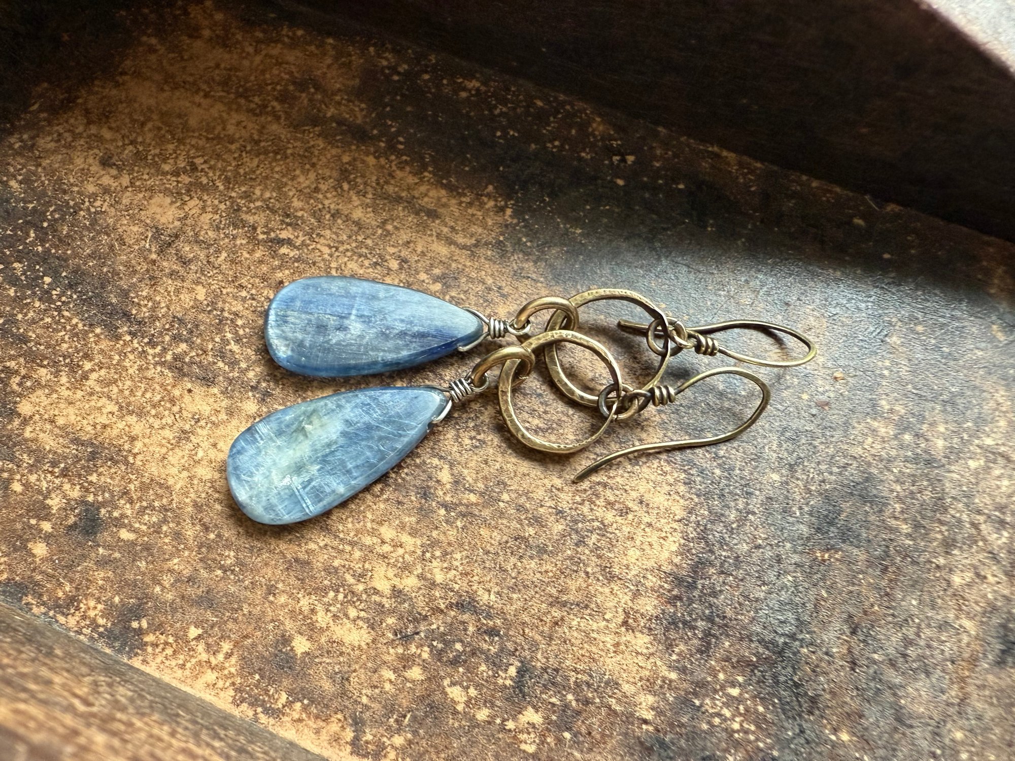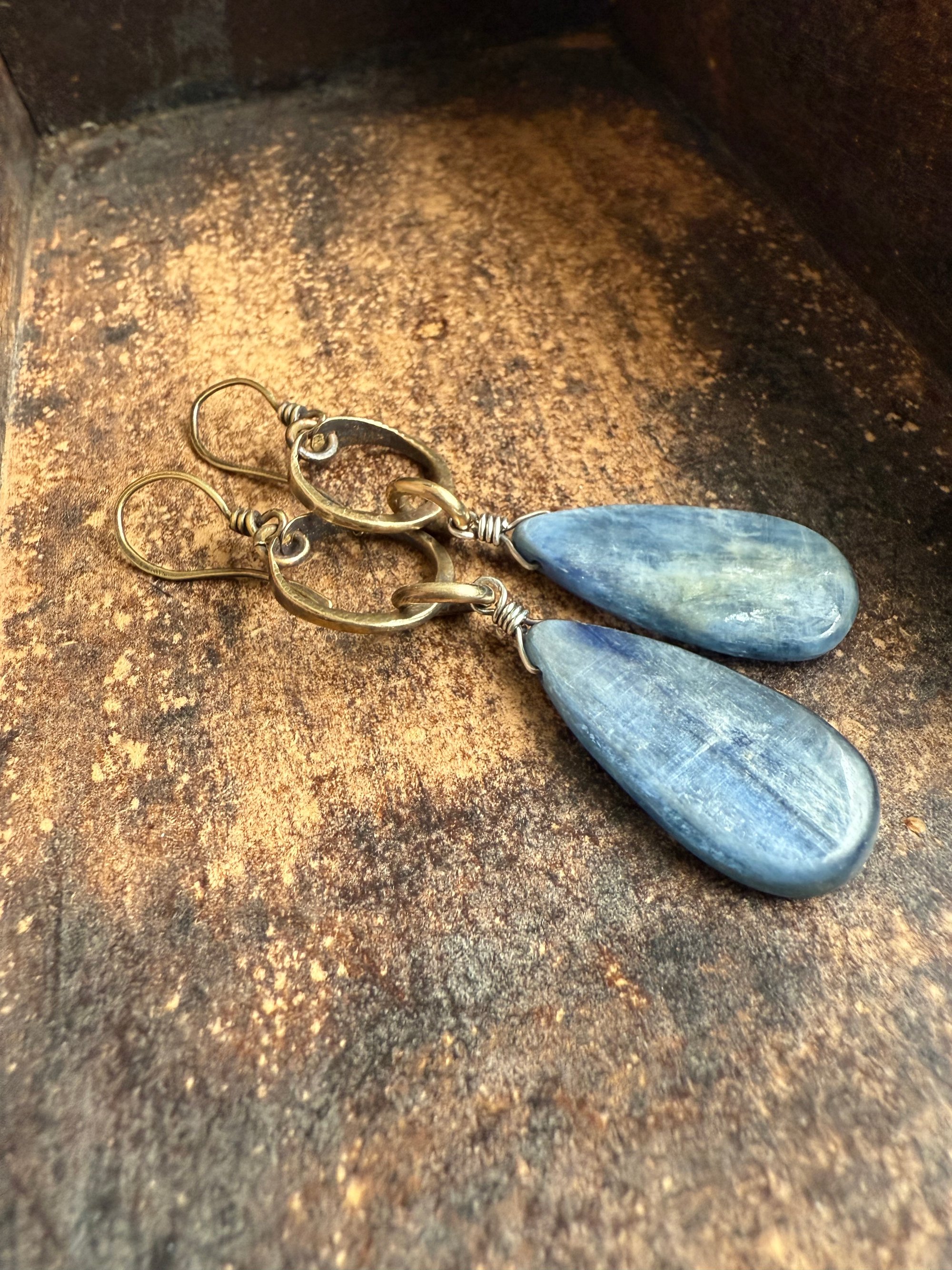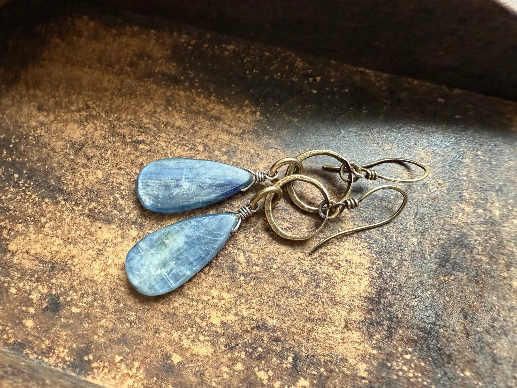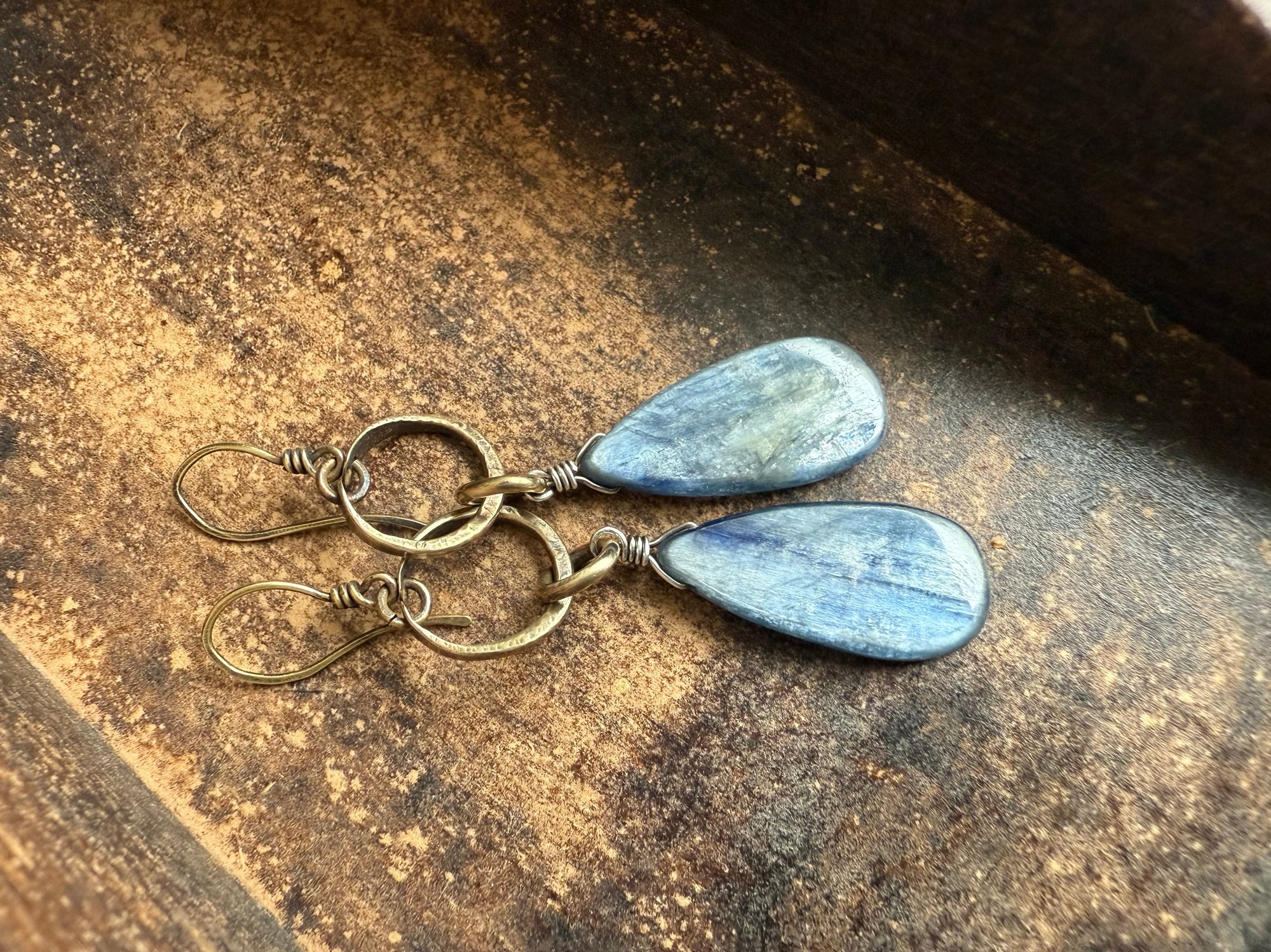 A large, natural blue Kyanite stone is wrapped with sterling silver wire and dangles bellow my hand forged solid brass loops and ear wires.