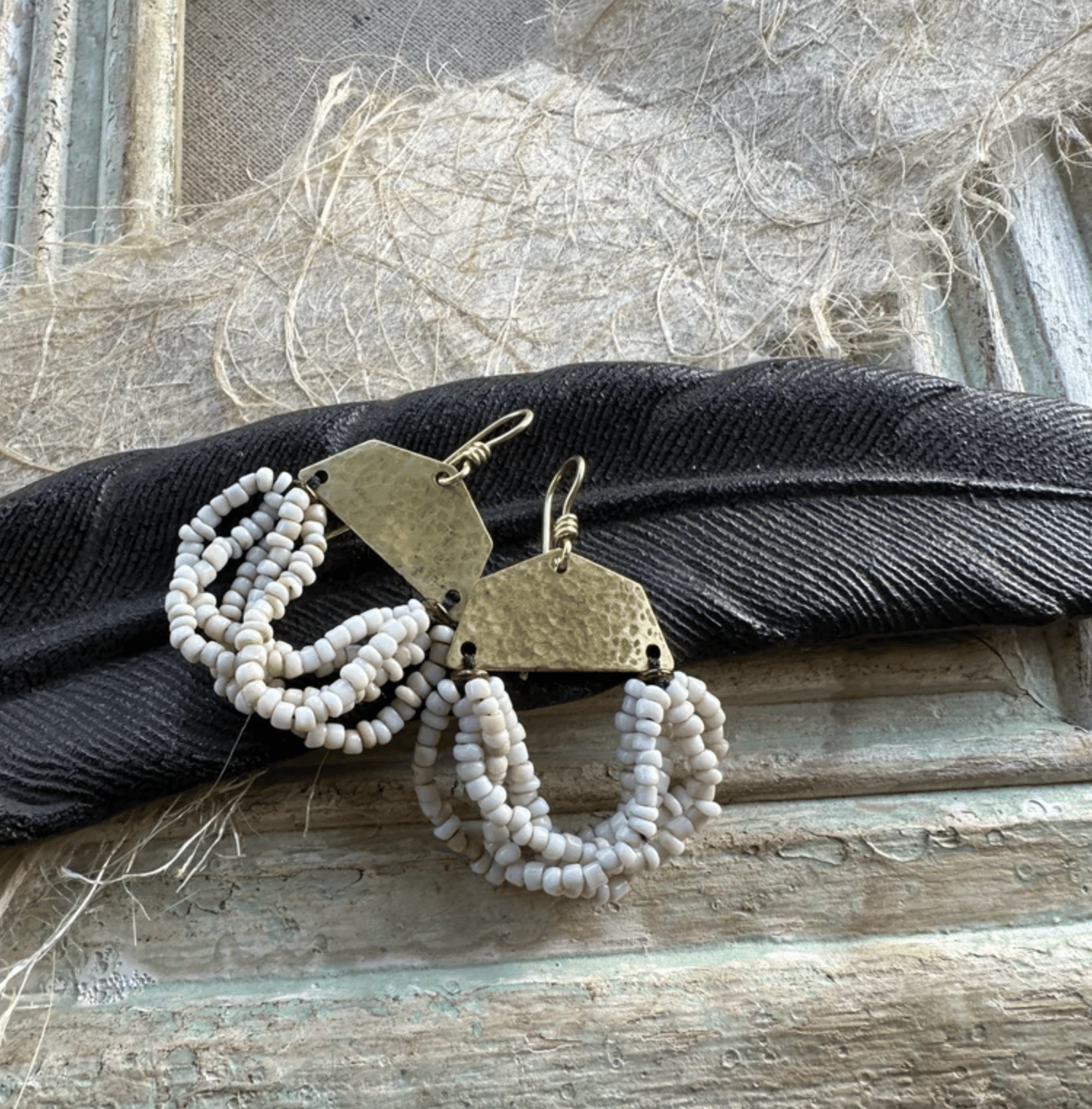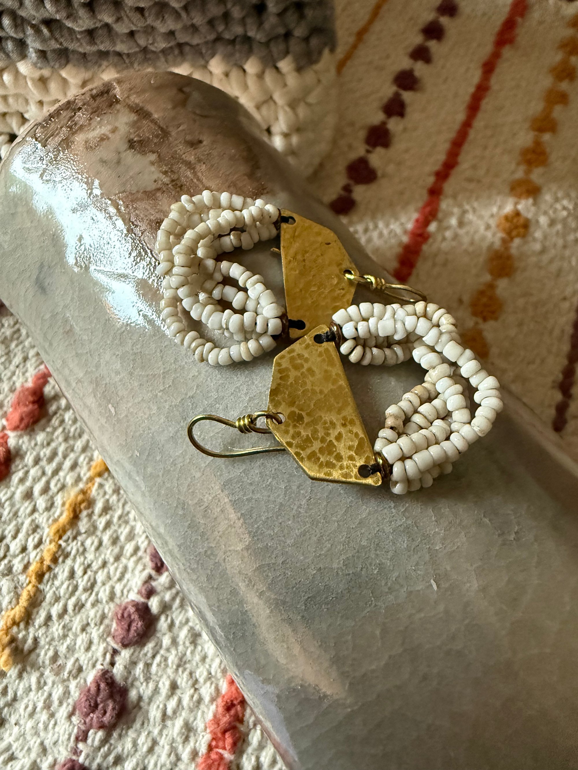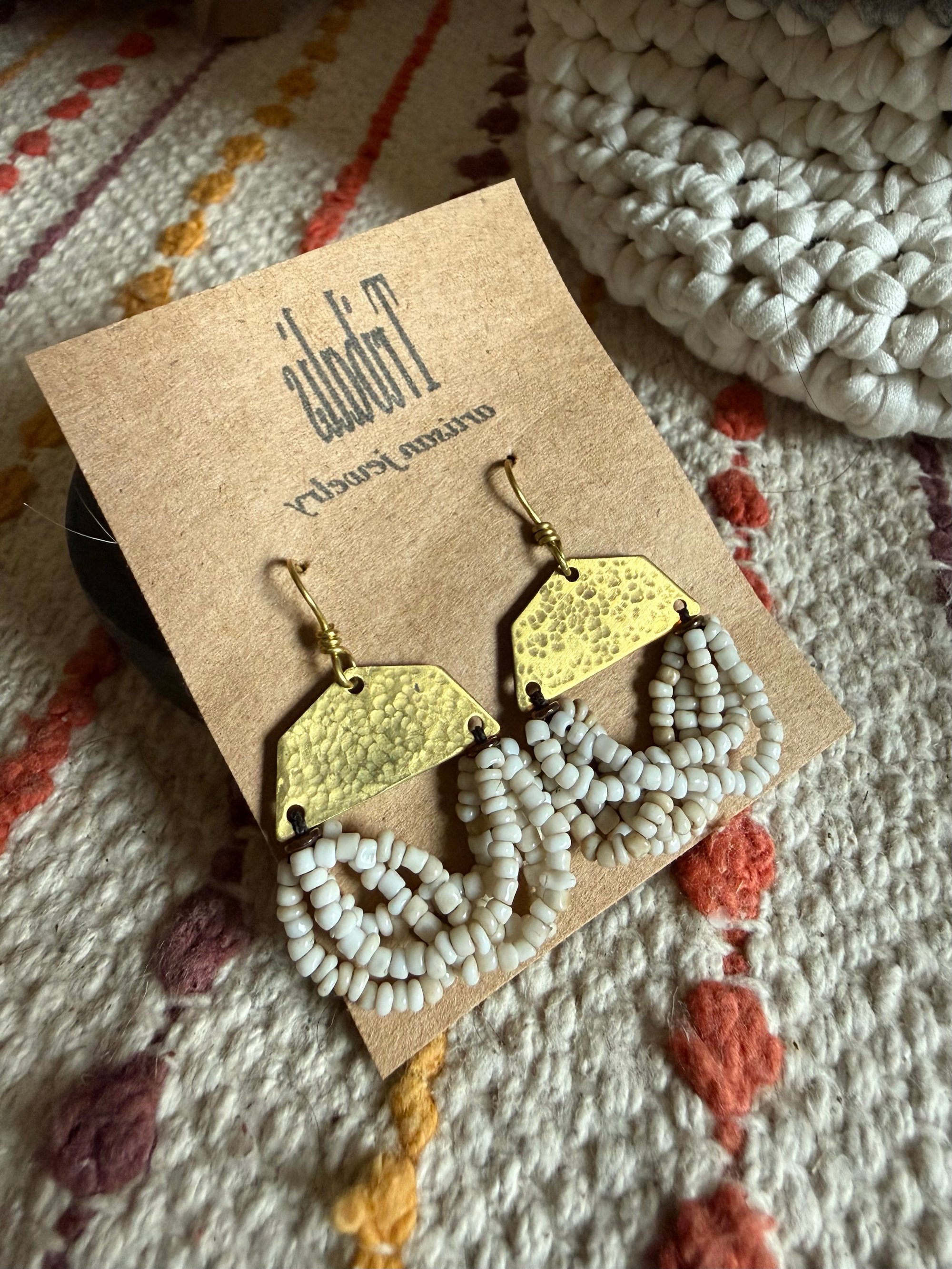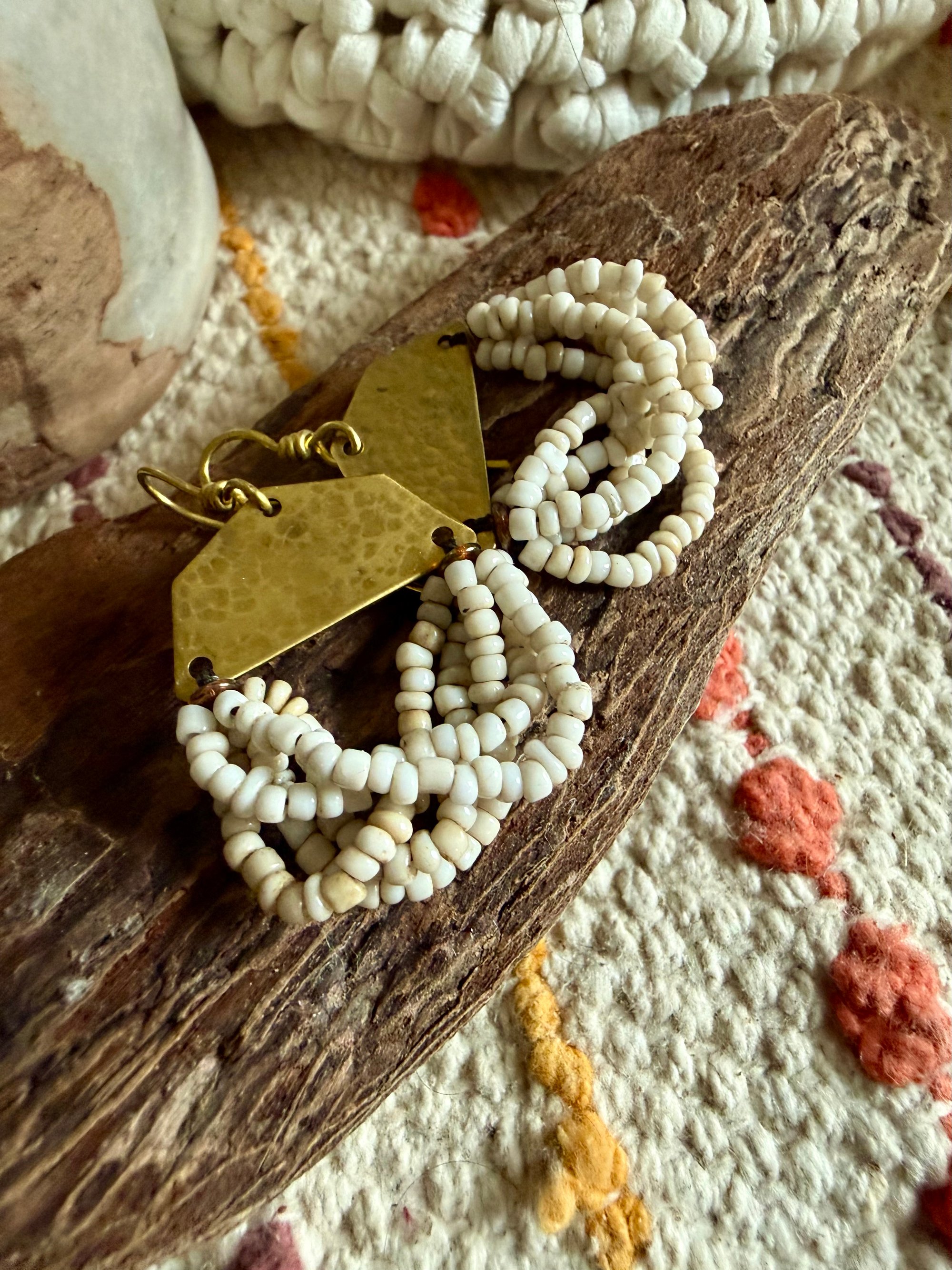 A solid brass blank was delicately hammered by me and ornate with strings of vintage African seed glass beads. Finished with solid brass ear wires.