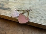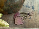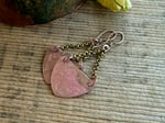 A solid copper focal has been made by me from solid copper sheet. I cut, polished, textured and applied a rustic and primitive fire patina. It dangles bellow sections of antique brass chain and is finished with copper ear wires.