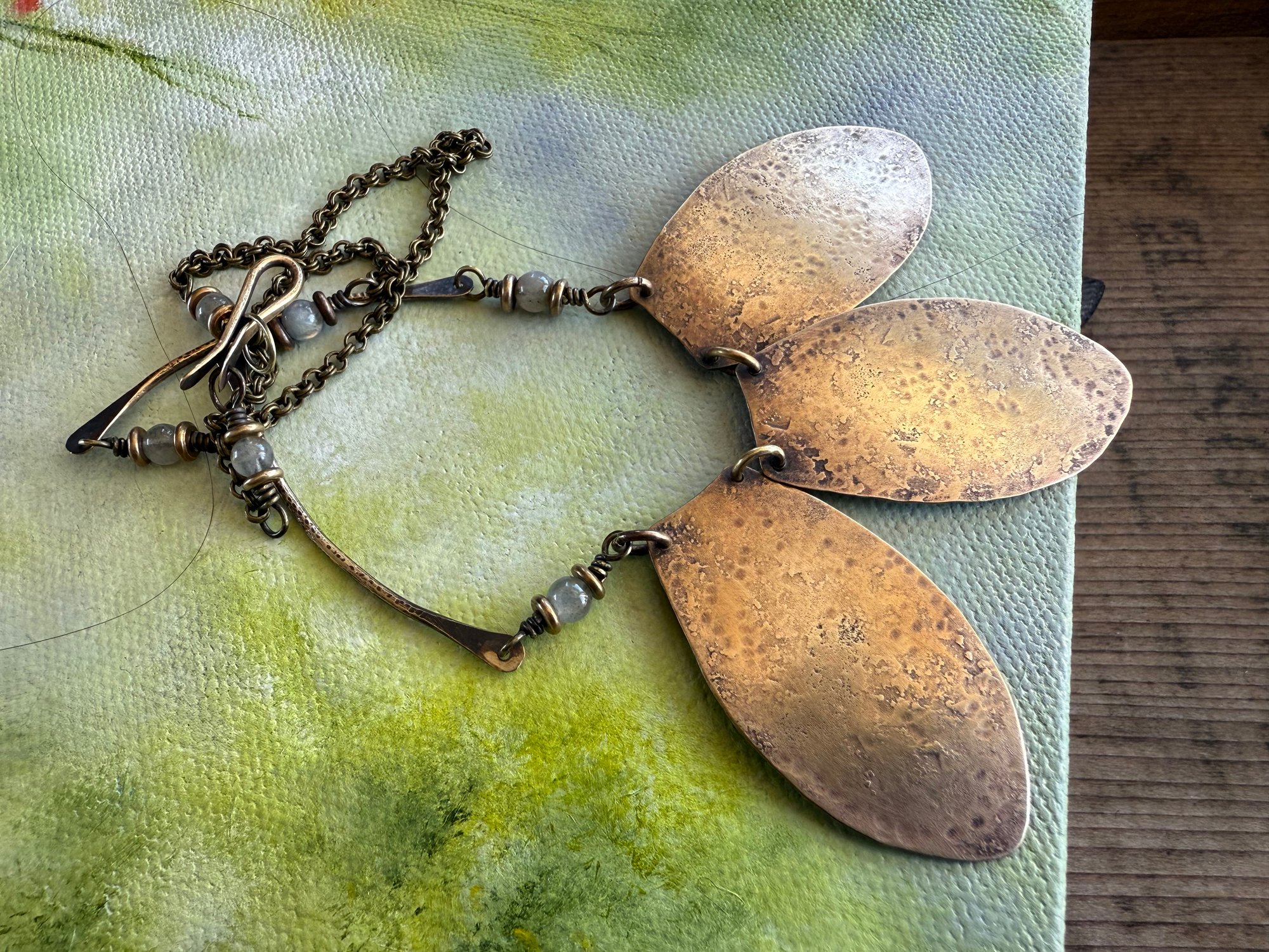 Petals are hold by Labradorie stone and solid Heshi brass spacers, antique brass chain (soldered links), my handmade solid brass sticks and my handmade findings.