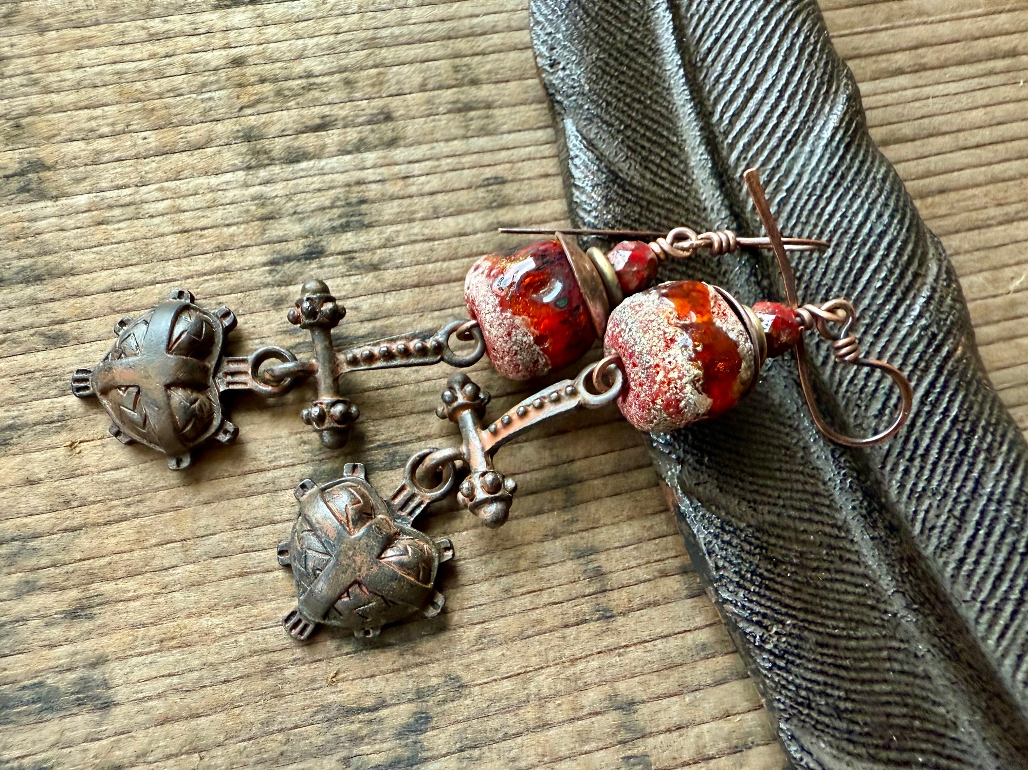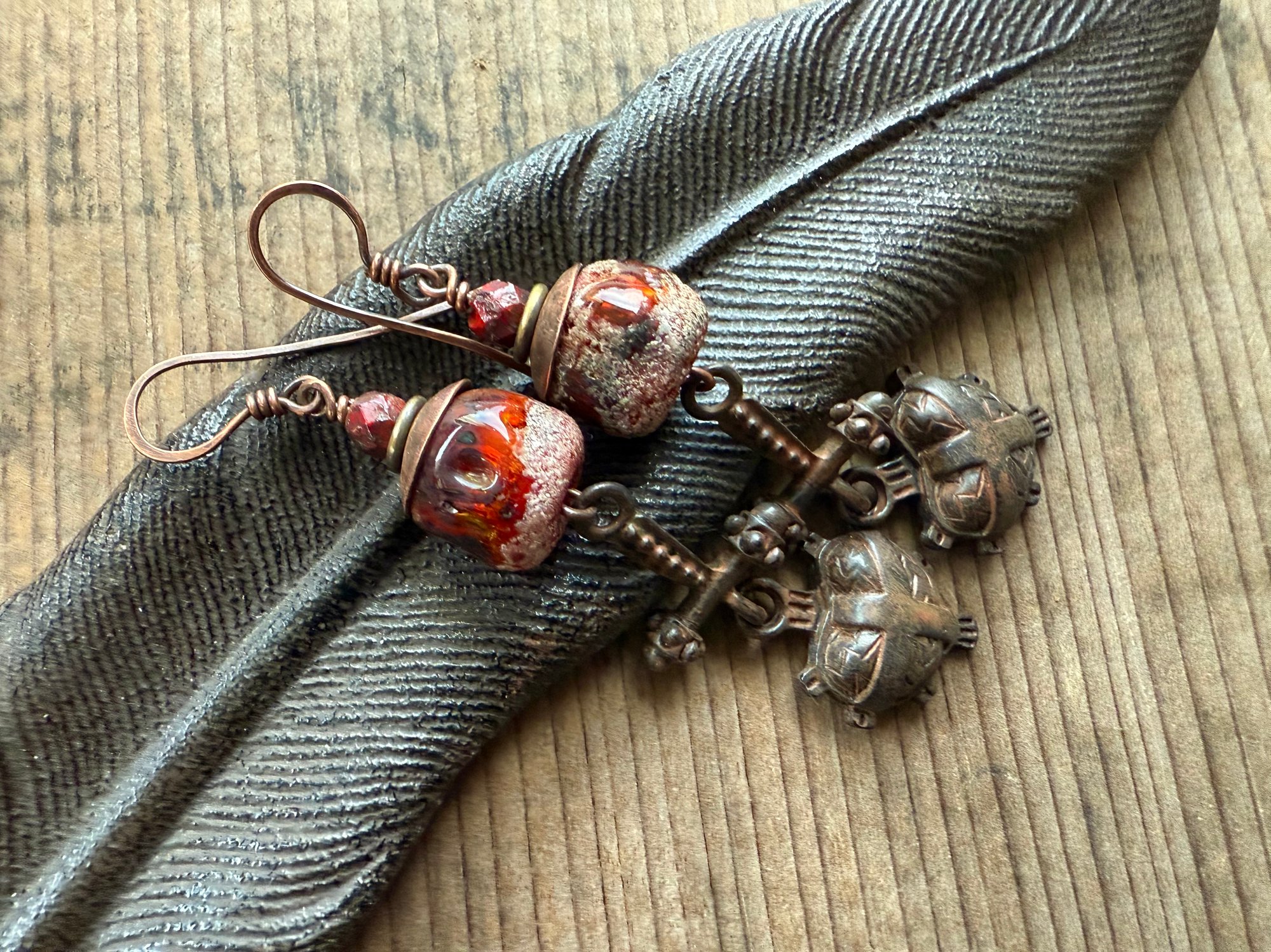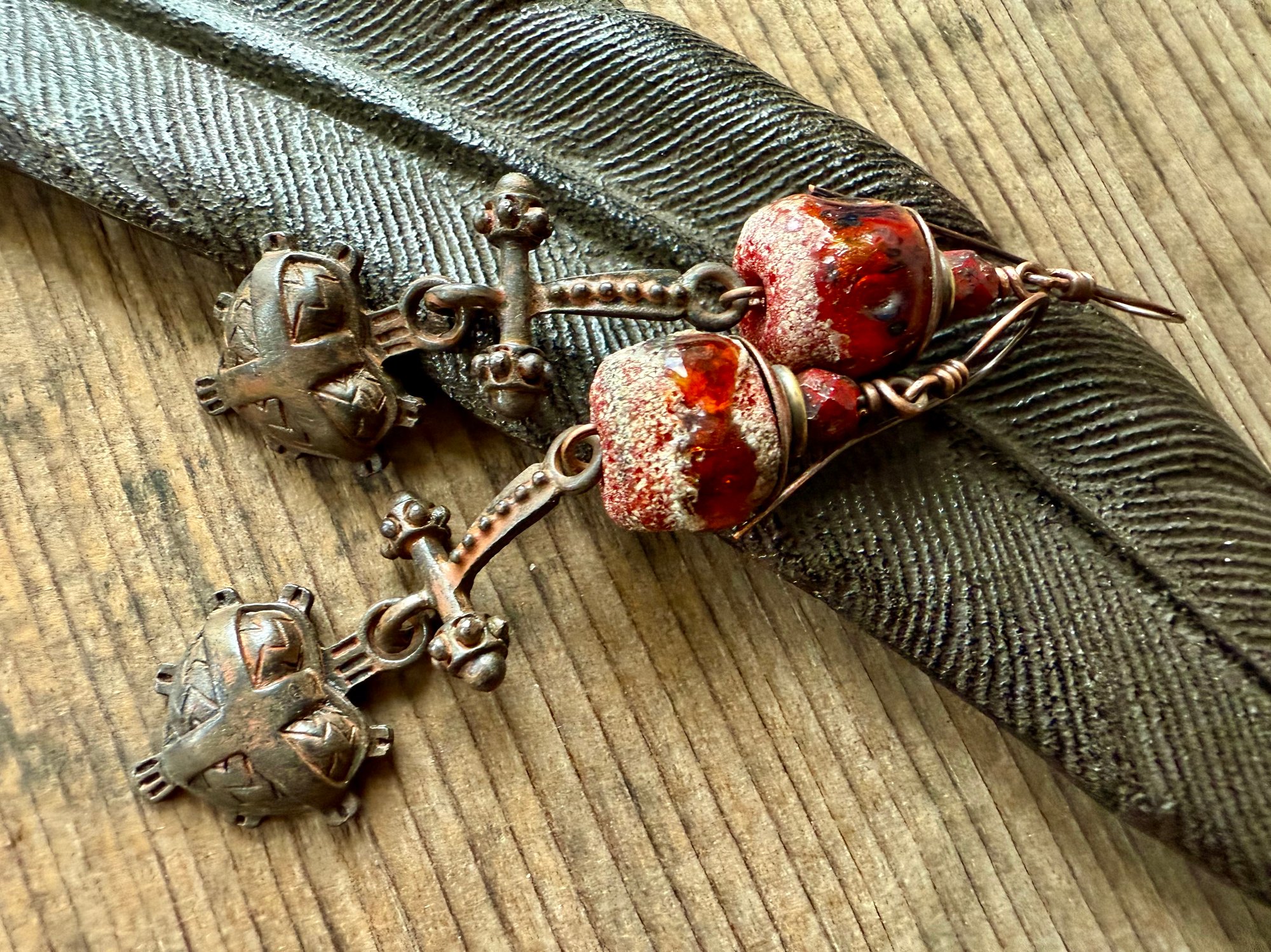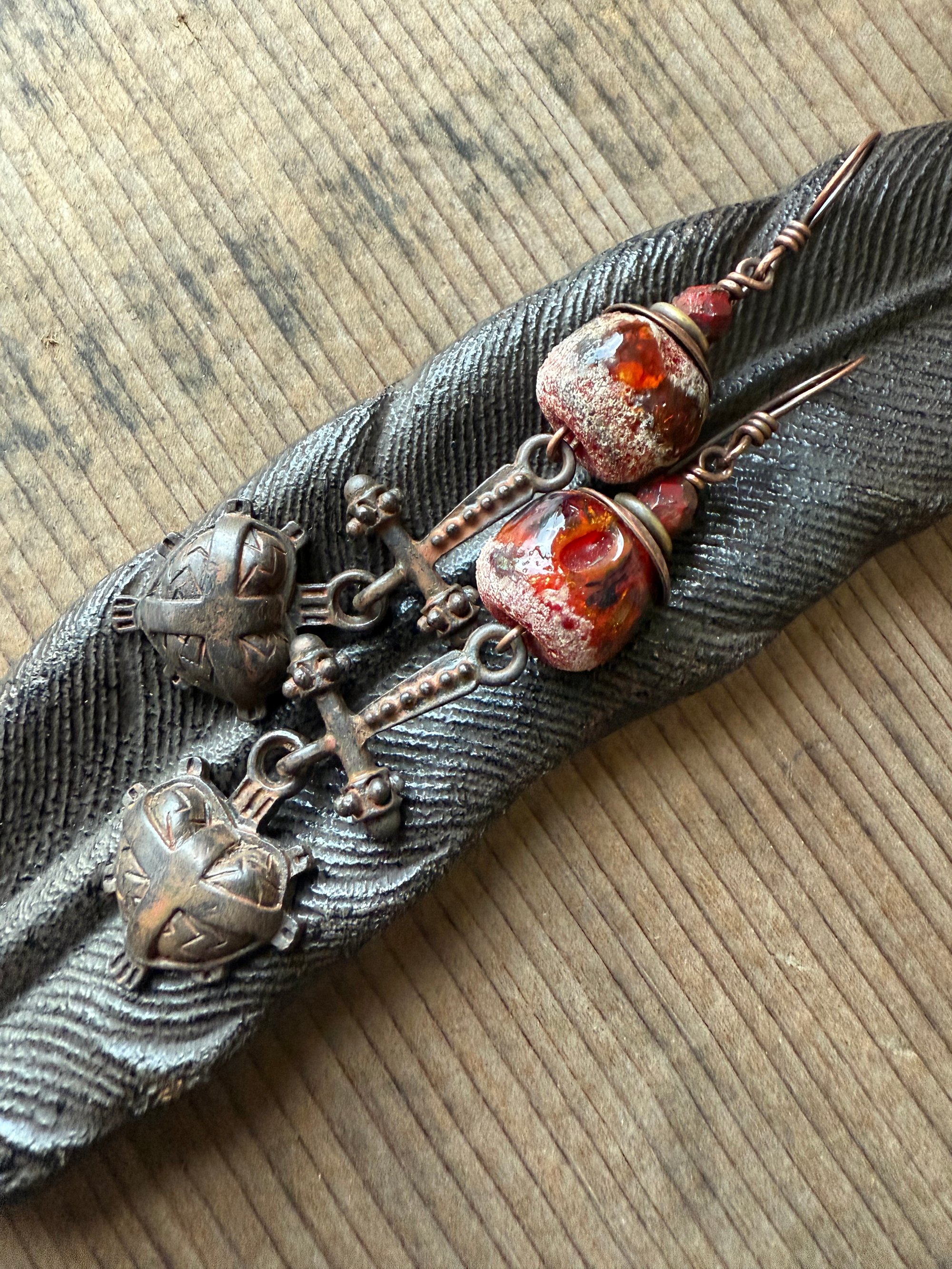 Rusty metal heart focal, an artisan lamp work in gorgeous earthy red shades paired with a Czech glass bead, solid copper bead cap and jump ring, wires and ear wires.