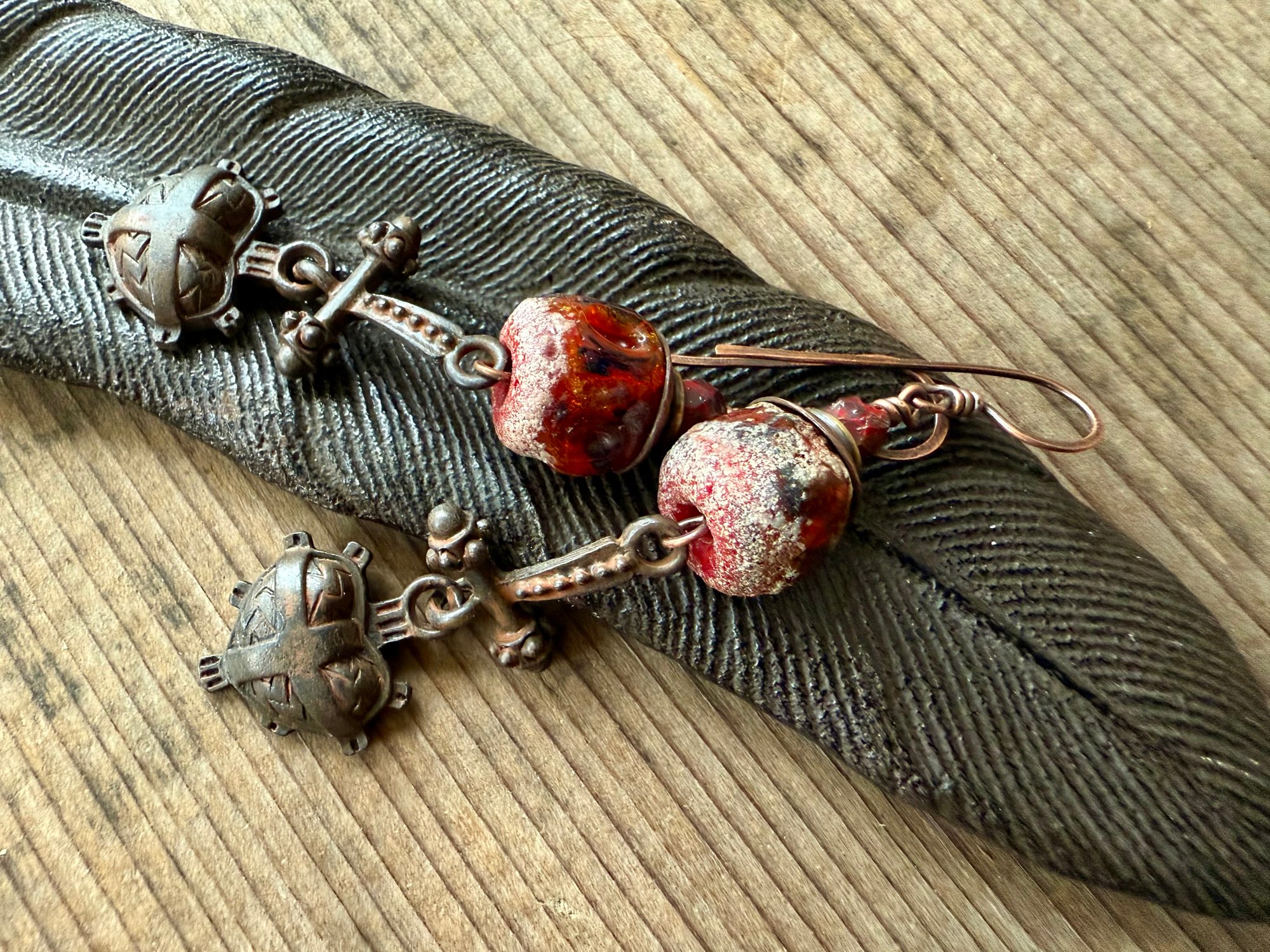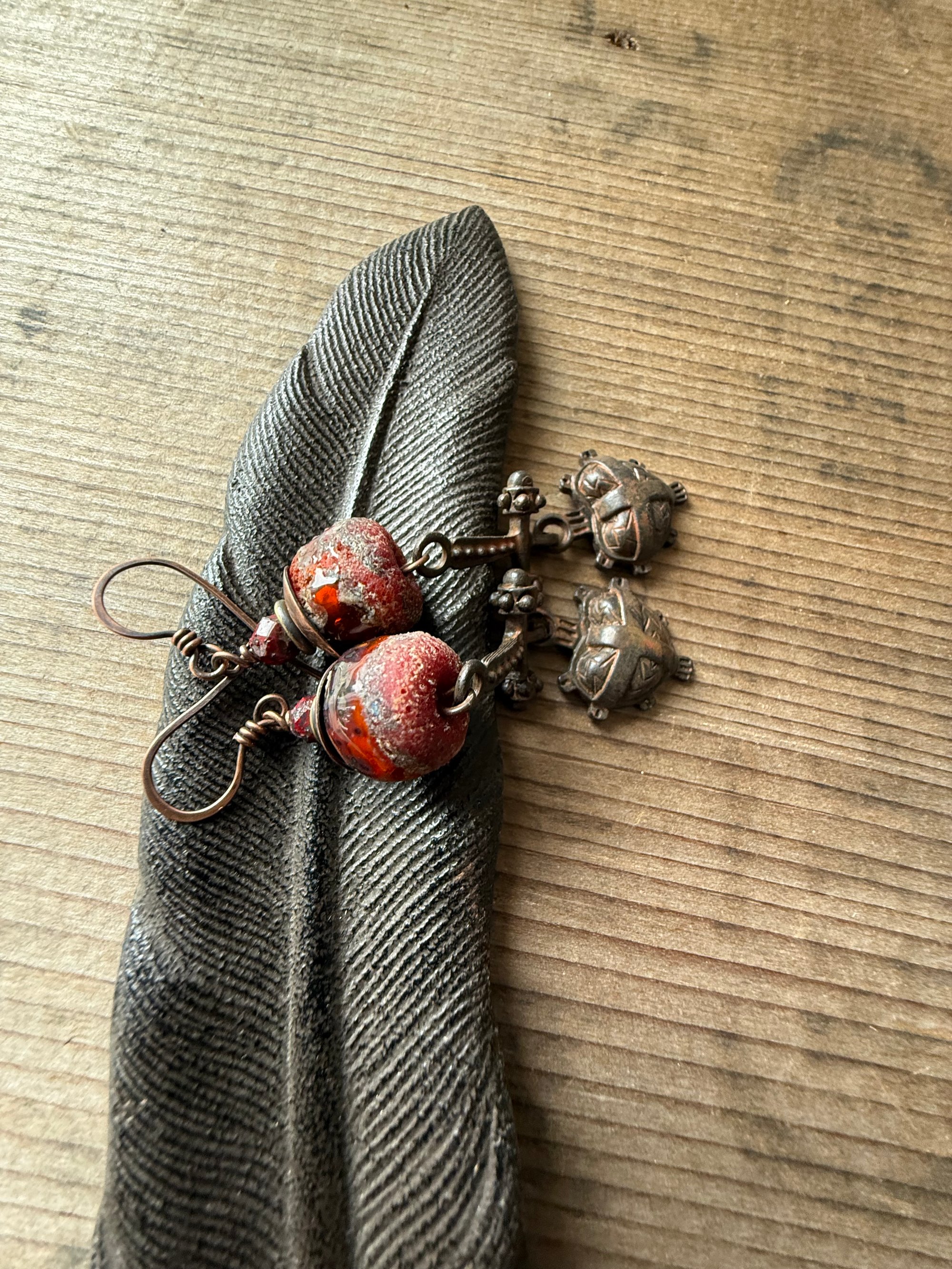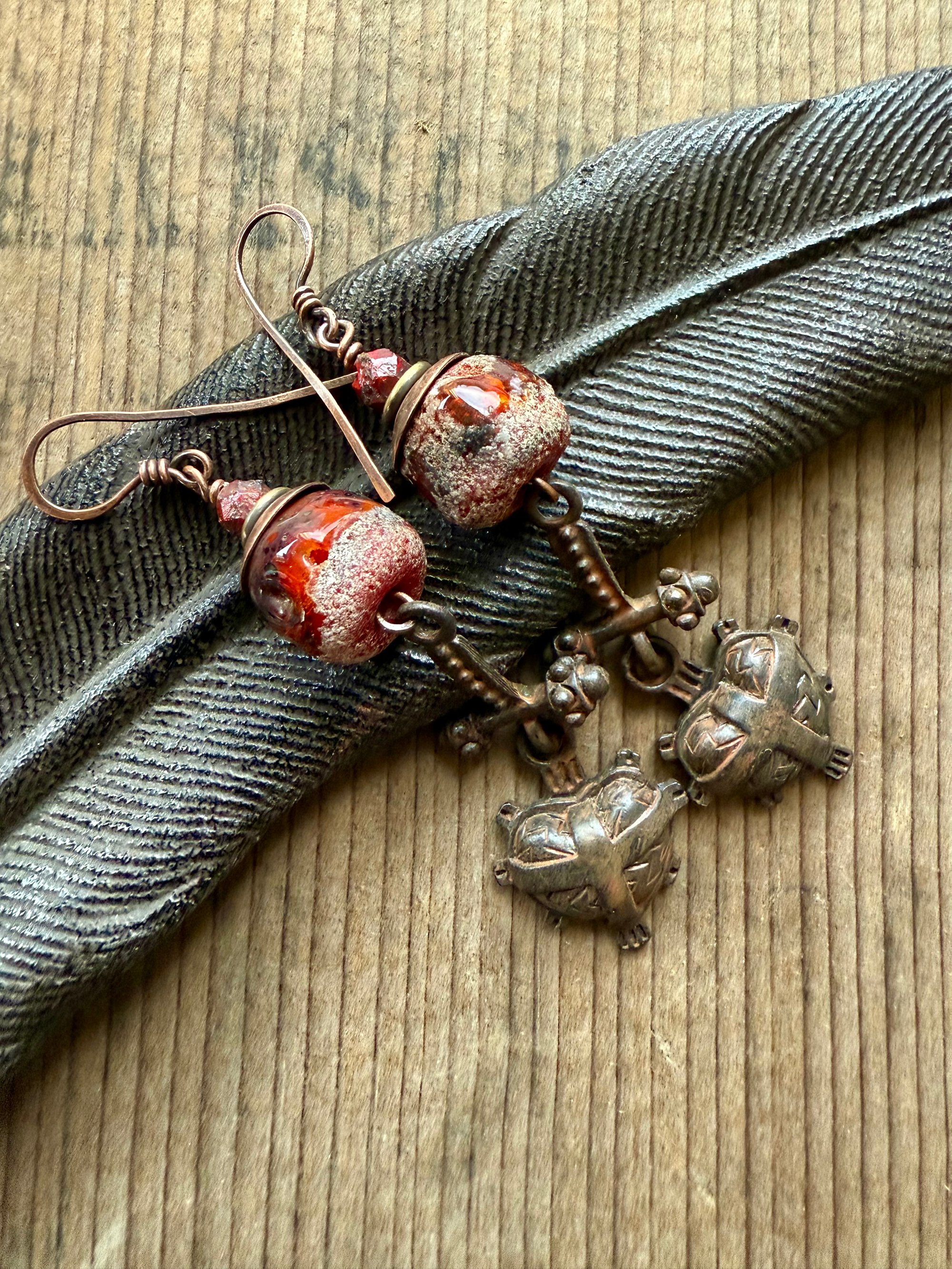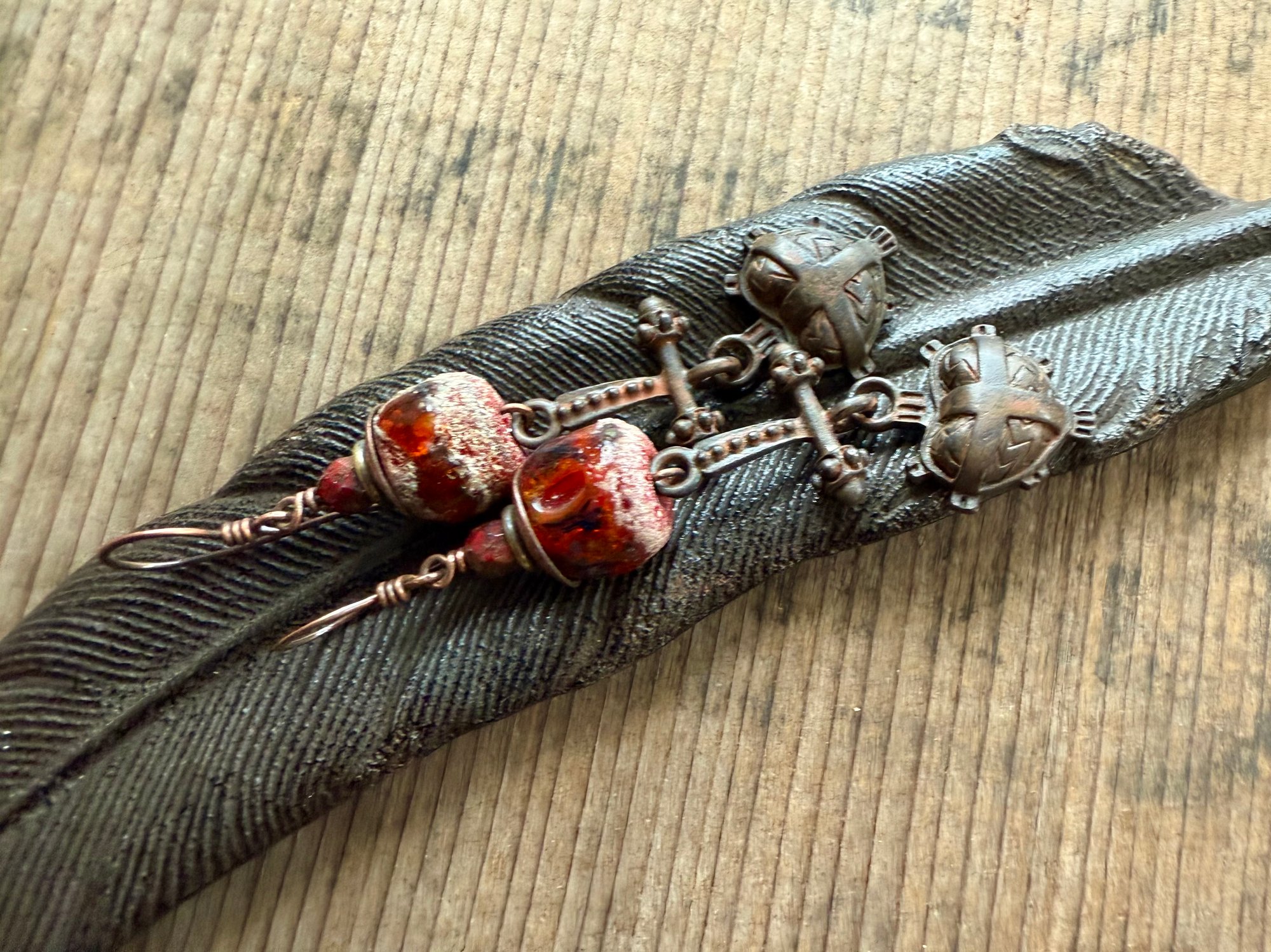 Rusty metal heart focal, an artisan lamp work in gorgeous earthy red shades paired with a Czech glass bead, solid copper bead cap and jump ring, wires and ear wires.