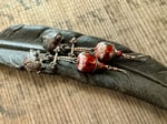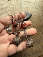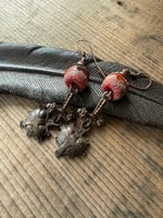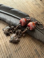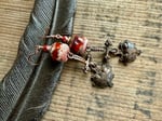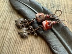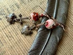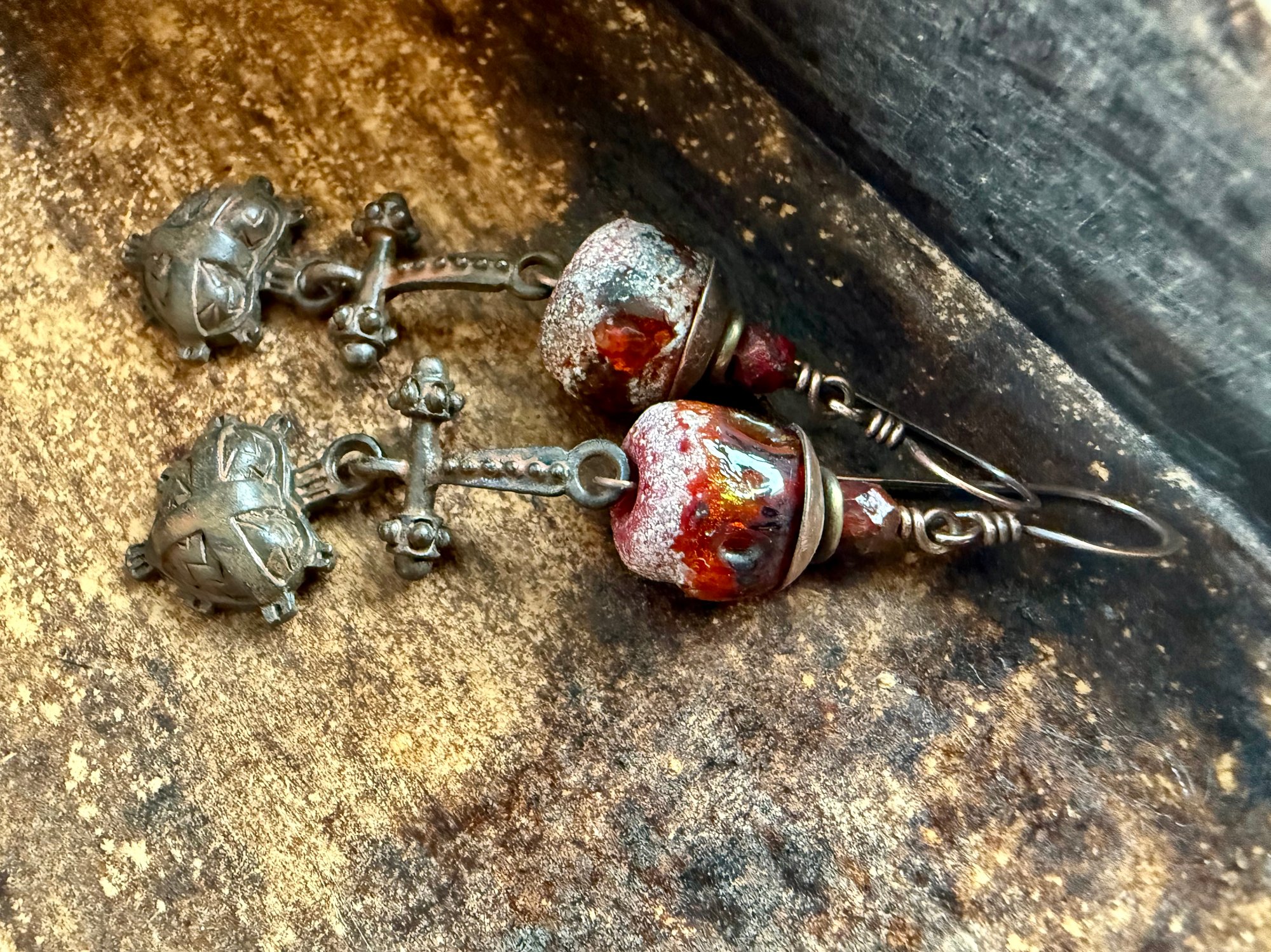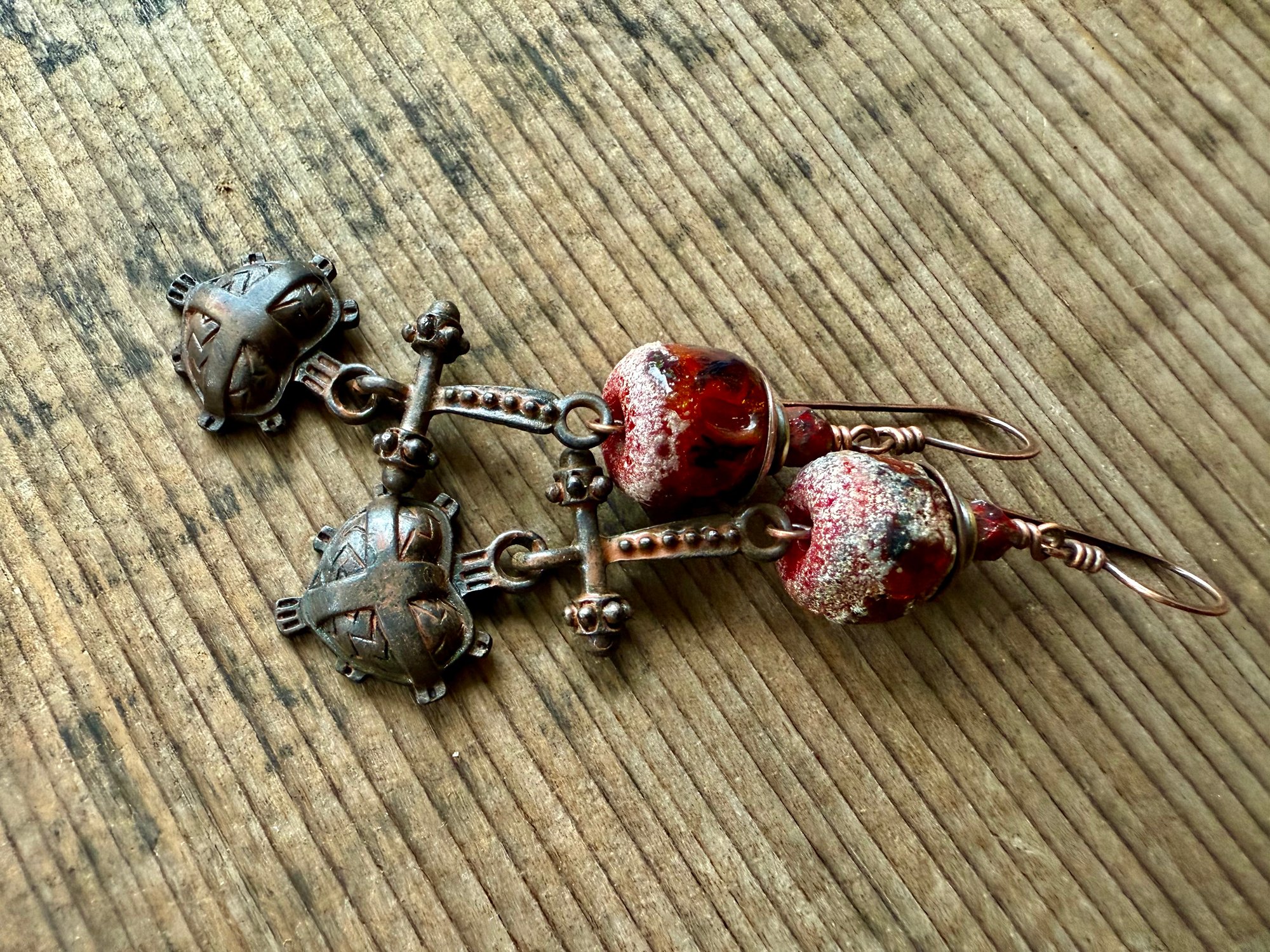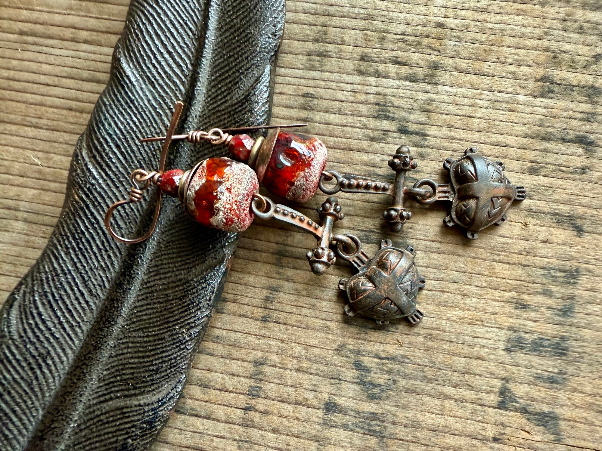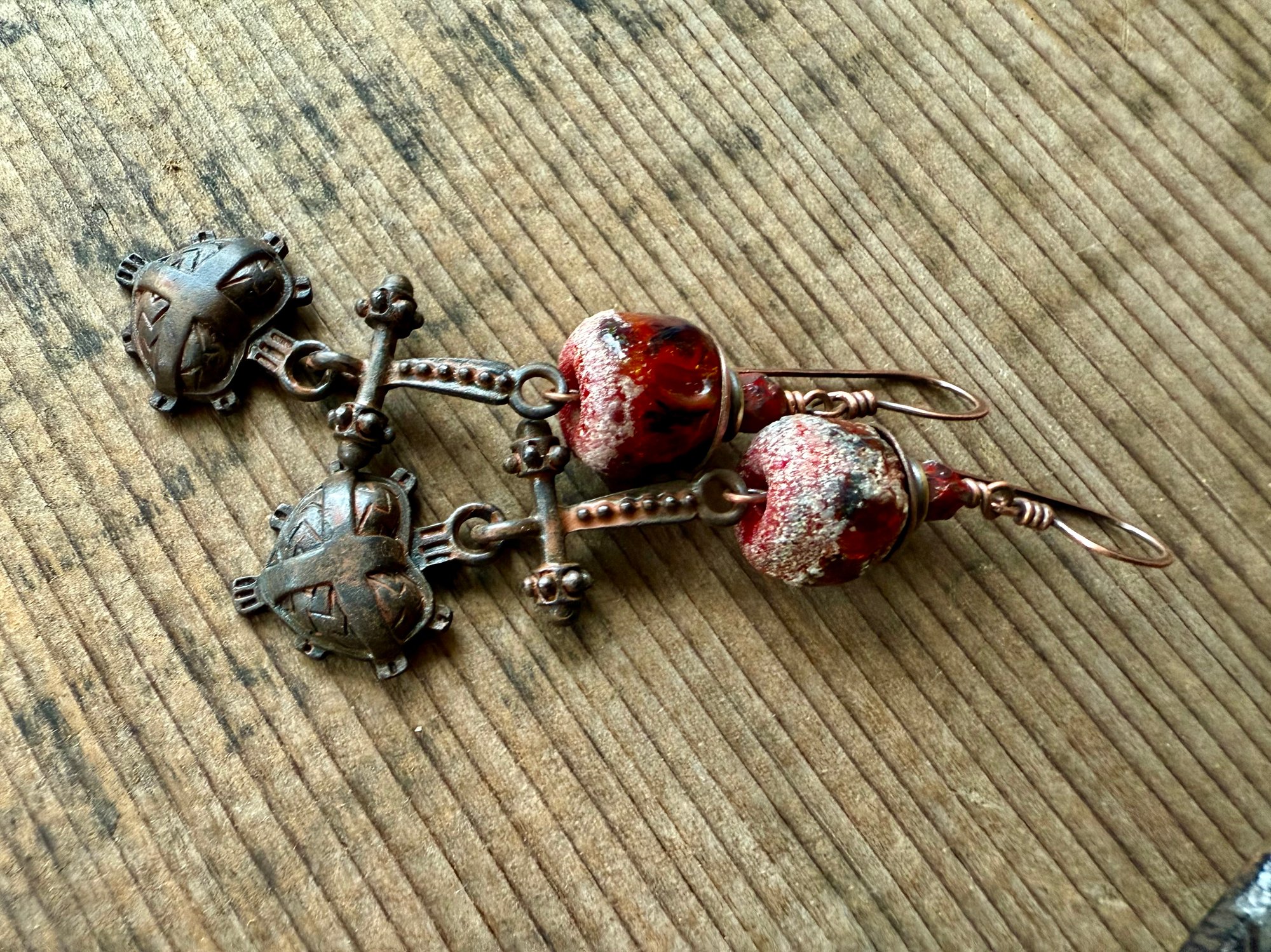Rusty metal heart focal, an artisan lamp work in gorgeous earthy red shades paired with a Czech glass bead, solid copper bead cap and jump ring, wires and ear wires.