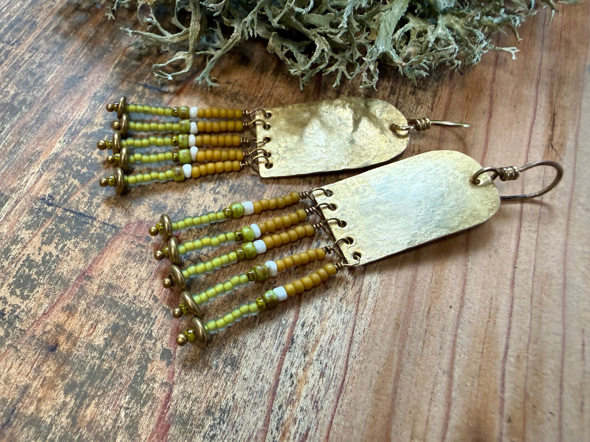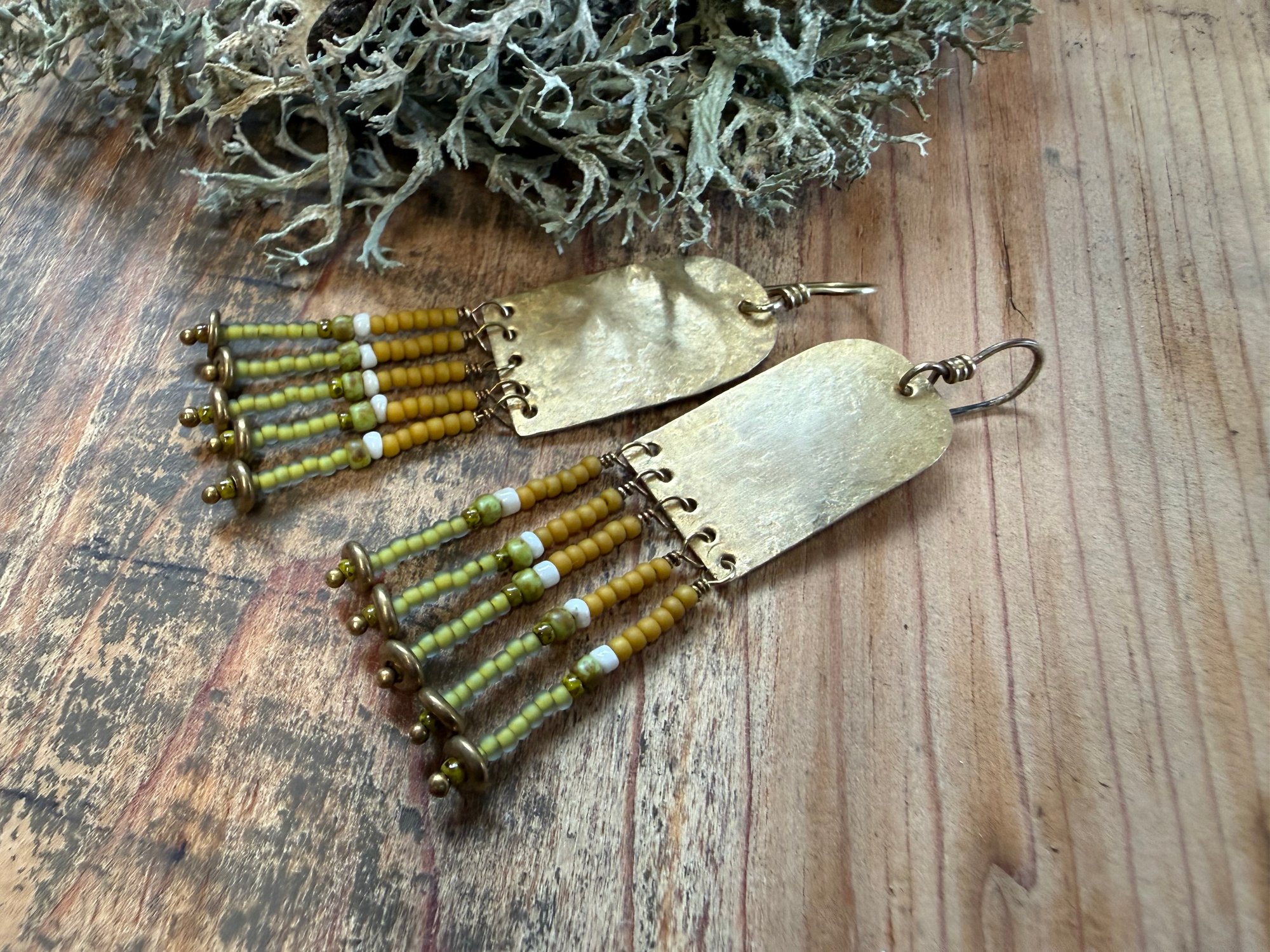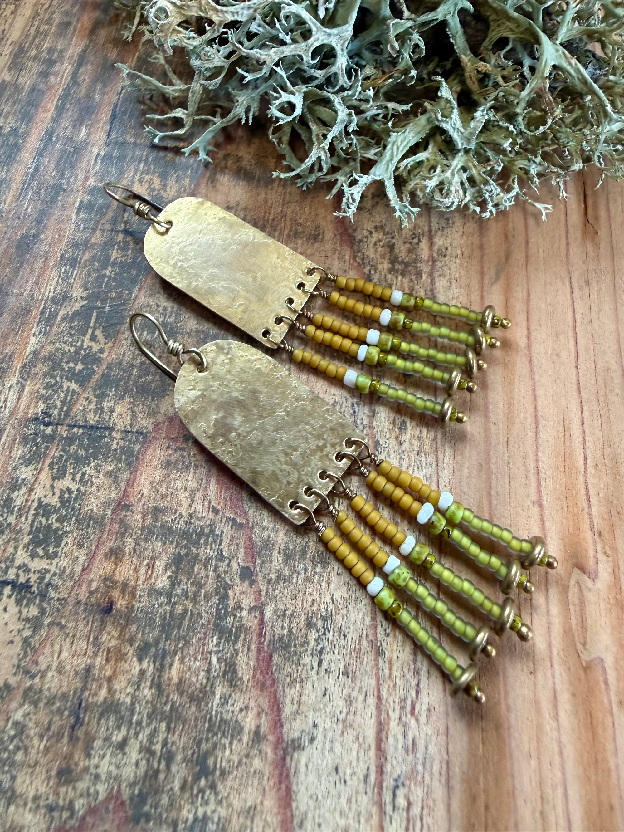 My handmade/ textured brass portals ornate with seed glass beads in green, yellow and natural color plus solid brass spacers. Finished with brass ear wires.