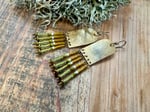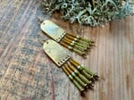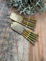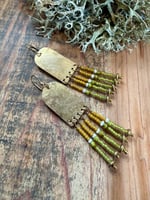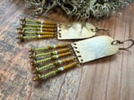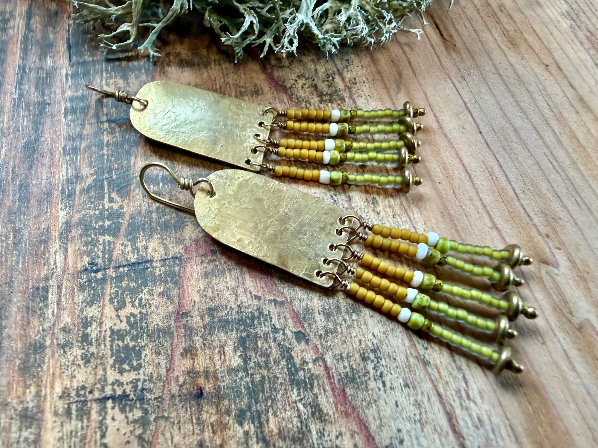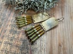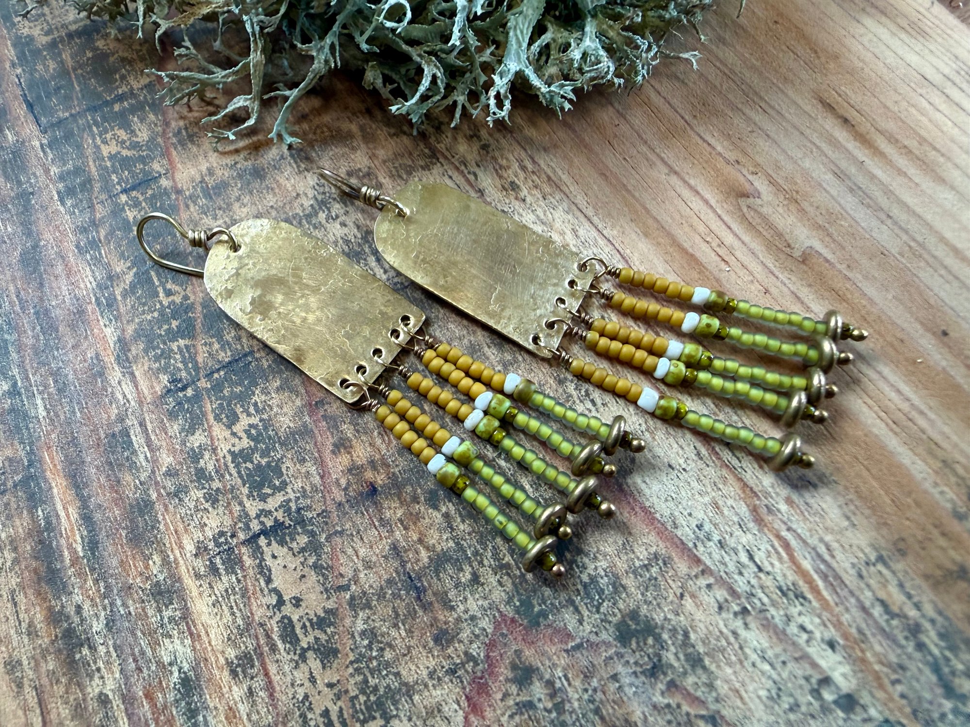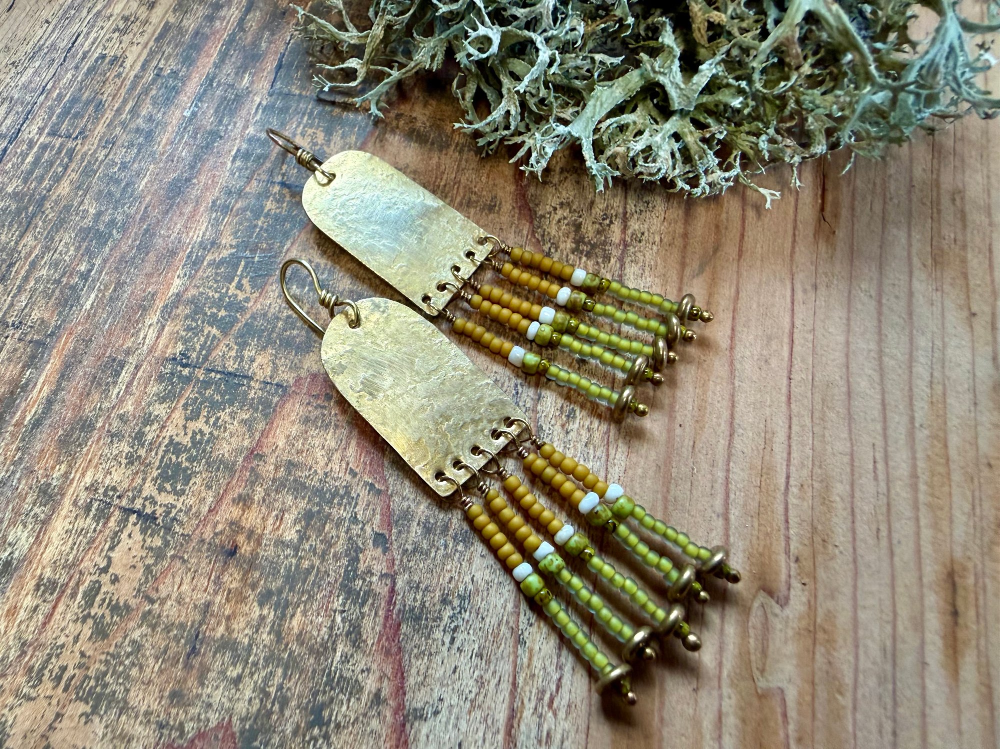 My handmade/ textured brass portals ornate with seed glass beads in green, yellow and natural color plus solid brass spacers. Finished with brass ear wires.