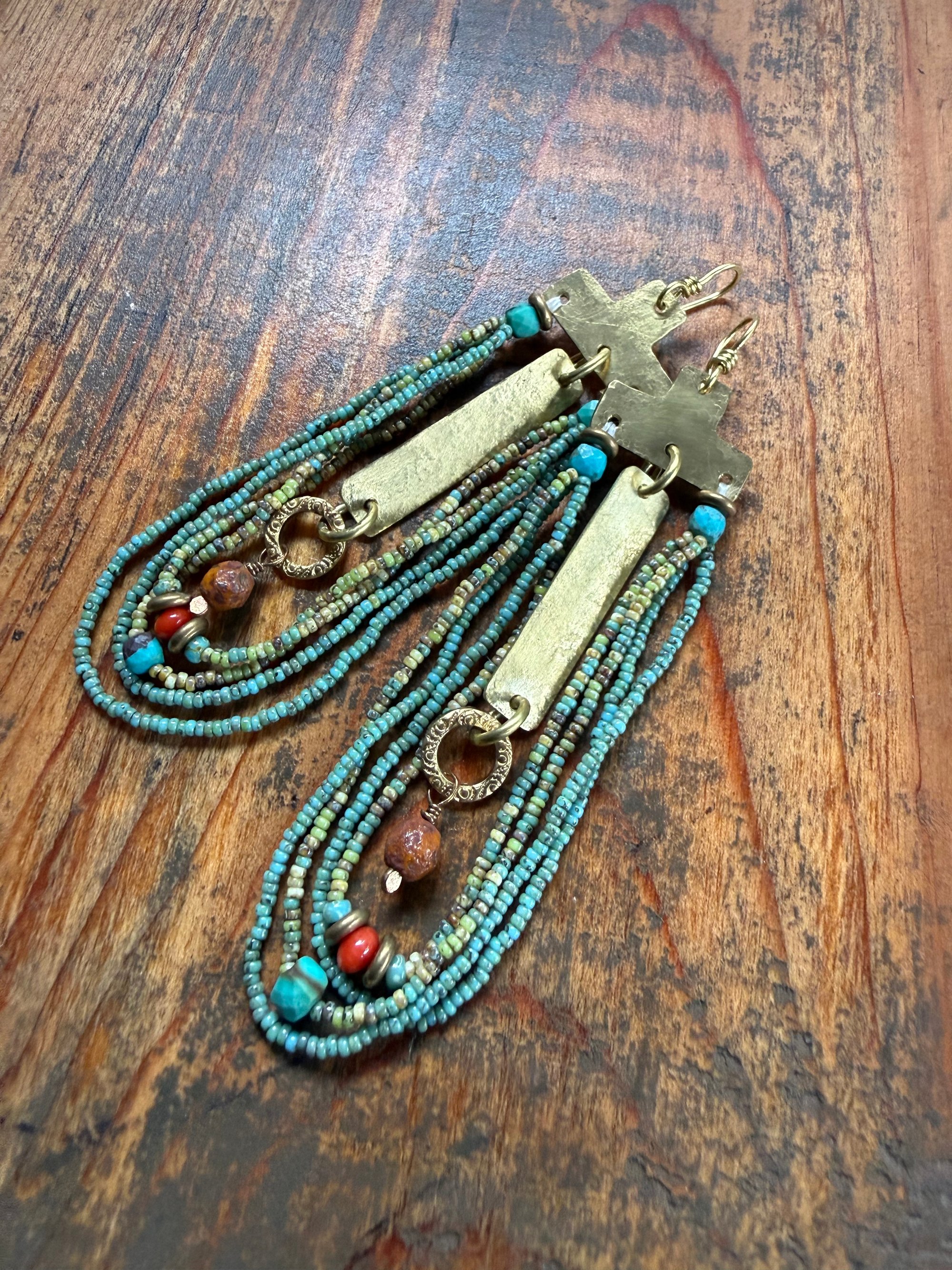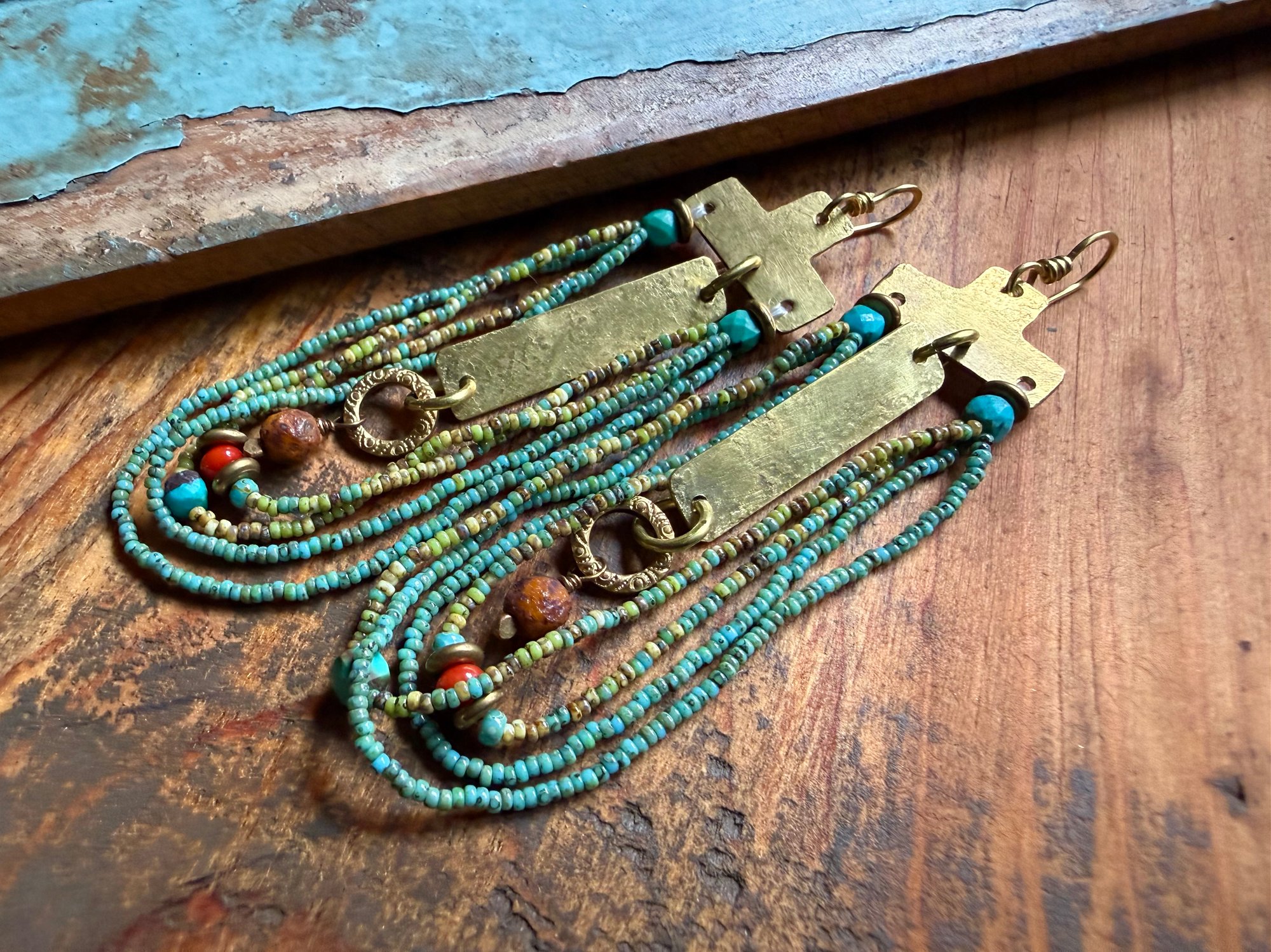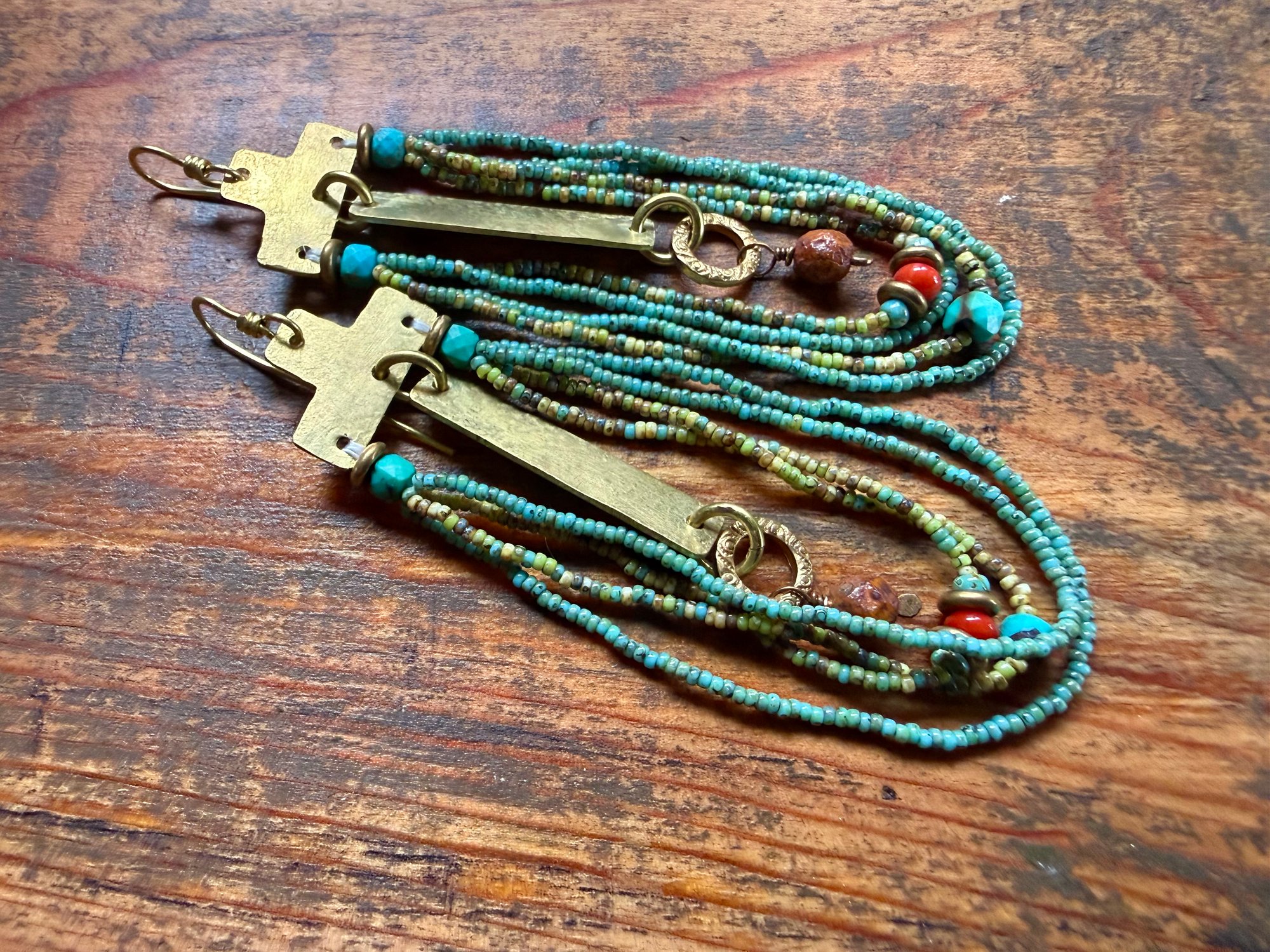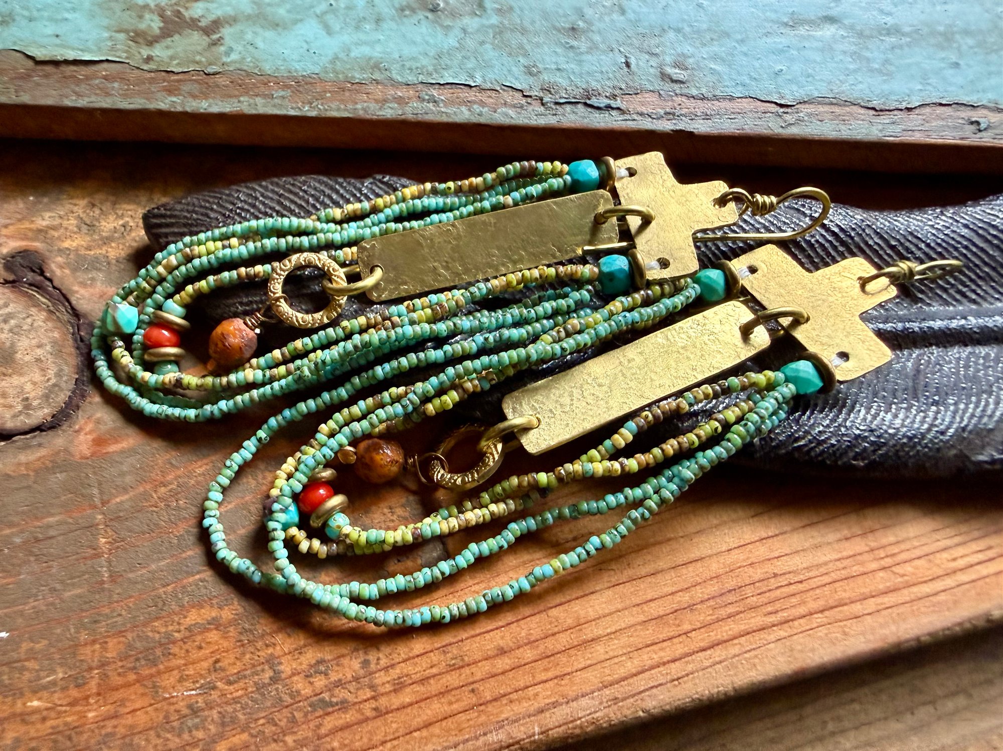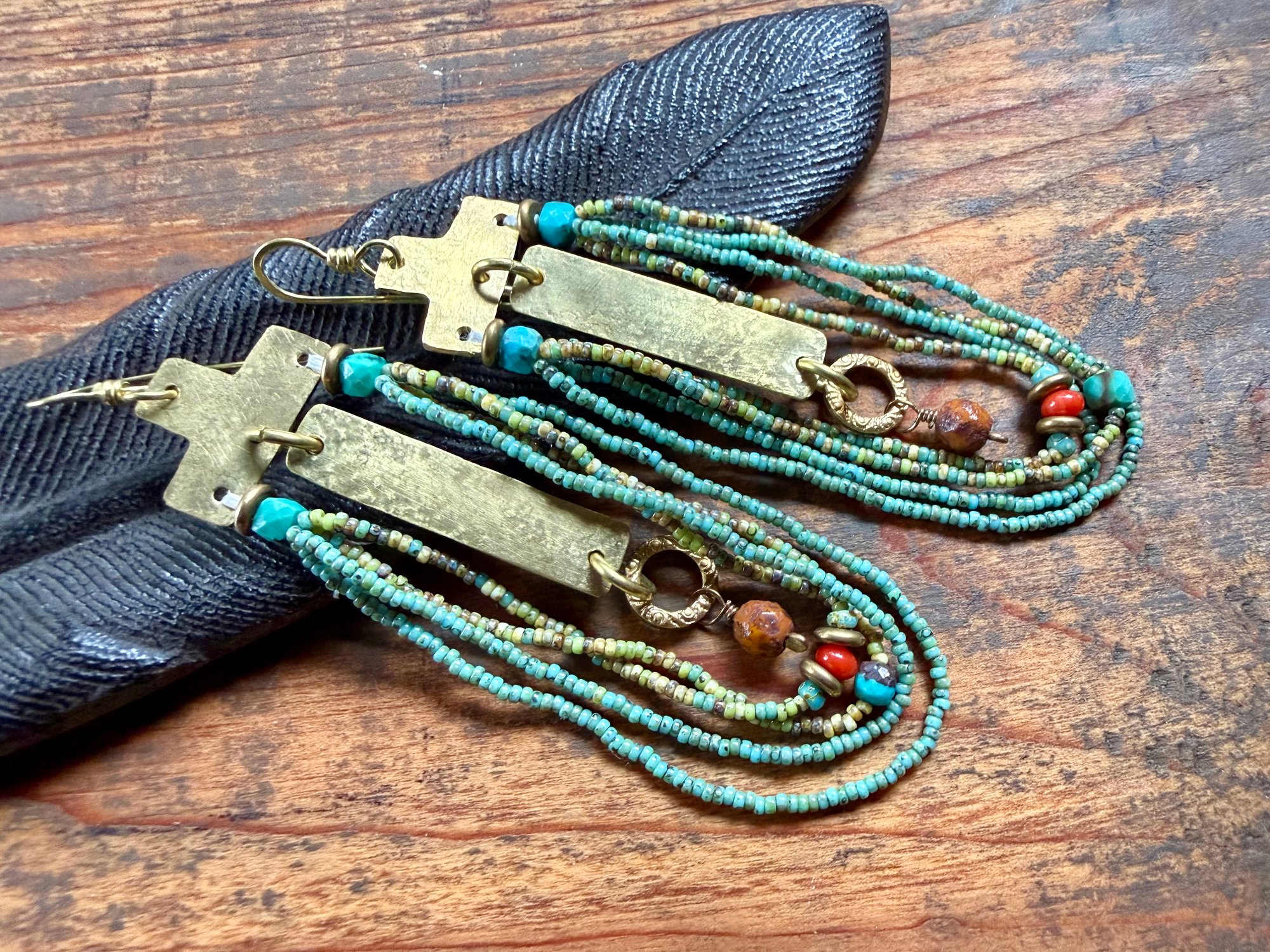 Brass elements were handmade by me.. cutting, texturing, polishing.. and then ornate with Picasso seed beads, Coral, Czech glass and brass spacers.