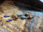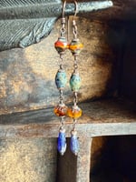 A vertical garland of Czech glass beads wrapped in copper. Each bead embraced by delicate solid copper bead caps. Copper ear wires.