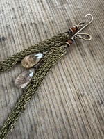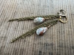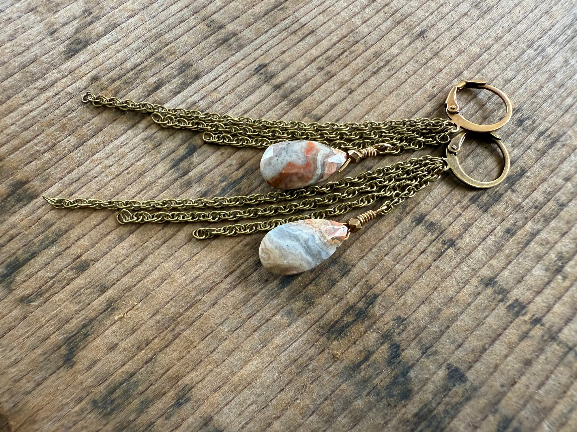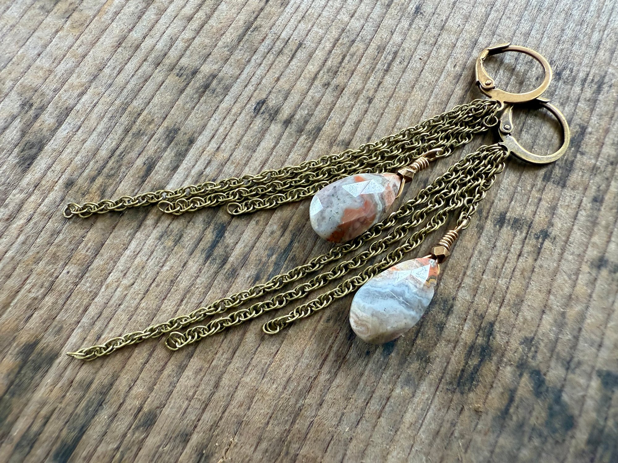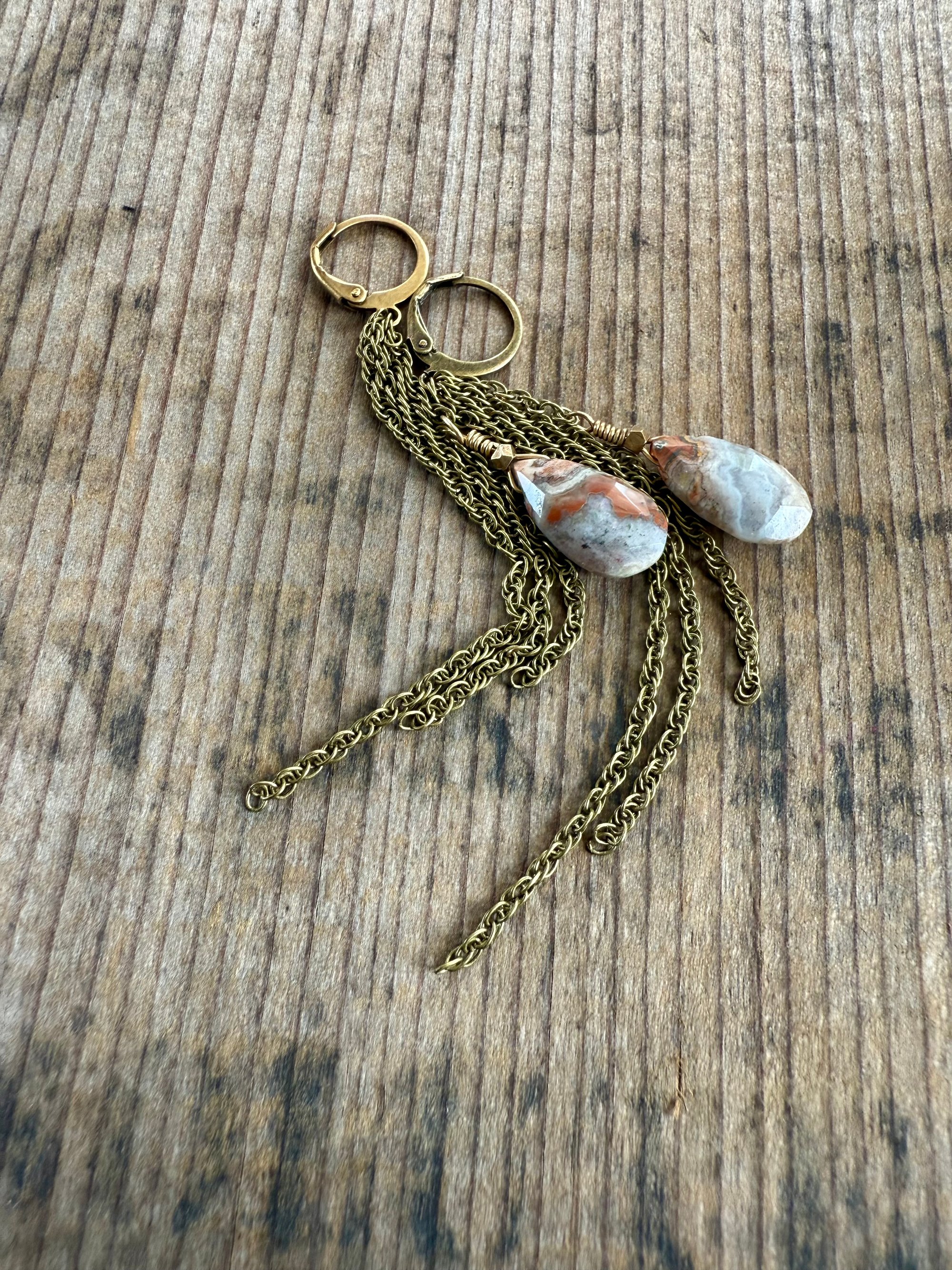 A earthy Agate drop stone dangles among sections of antique brass chain hold at the to by antique lever back ear wires.