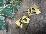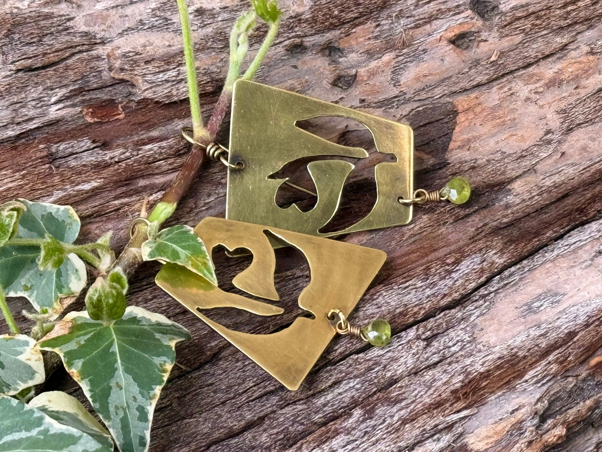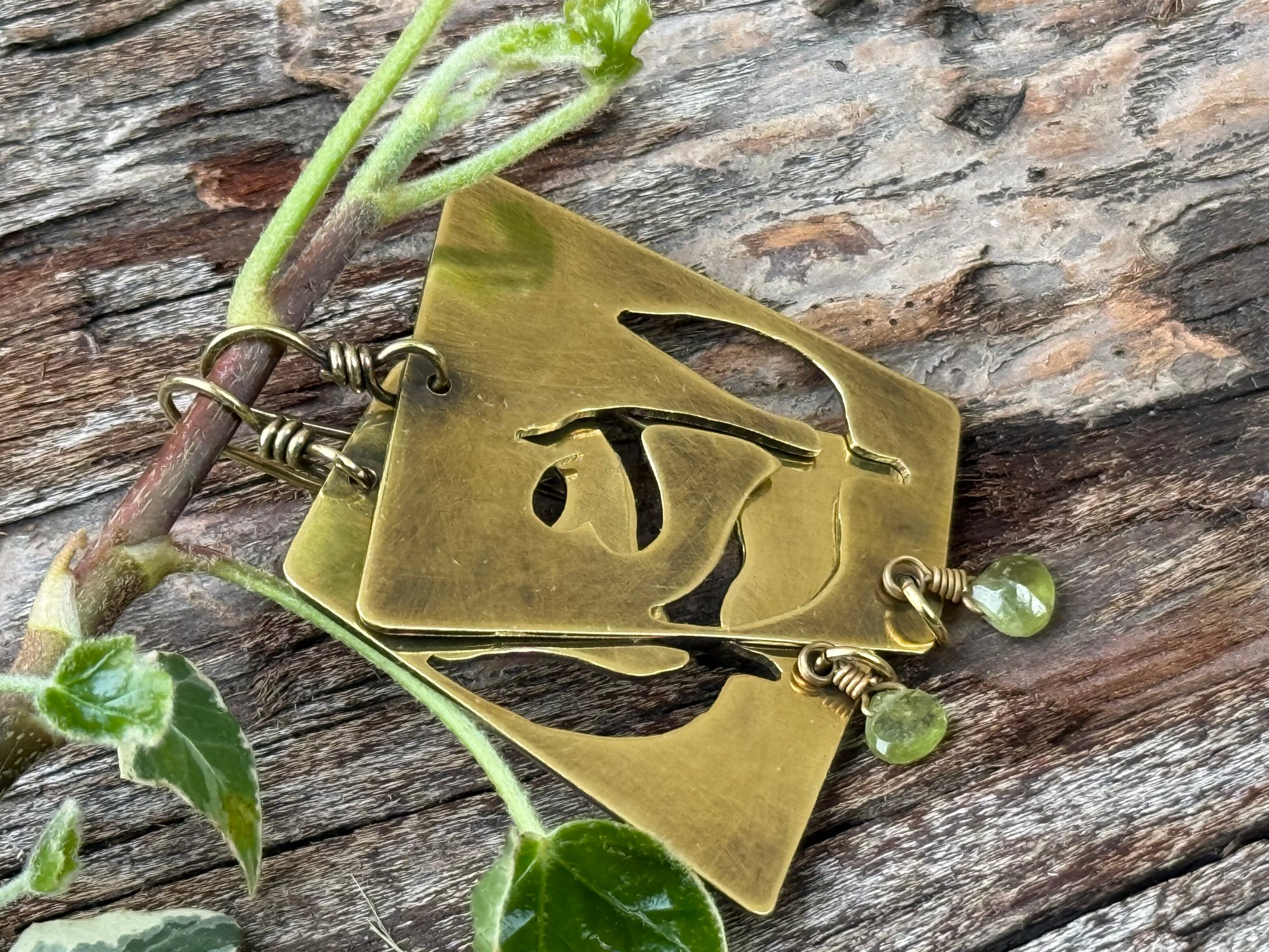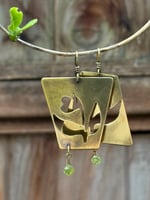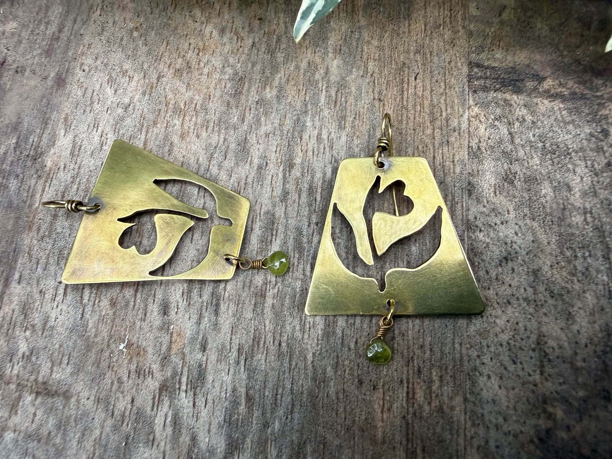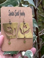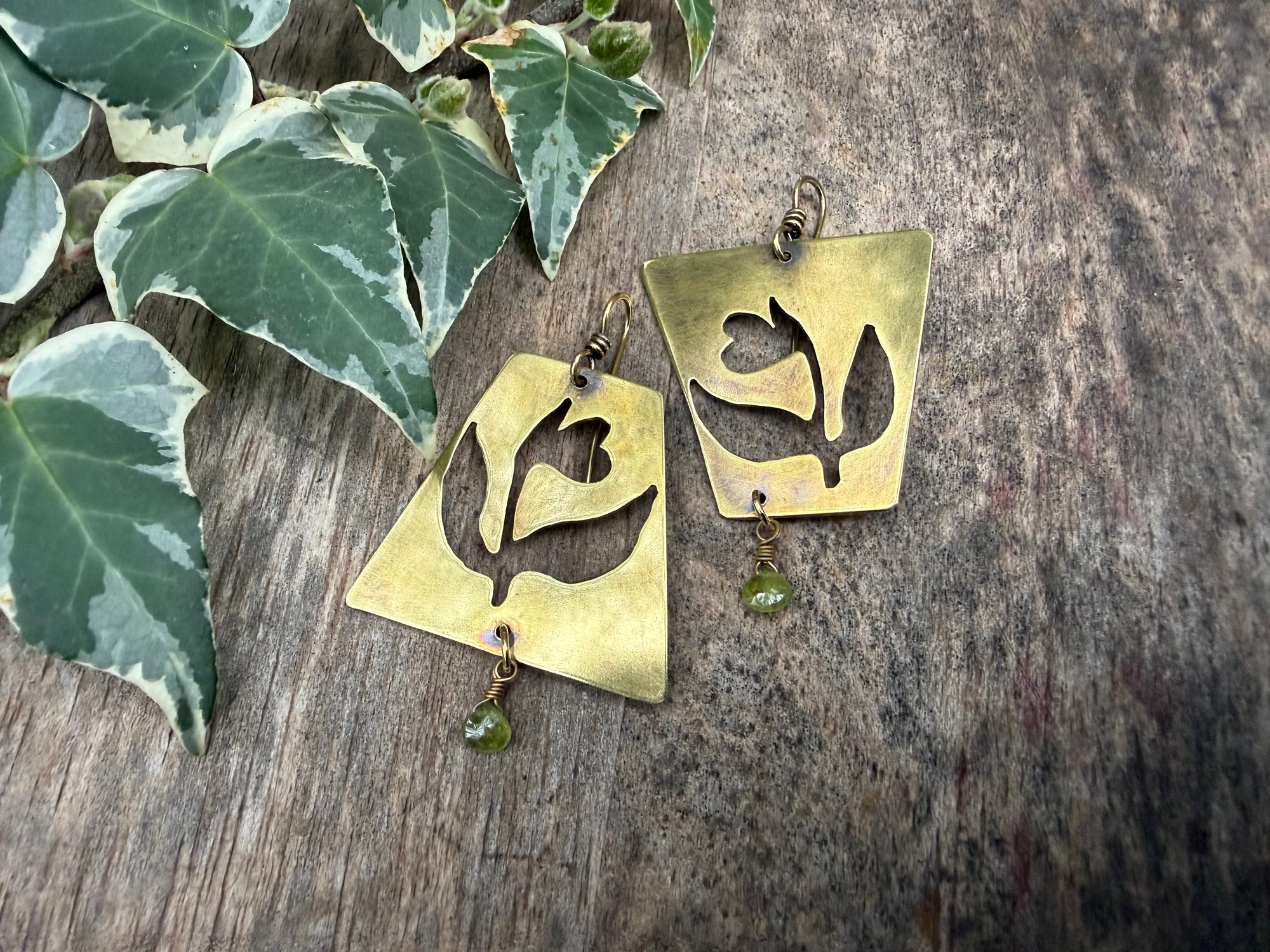I hand cut off the flower from a brass sheet that has a vase shape, ornate with a faceted Hessonite Garnet. Finished with brass ear wires. Tumbled a bit for shine preservation.