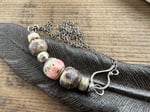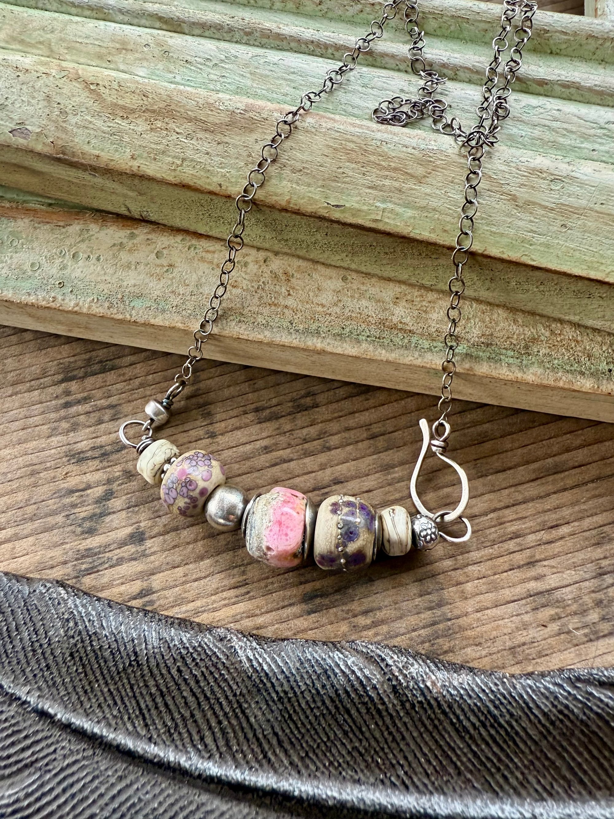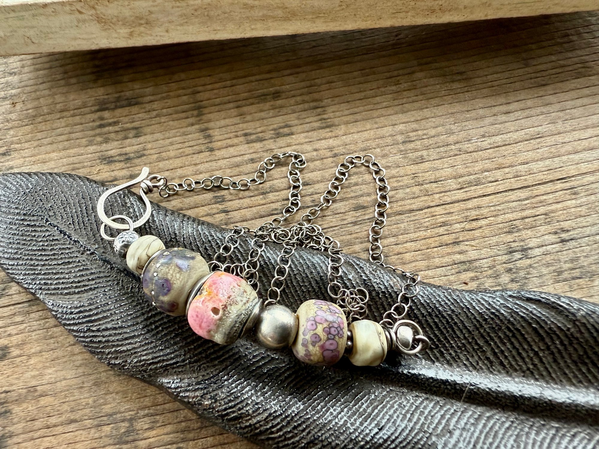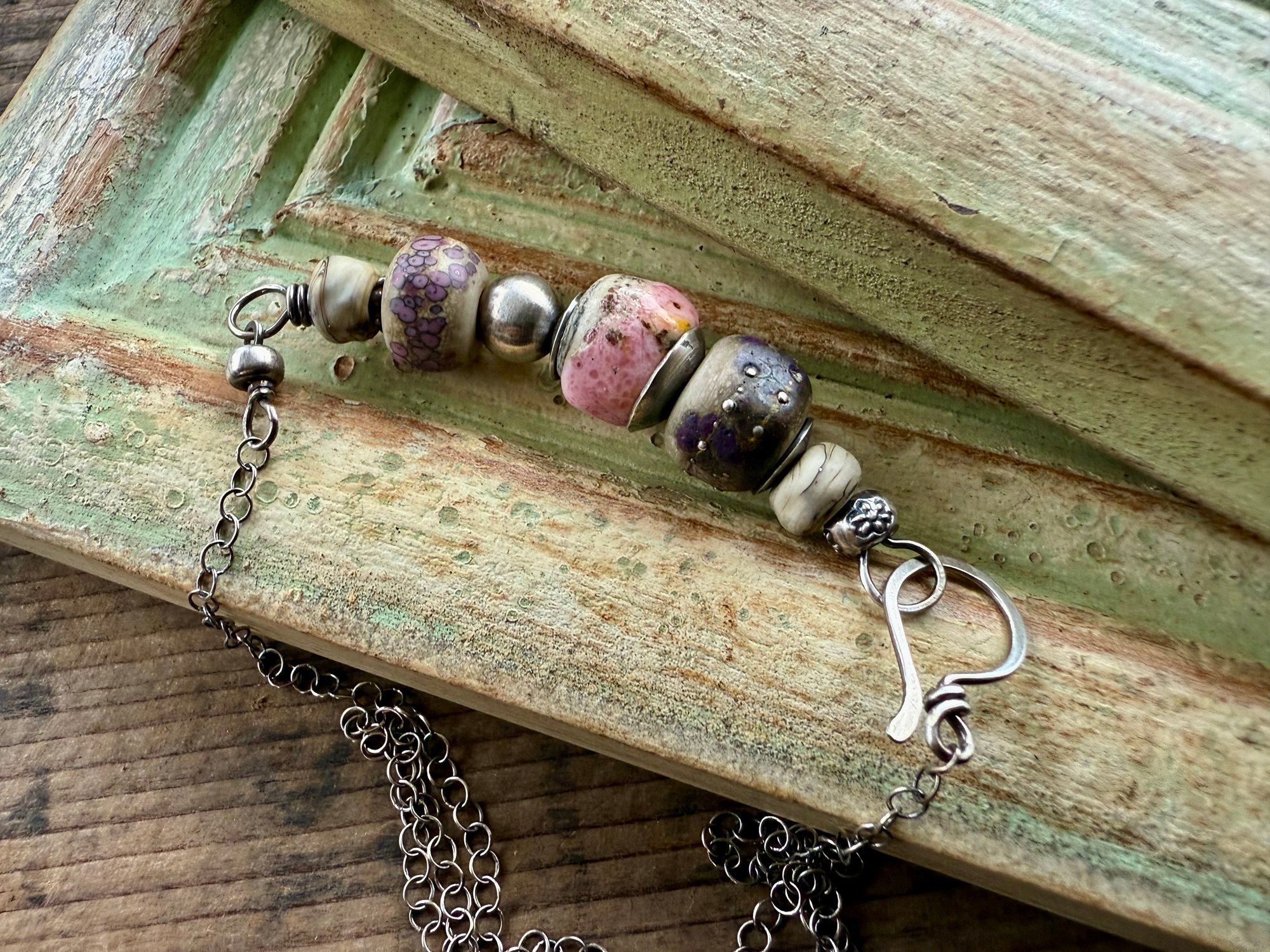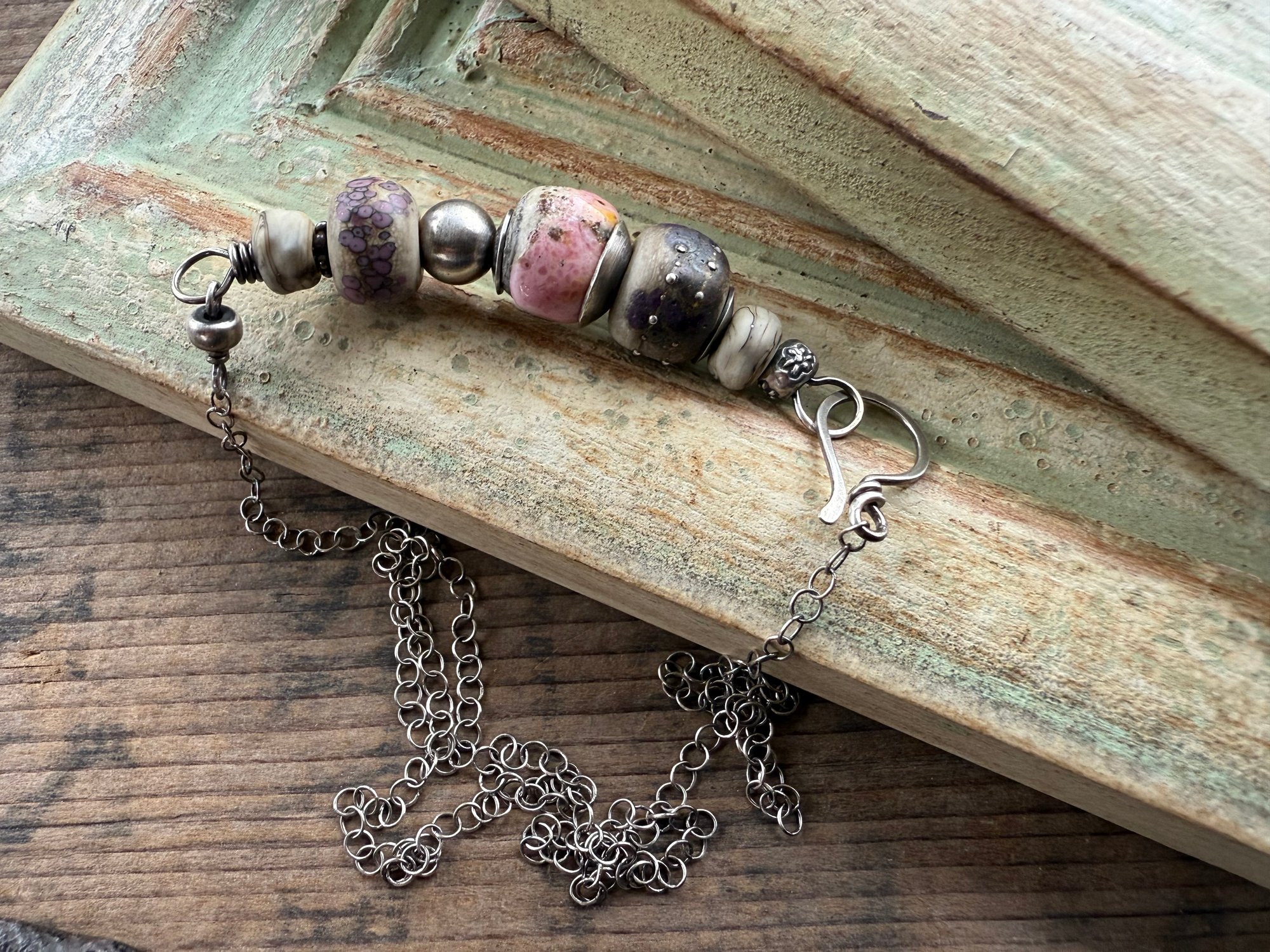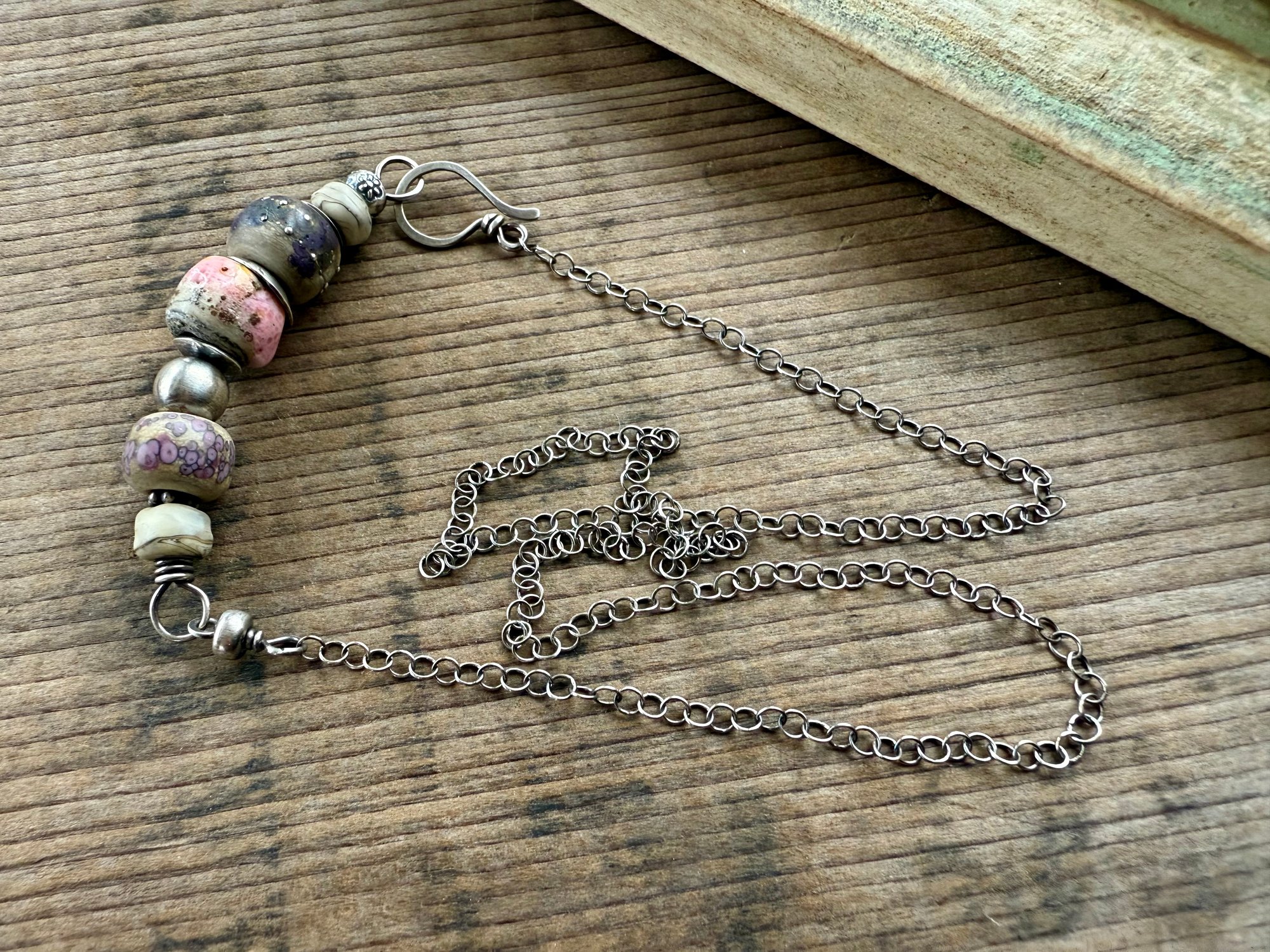 Artisan lamp work beads in earthy hues in this rustic sterling silver construction. Some sterling silver seed beads, a Karen Hill Tribe sterling silver bead, sections of solid sterling silver chain, my own handmade findings.