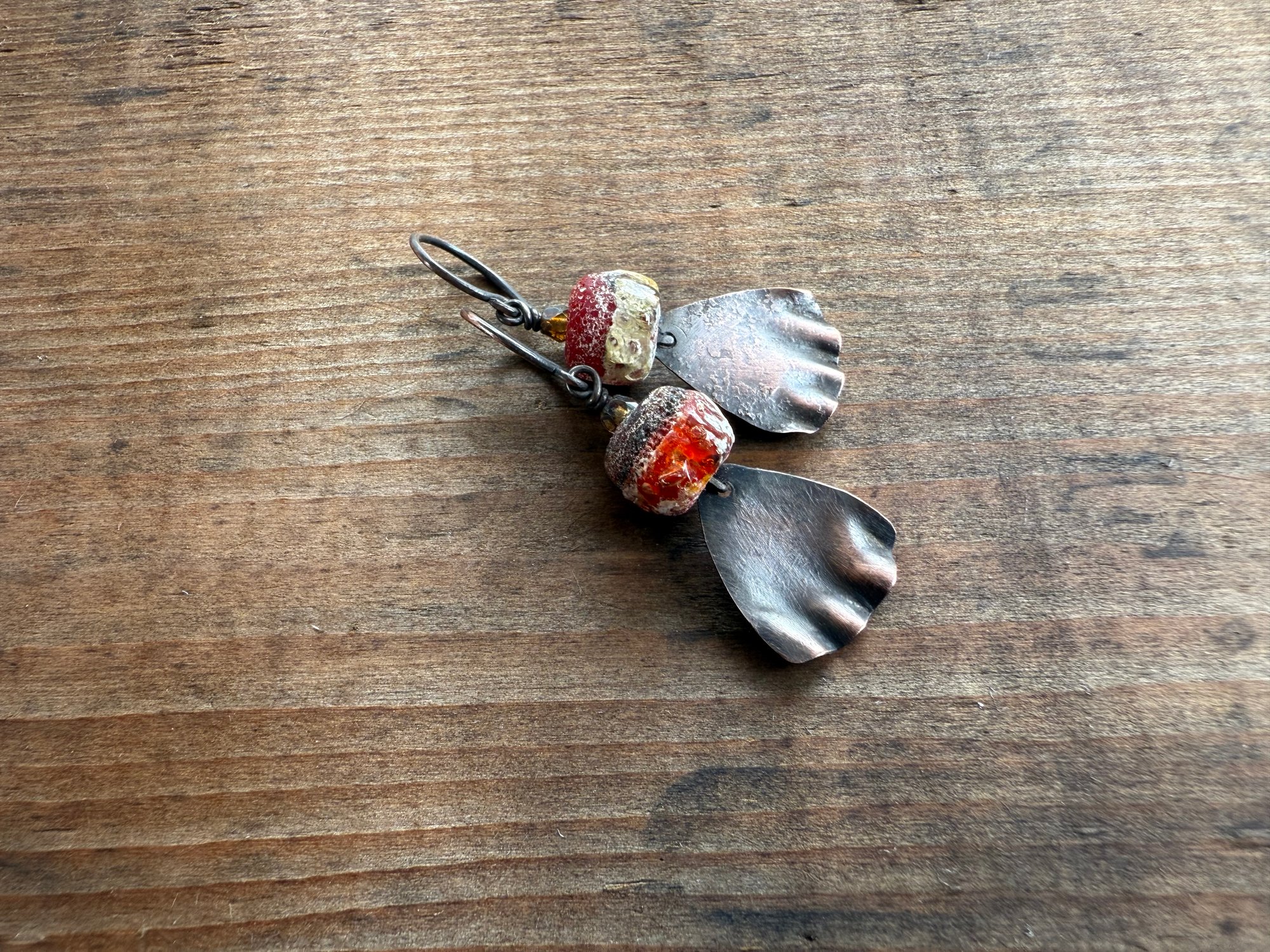 A n artisan lamp work in red holds a copper focal handmade by me. 18 gauge ear wires suspend them.