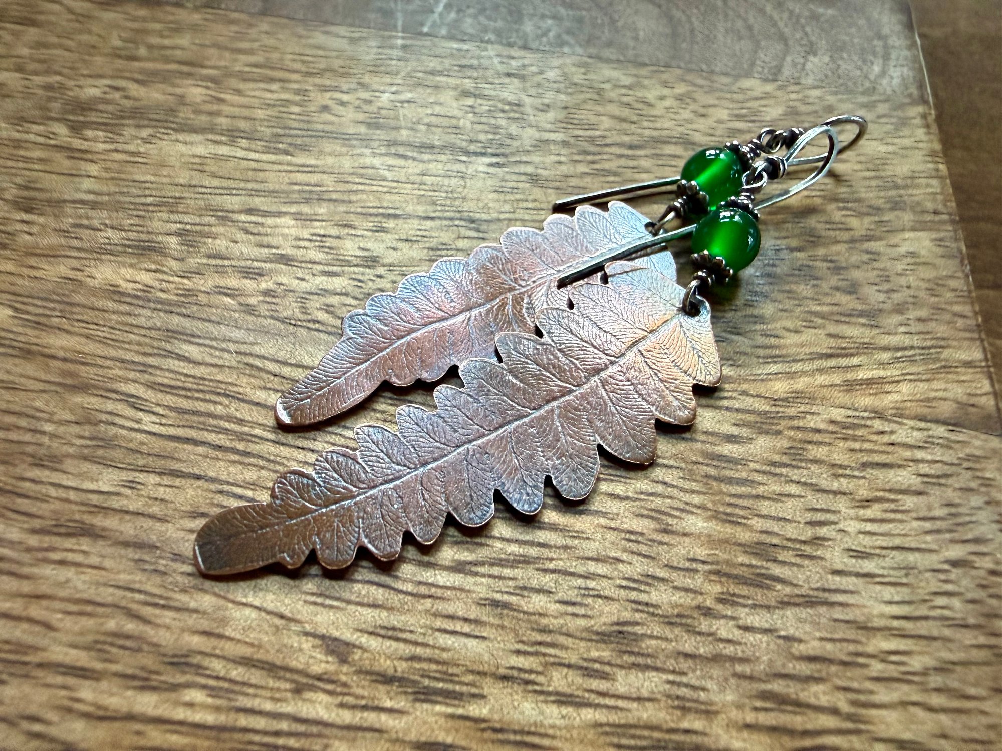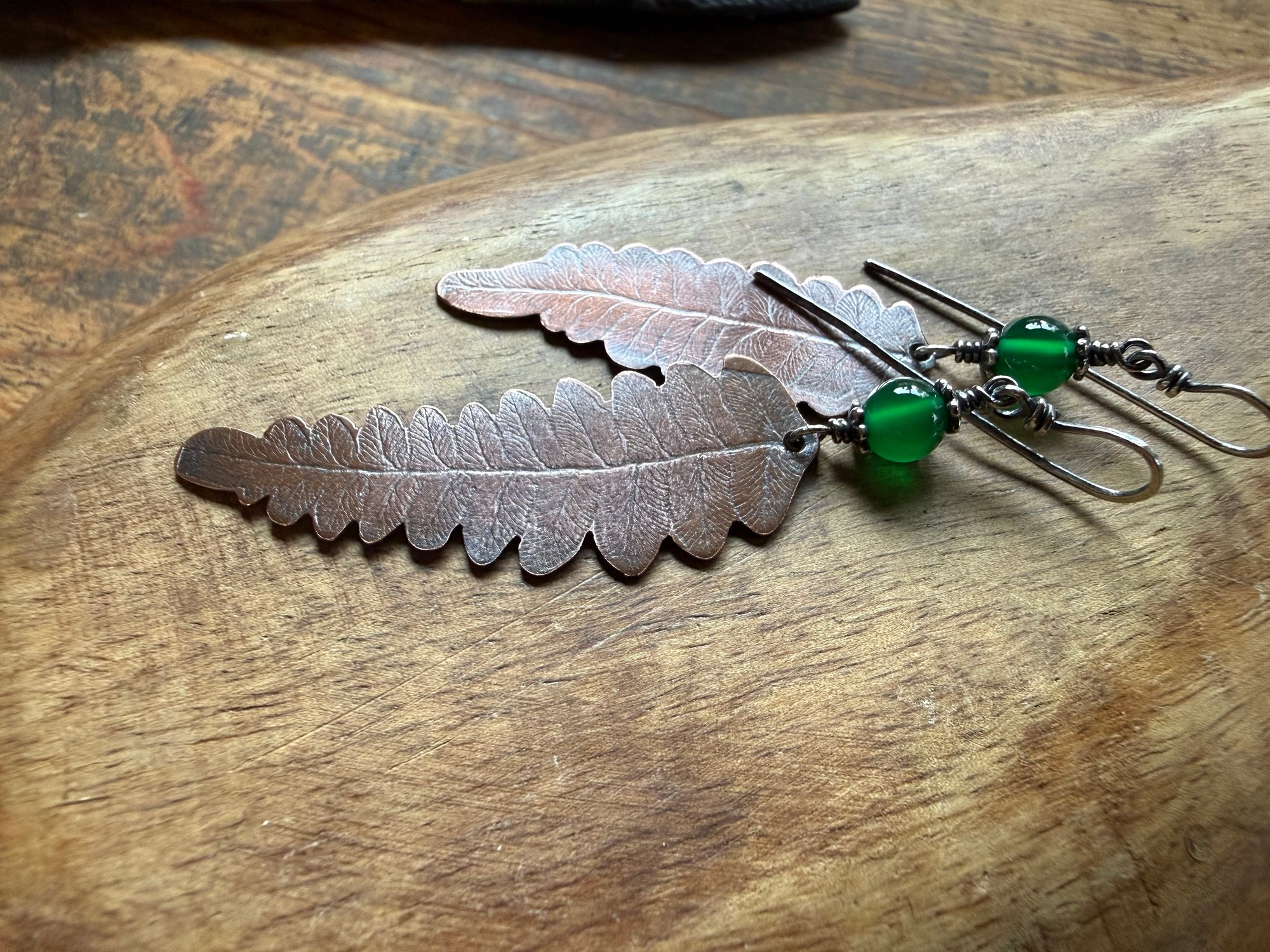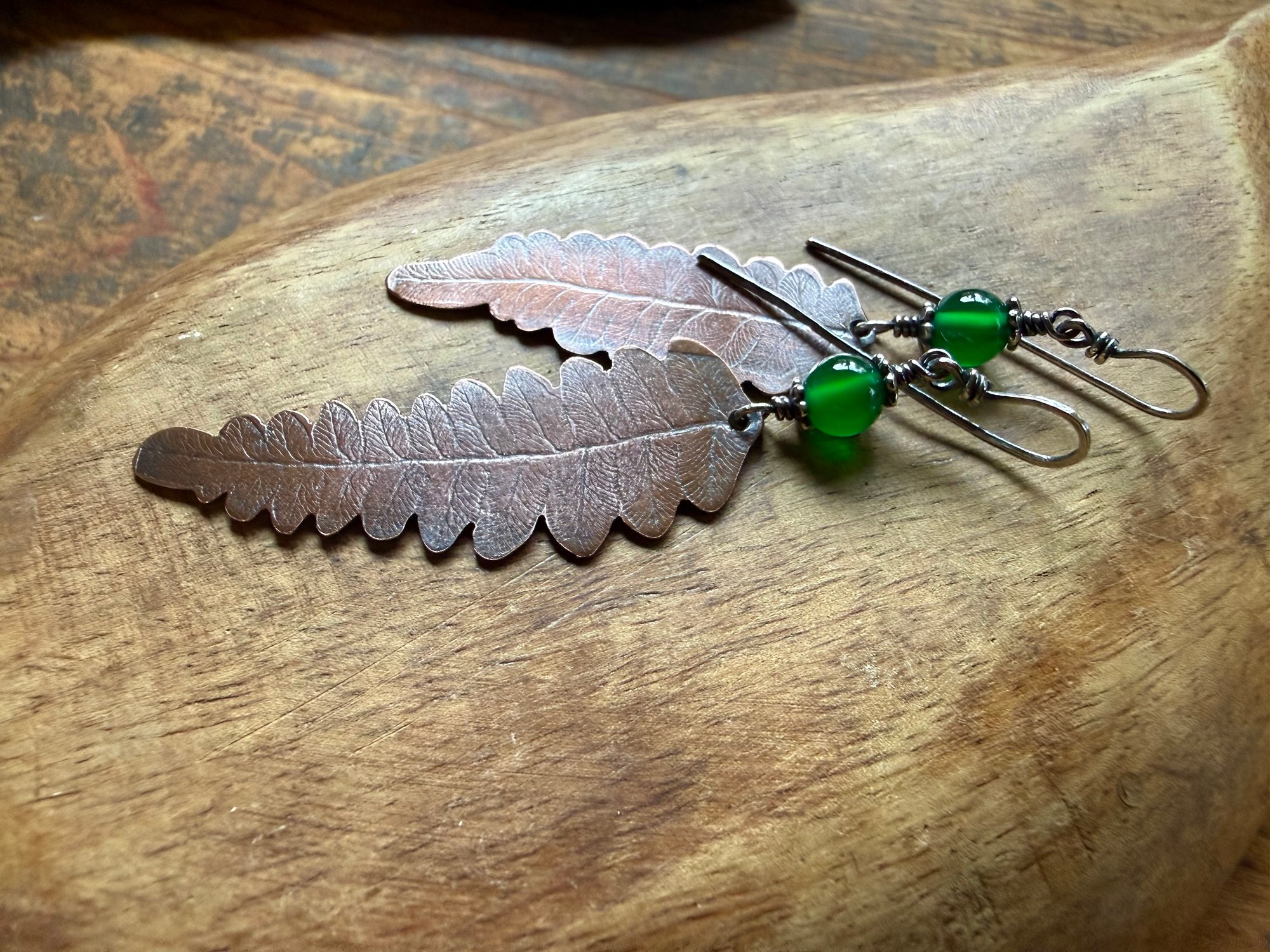 Ferns from my hikes in the forest were dried and then pressed into solid copper sheet. Then cut, polished, oxidized, polished again, Hold at the top by green Onix stones capped by solid sterling Bali spacers, wrapped with sterling ear wires and finished with sterling ear wires.