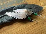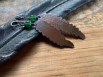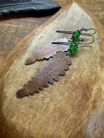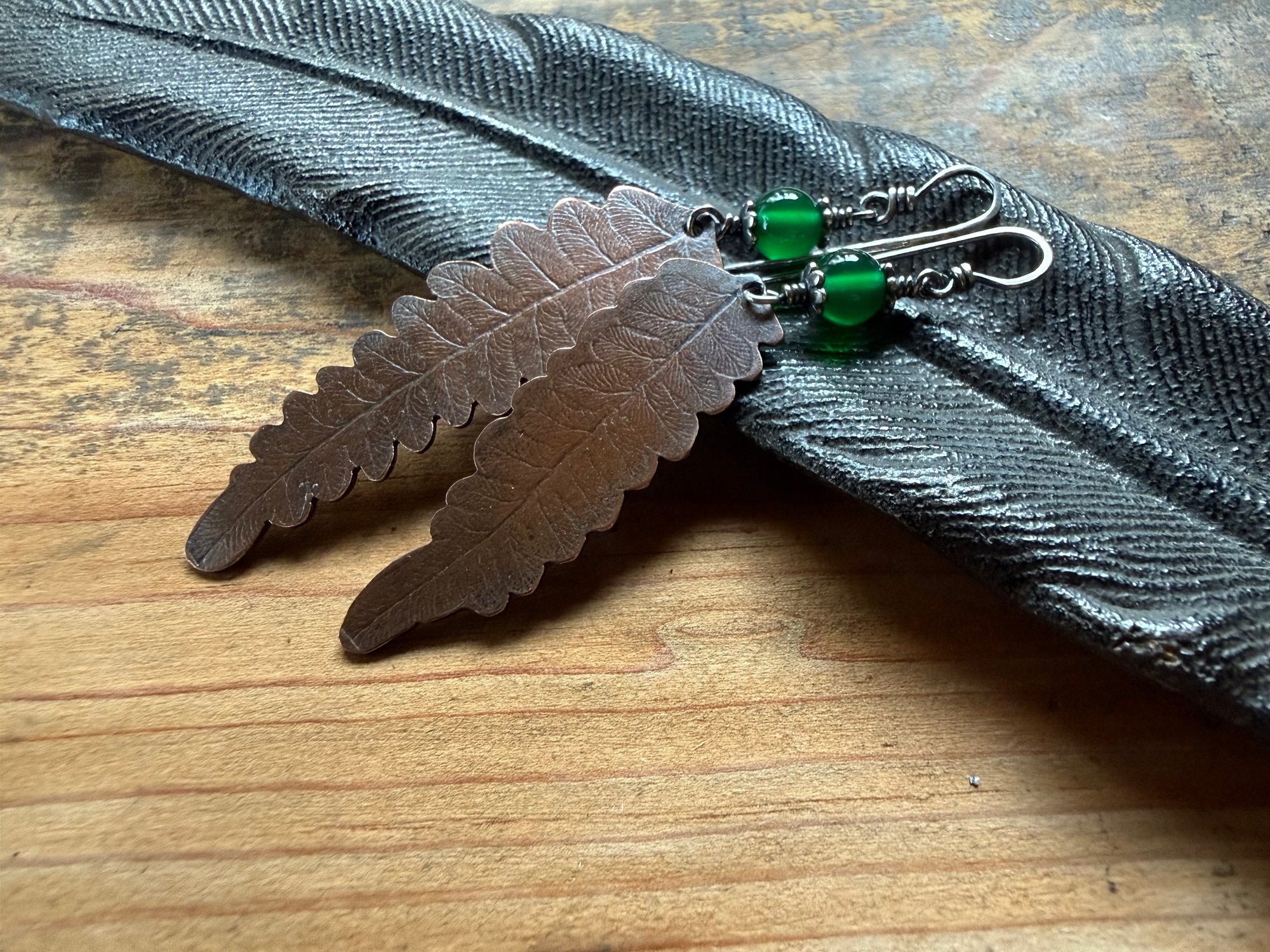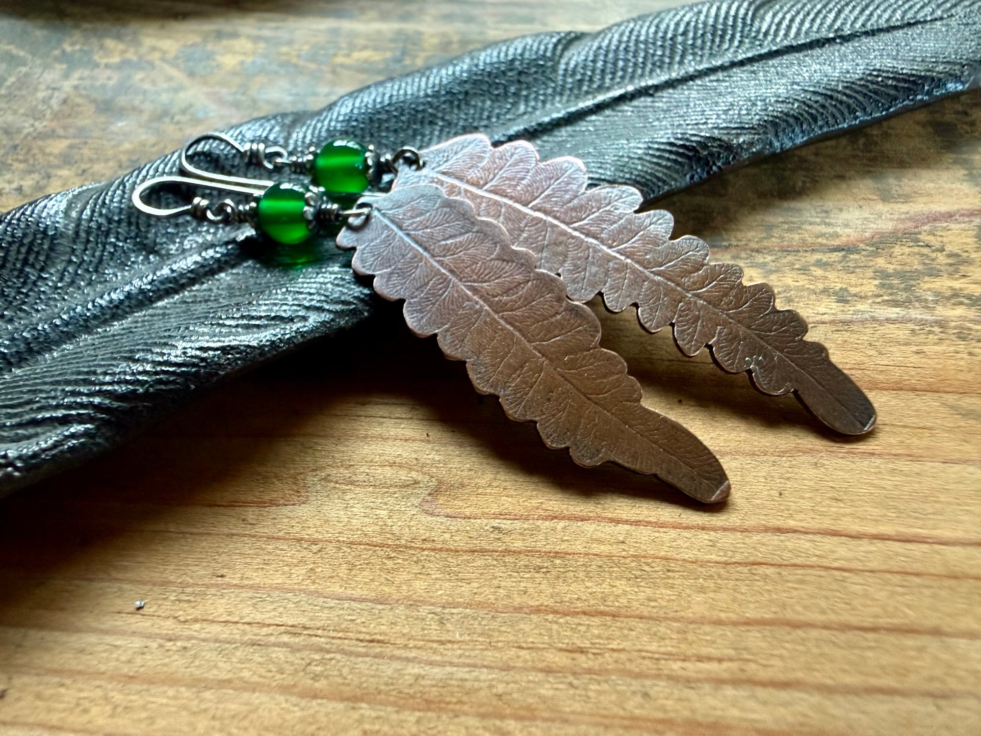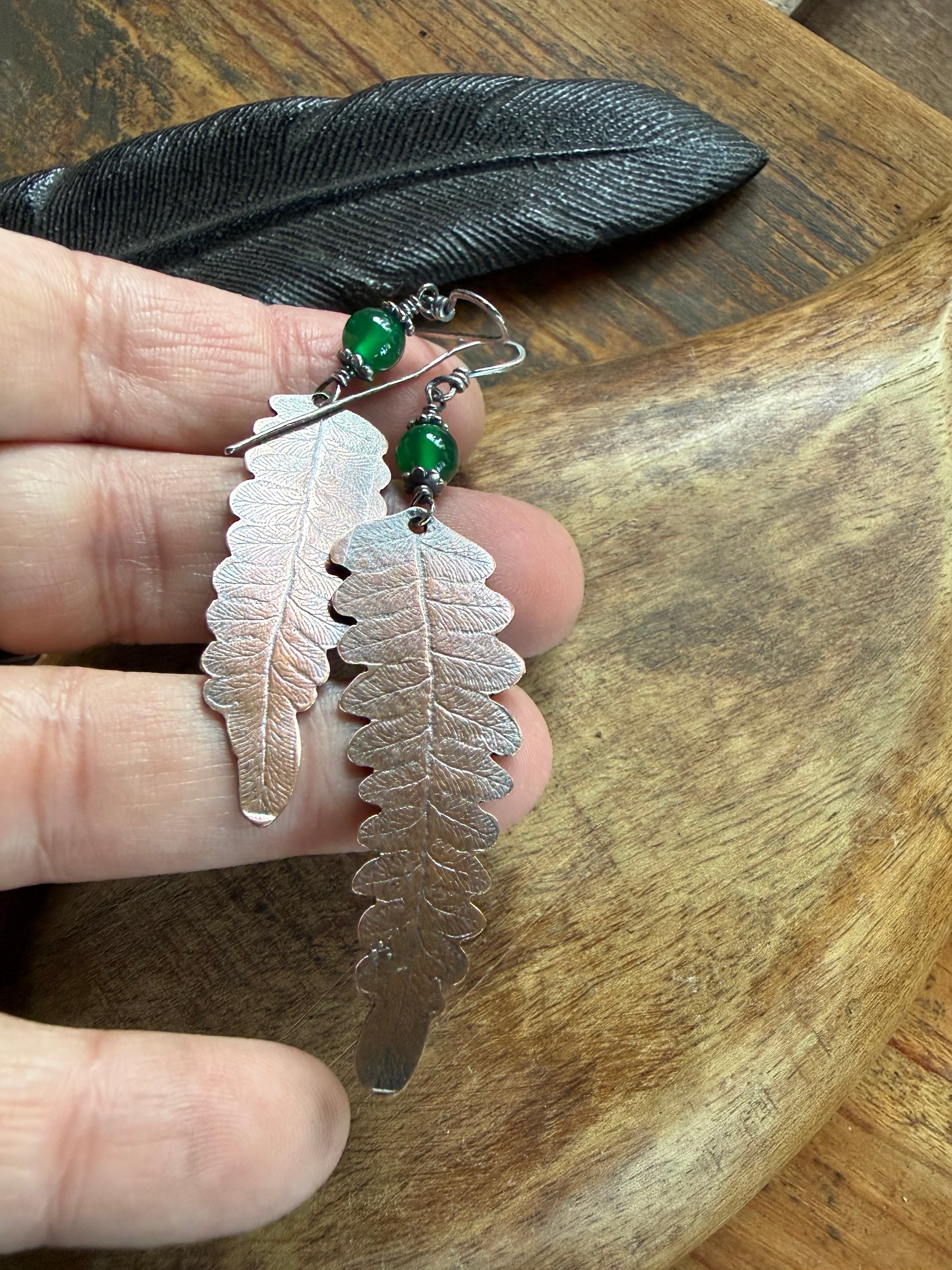 Ferns from my hikes in the forest were dried and then pressed into solid copper sheet. Then cut, polished, oxidized, polished again, Hold at the top by green Onix stones capped by solid sterling Bali spacers, wrapped with sterling ear wires and finished with sterling ear wires.