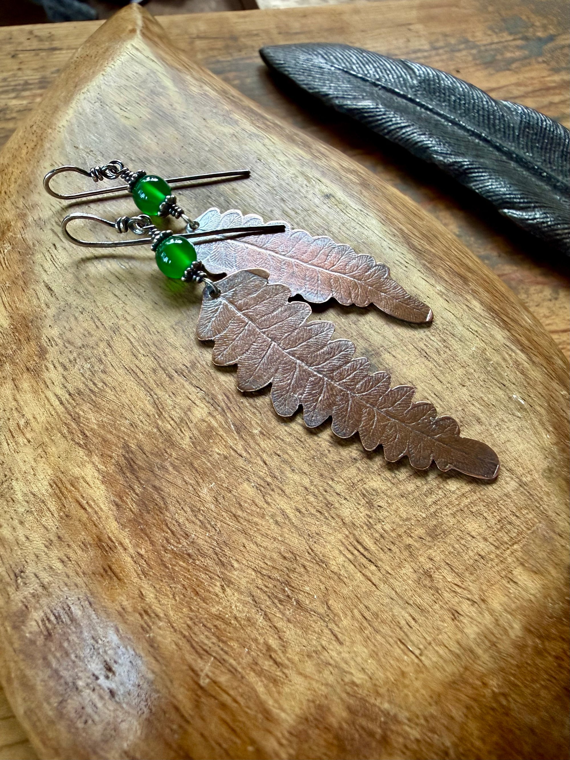 Asymmetrical Fern copper, sterling and green Onix earrings/ n45