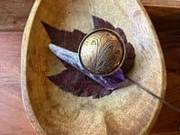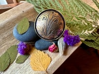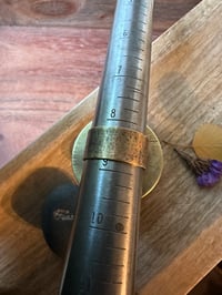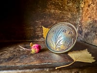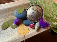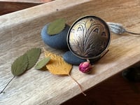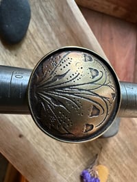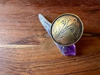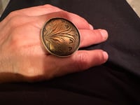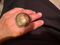 I made this ring with solid jewelers brass metal in different gauges. The floral image was etched by me. Then cut and mounted in the soldered bezel. Thick band. Oxidized, polished.