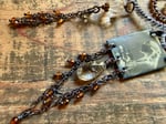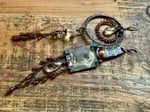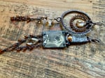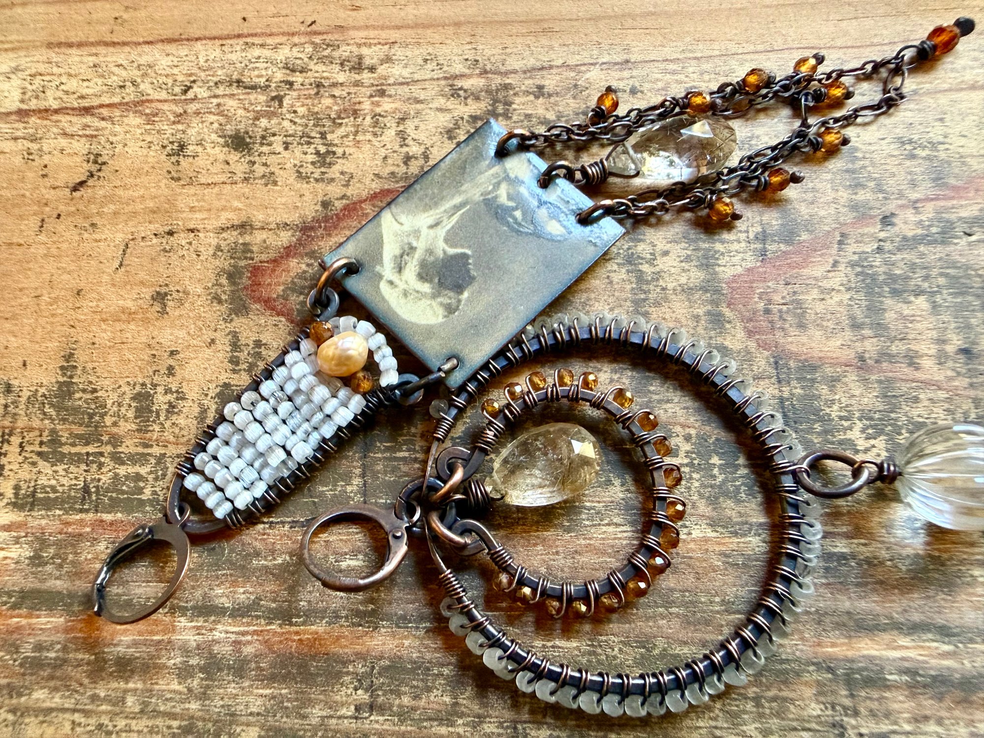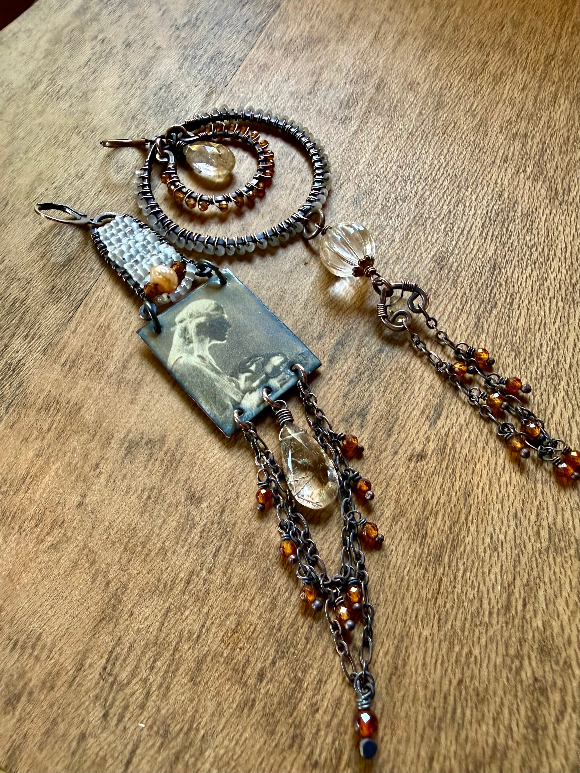 A pair featuring an artisan enamel in one earrings and a chandelier in the other. I used several gemstones to ornate them like a carved Quartz , tiny Hessonite Garnet stones, two Rutile drop stone, a small Aquamarine stone, then seed glass beads, pearl, sections of antique copper chain, copper wires and ear wires.