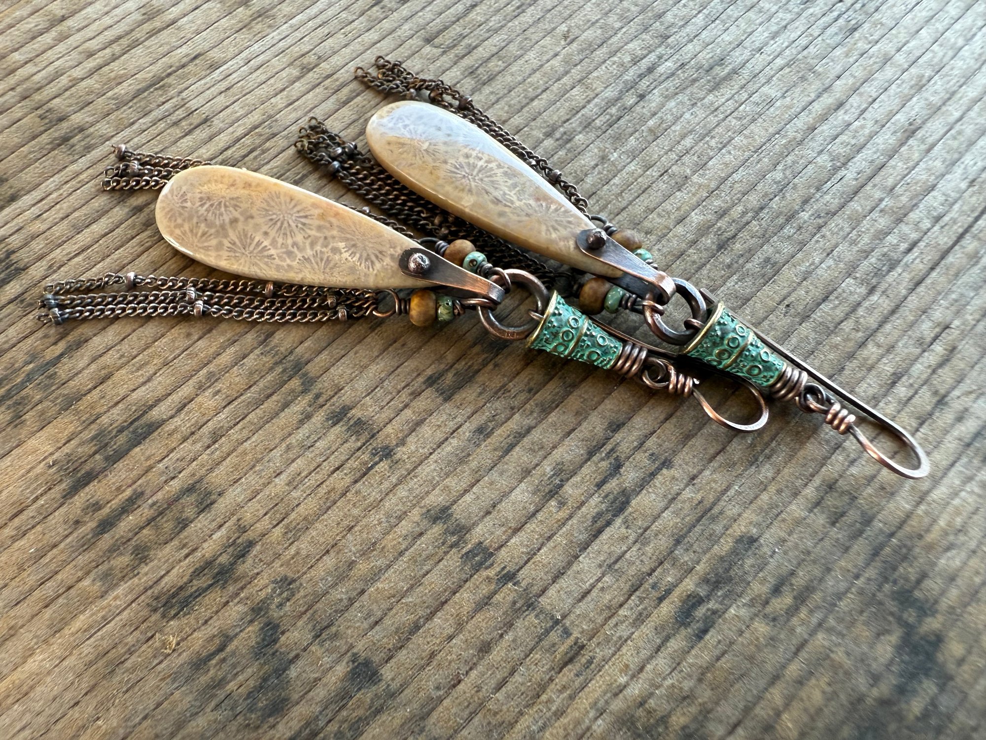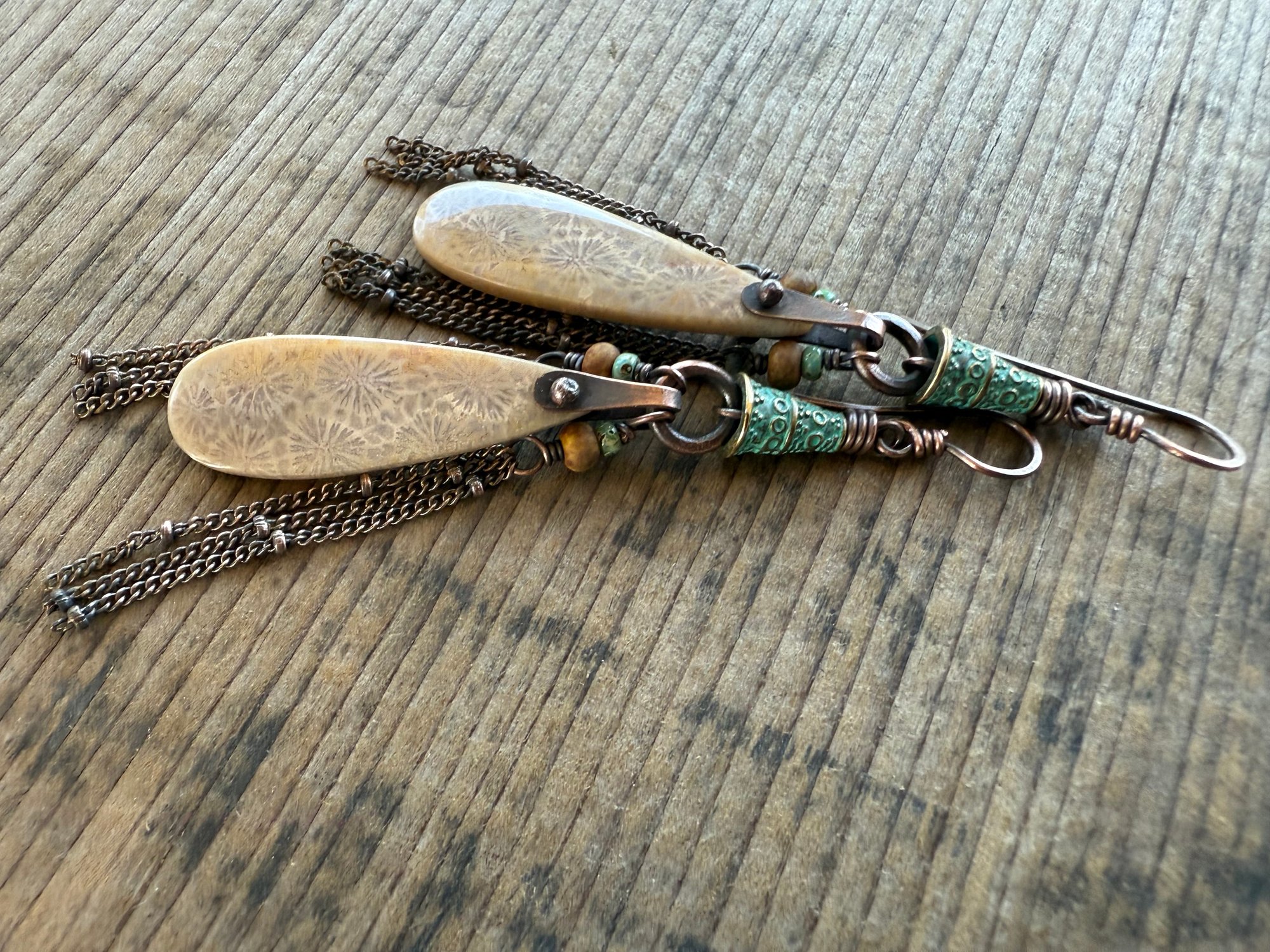 A fossil Coral drop dangles bellow a copper ring hold by a cone bead cap in verdigris patina finished. Embellished with sections of satellite antique copper chain and Picasso seed glass beads. Finished with copper ear wires.