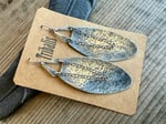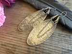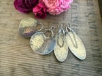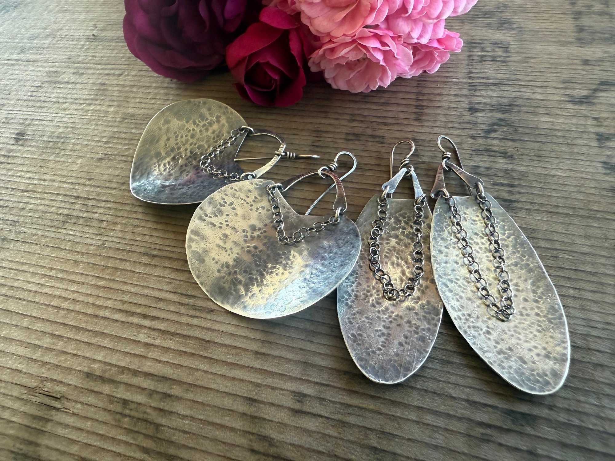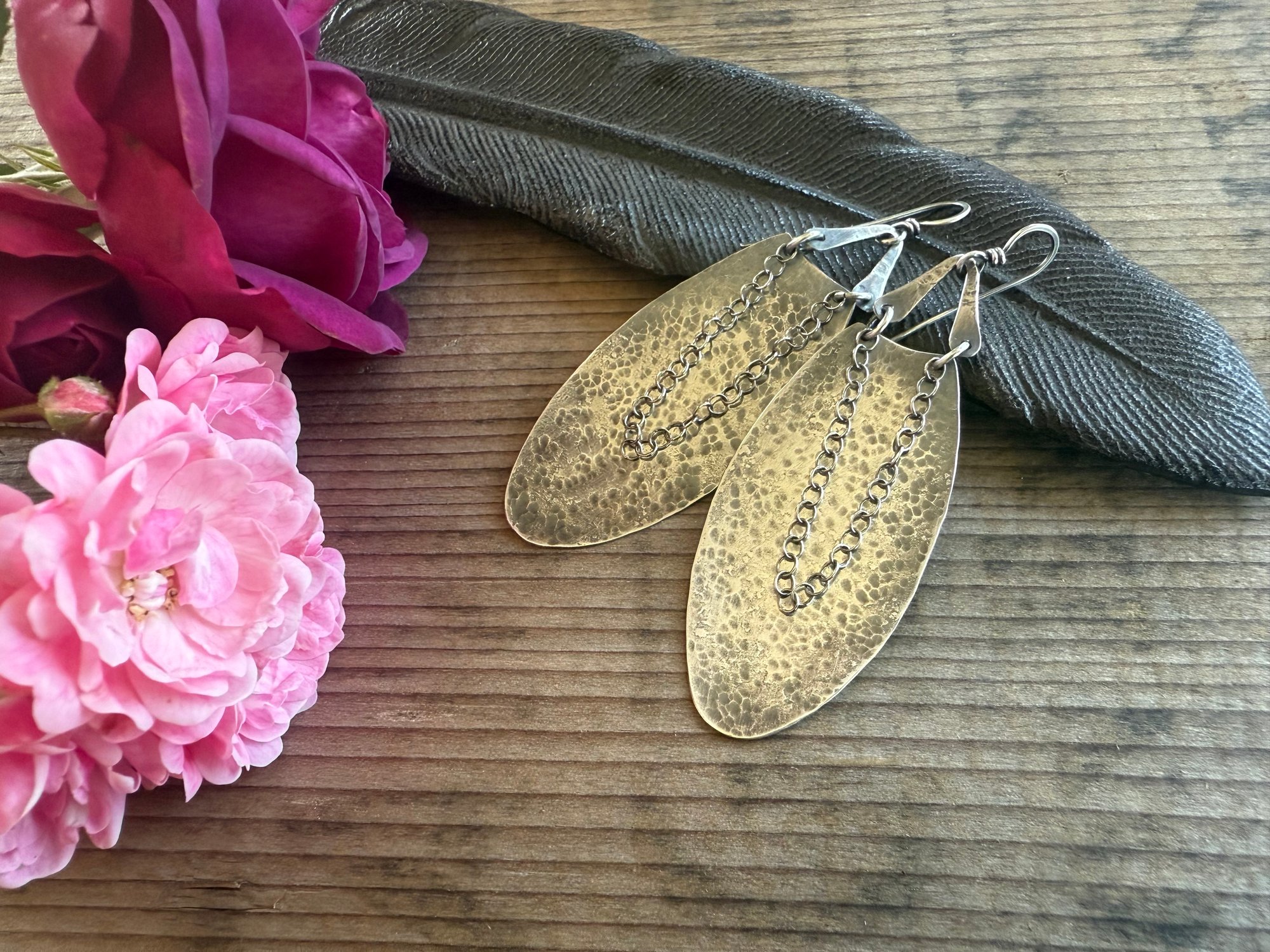 Petals were all handmade, cut, textured, oxidized, polished by me. Sections of sterling silver chain, soldered links, give them a special touch. The focal is hold a a triangular loop and finished with sterling ear wires.
