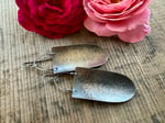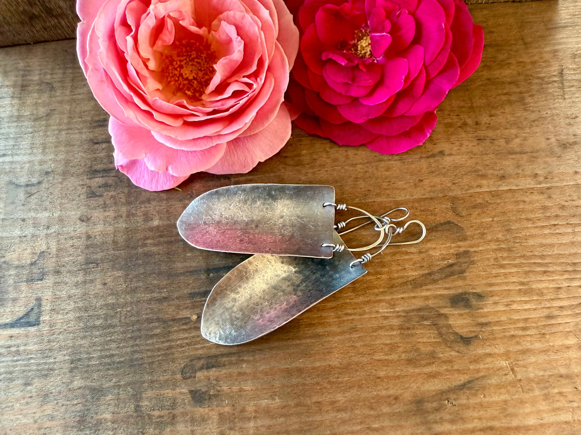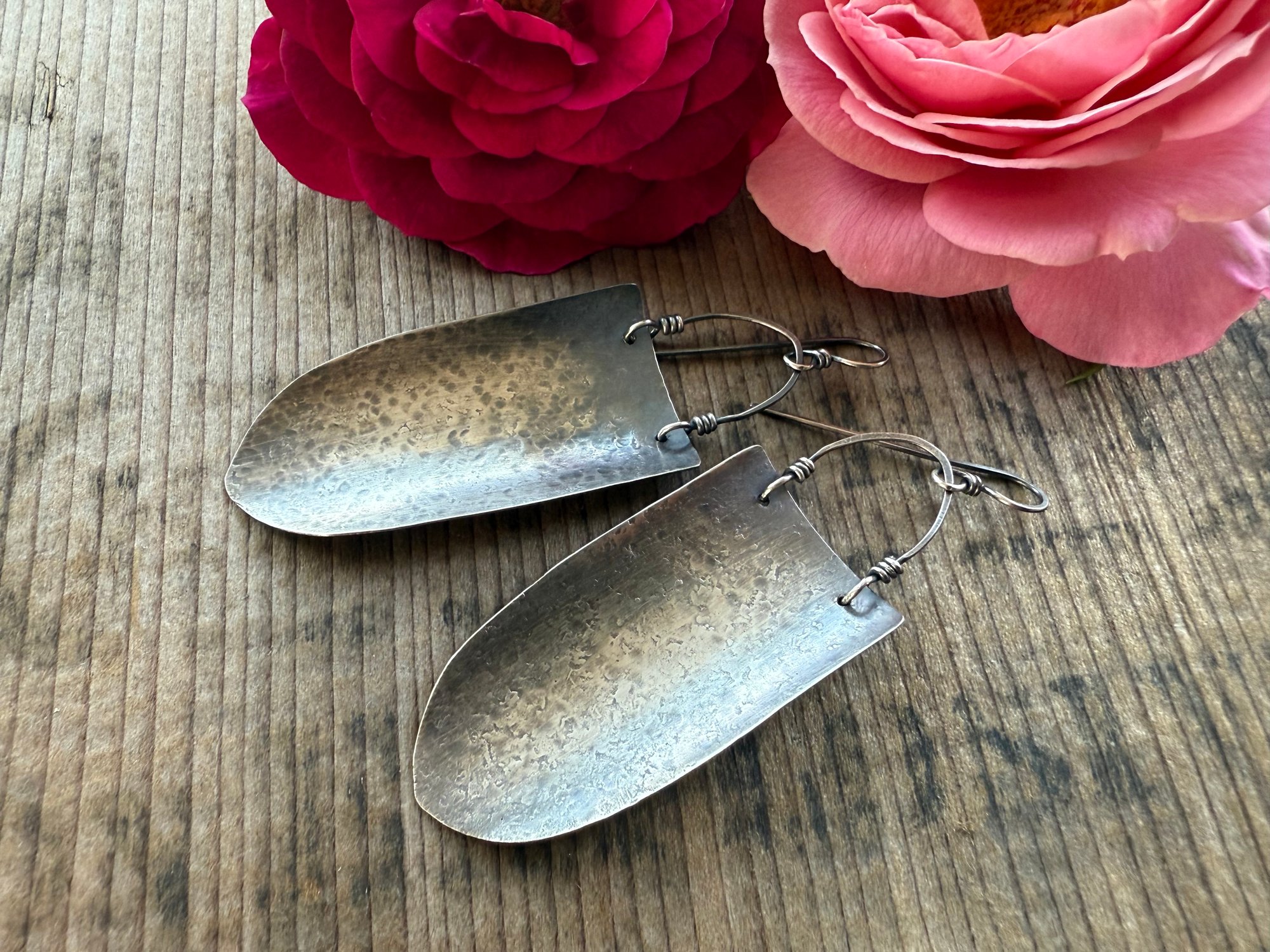 A large focal made by me from sterling silver sheet. Process involves designing, cutting, polishing, texturing, oxidizing, polishing. Hold at the top by a sterling loop and ear wires.