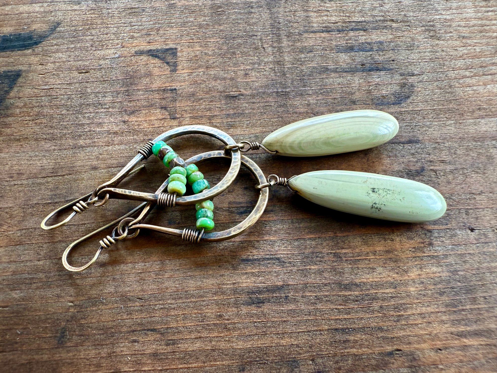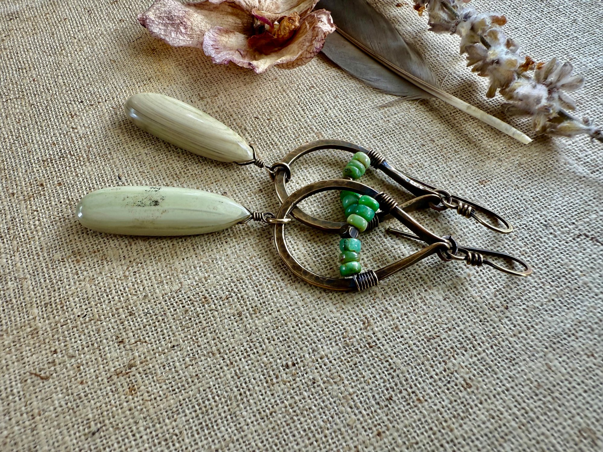 A simply solid brass frame in a drop shape, ornate with Chrysoprase stones. An Imperial Jasper dangles bellow. Finished with brass ear wires.