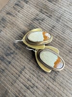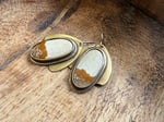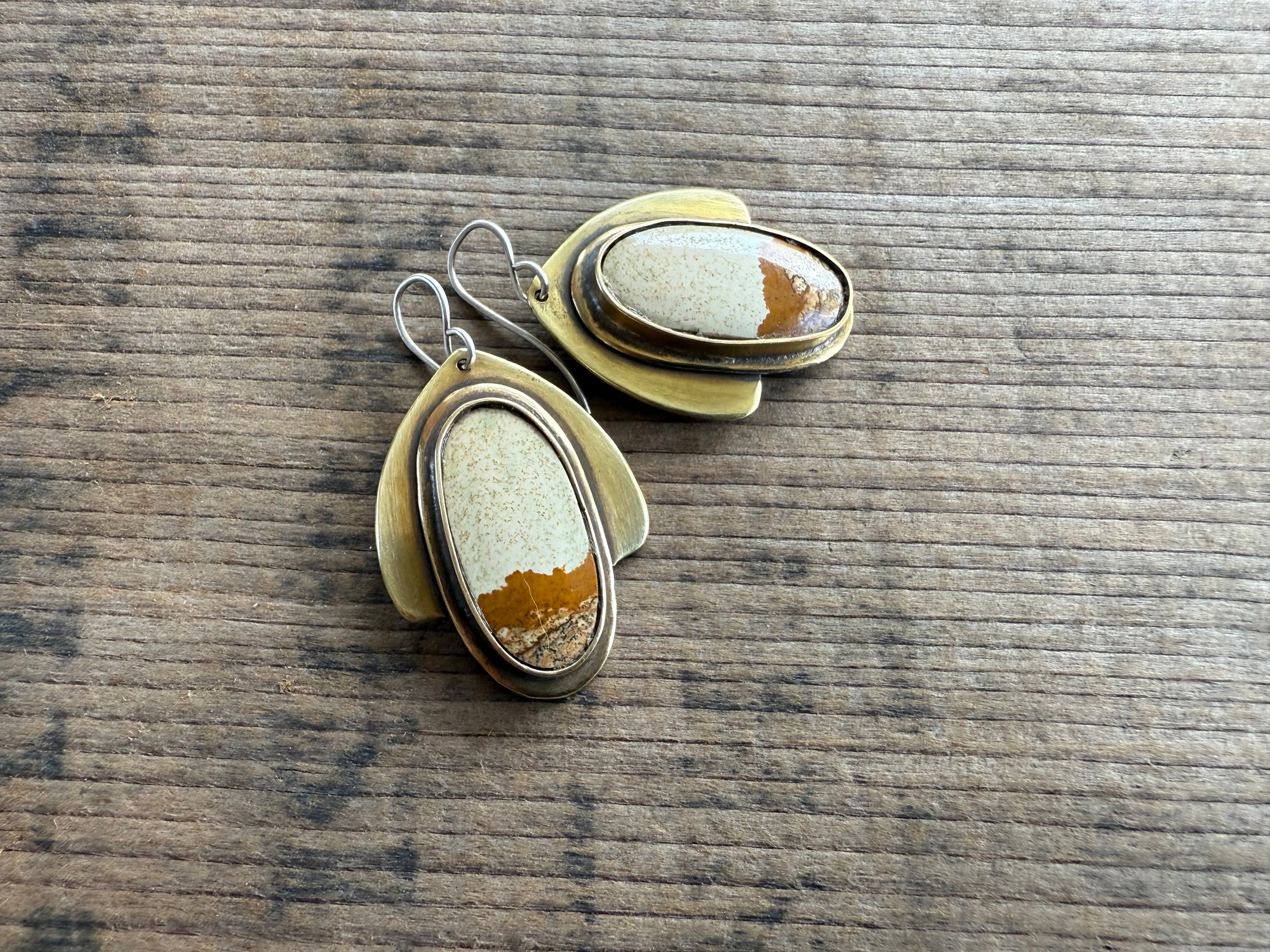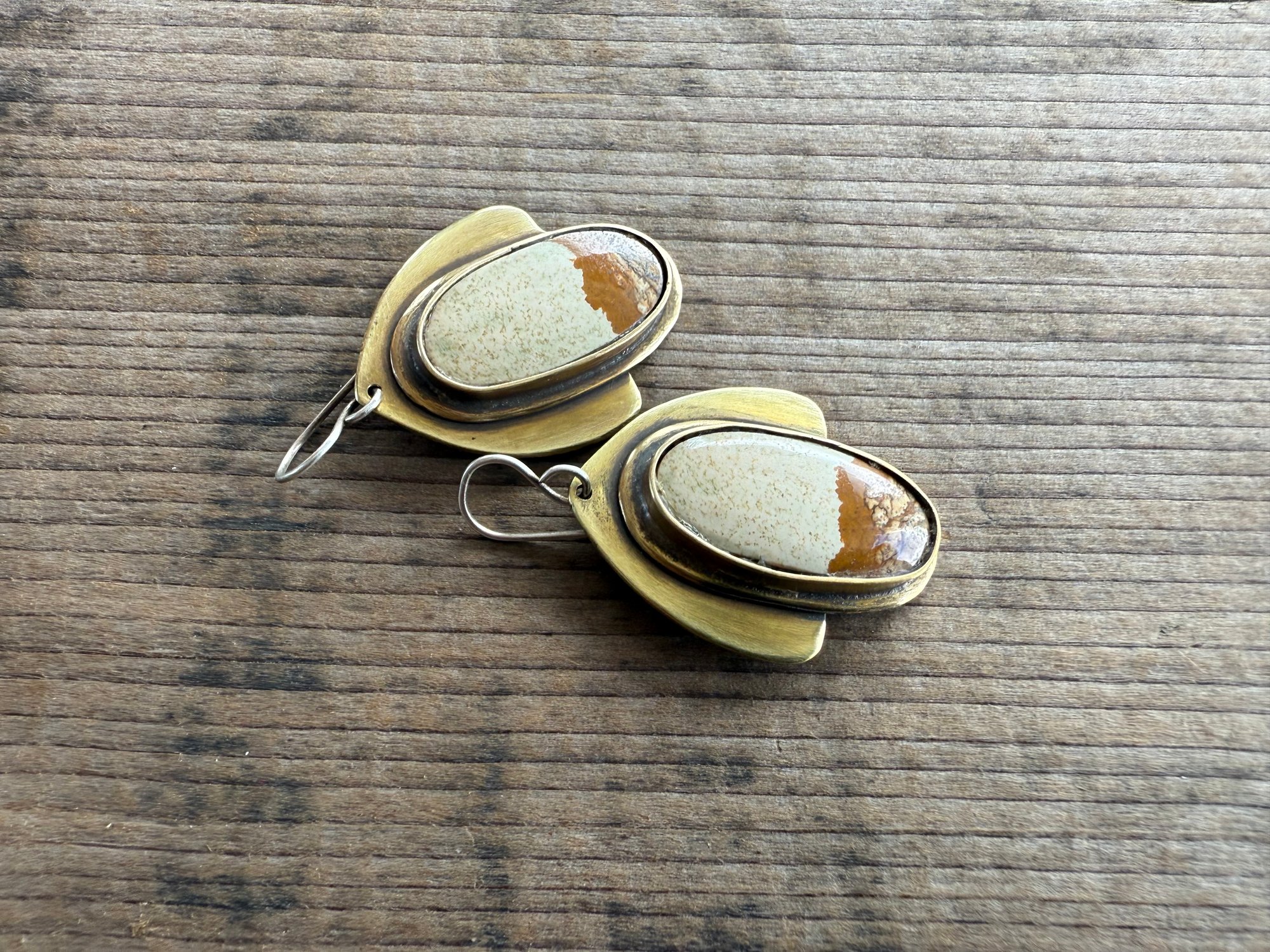 A Picture Jasper framed in my handmade solid brass structure. Sterling ear wires.