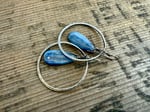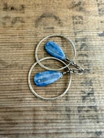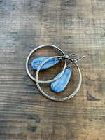 A large Kyanite stone dangles in the center of my hand forged loops made with 14 gauge sterling silver wire, textured by me as well. Sterling ear wires.