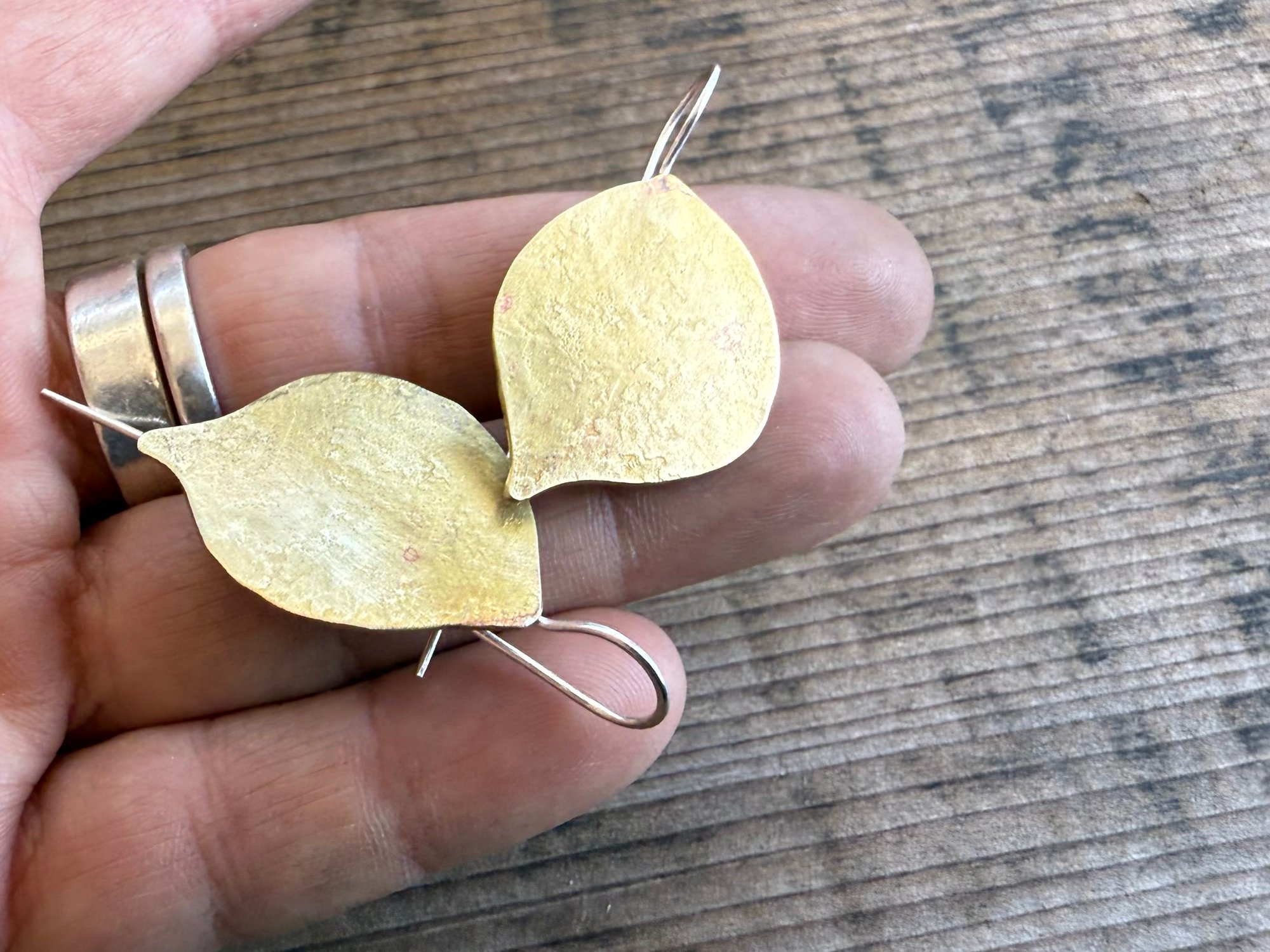 I cut the leaves out of brass sheet, textured them and soldered the sterling ear wires.