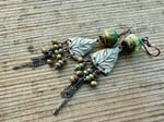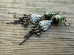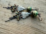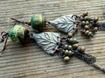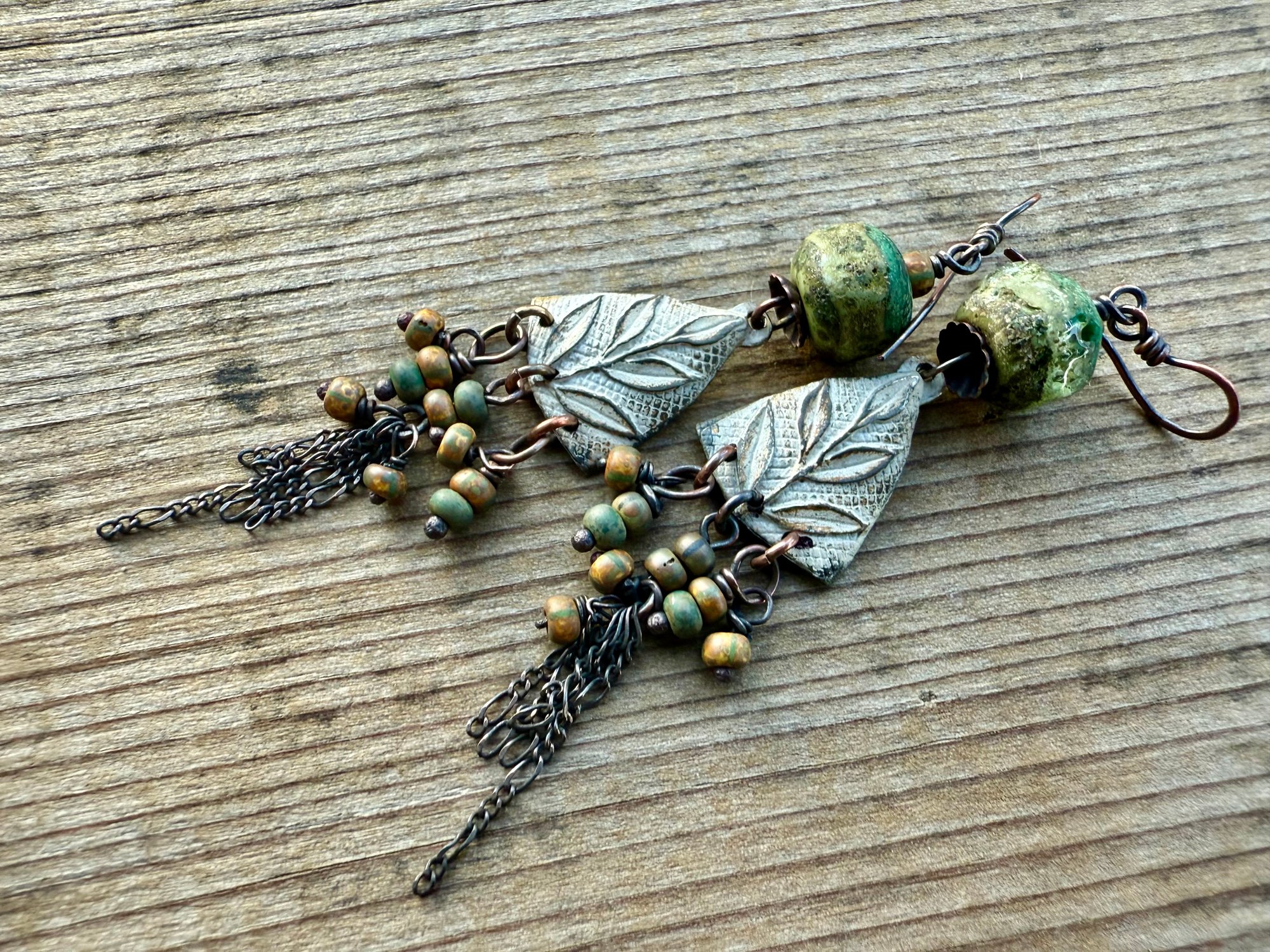Artisan lamp work, artisan pewter charm in white patina, Picasso glass beads, copper wires and sections of antique copper chain.