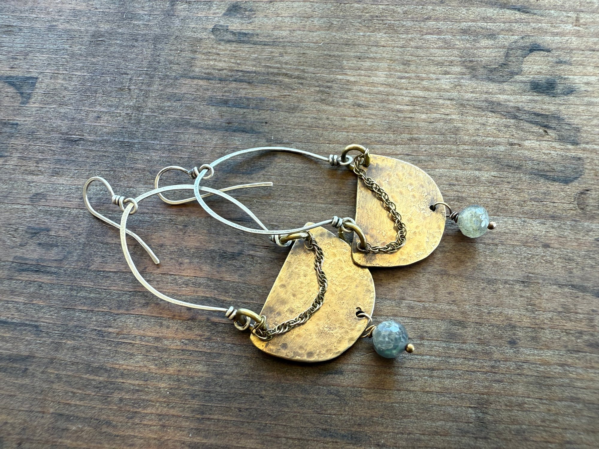 Half circle brass handmade by me is hold by sterling loops and ornate bellow with a Labradorite stone. Finished with sterling silver ear wires.