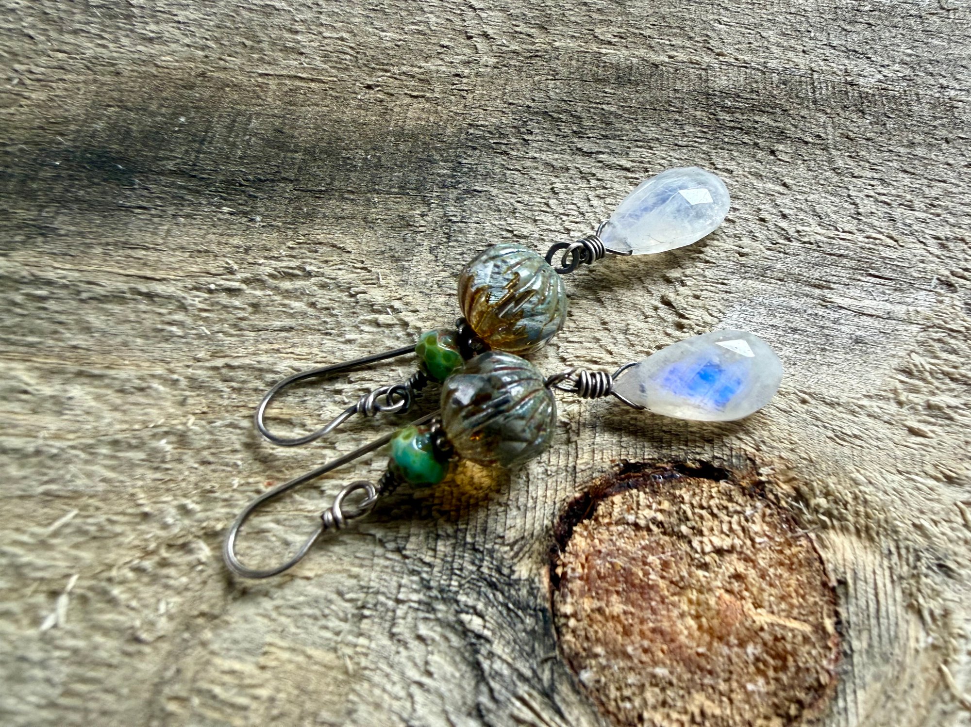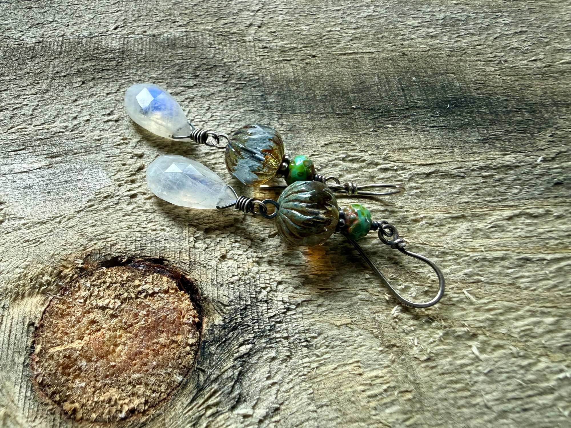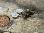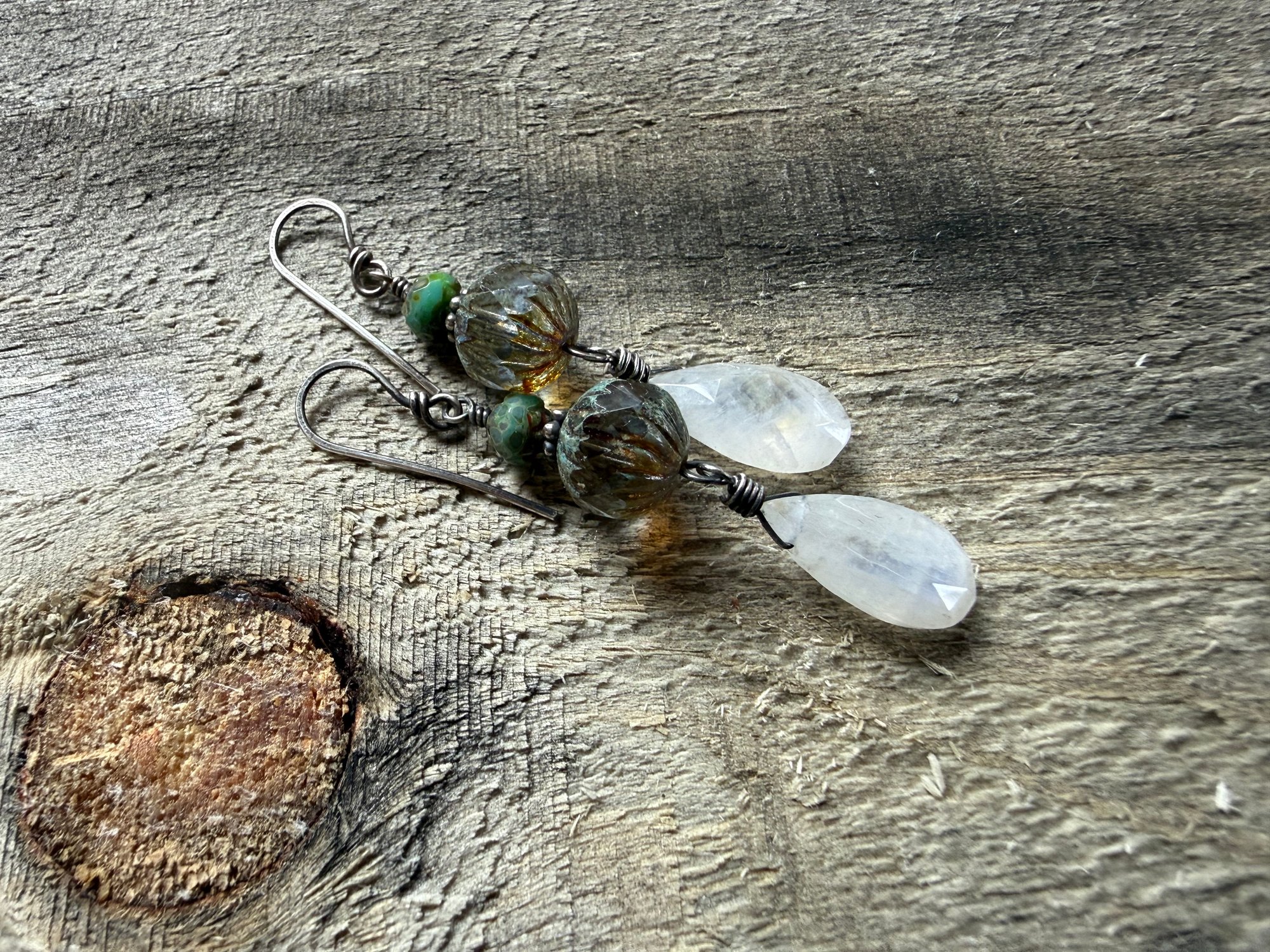 A Moonstone dangles bellow a duet of Czech glass in water color and another green Czech glass. Sterling silver wires and ear wires.