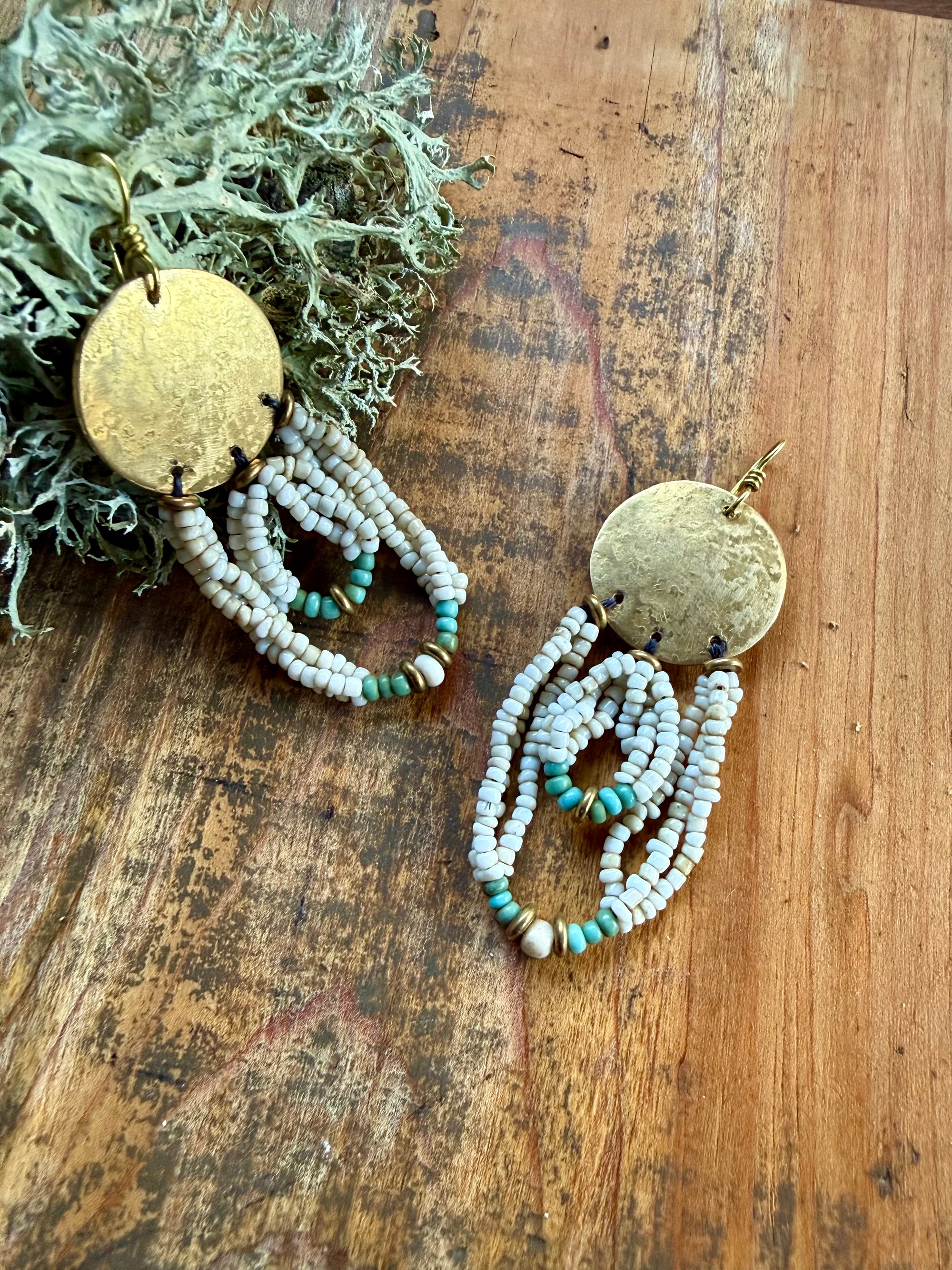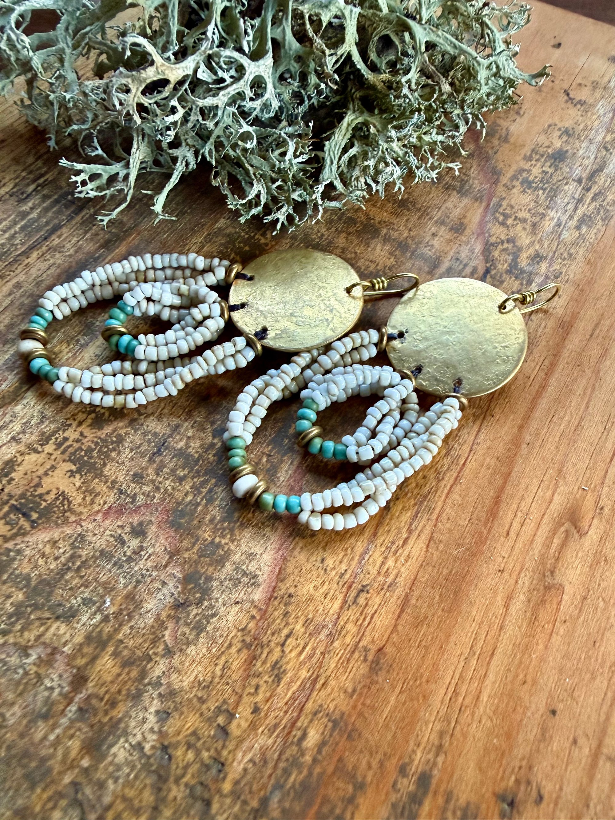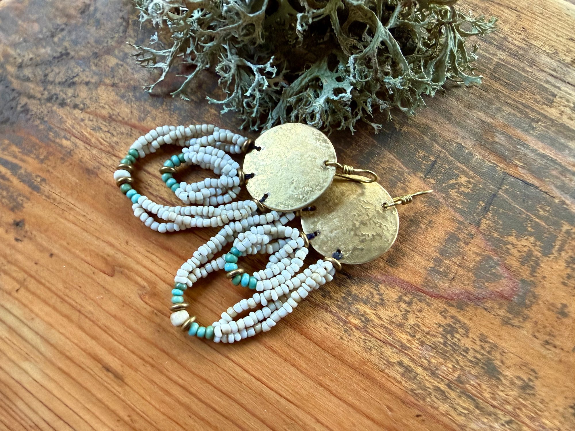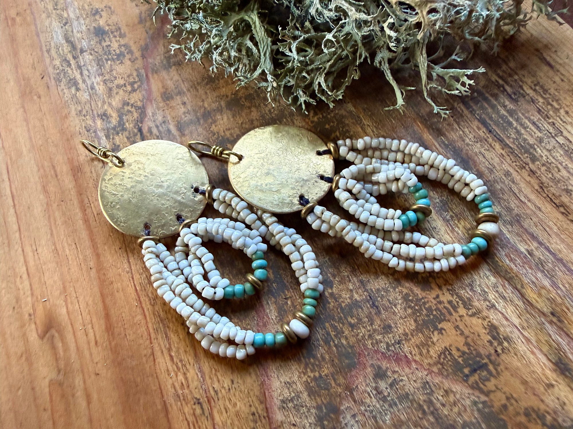 My handmade/ textured brass discs, brass ear wires and seed glass beads from Indonesian and Tibet and solid brass spacers.