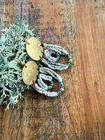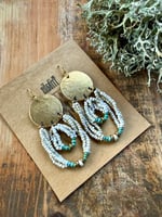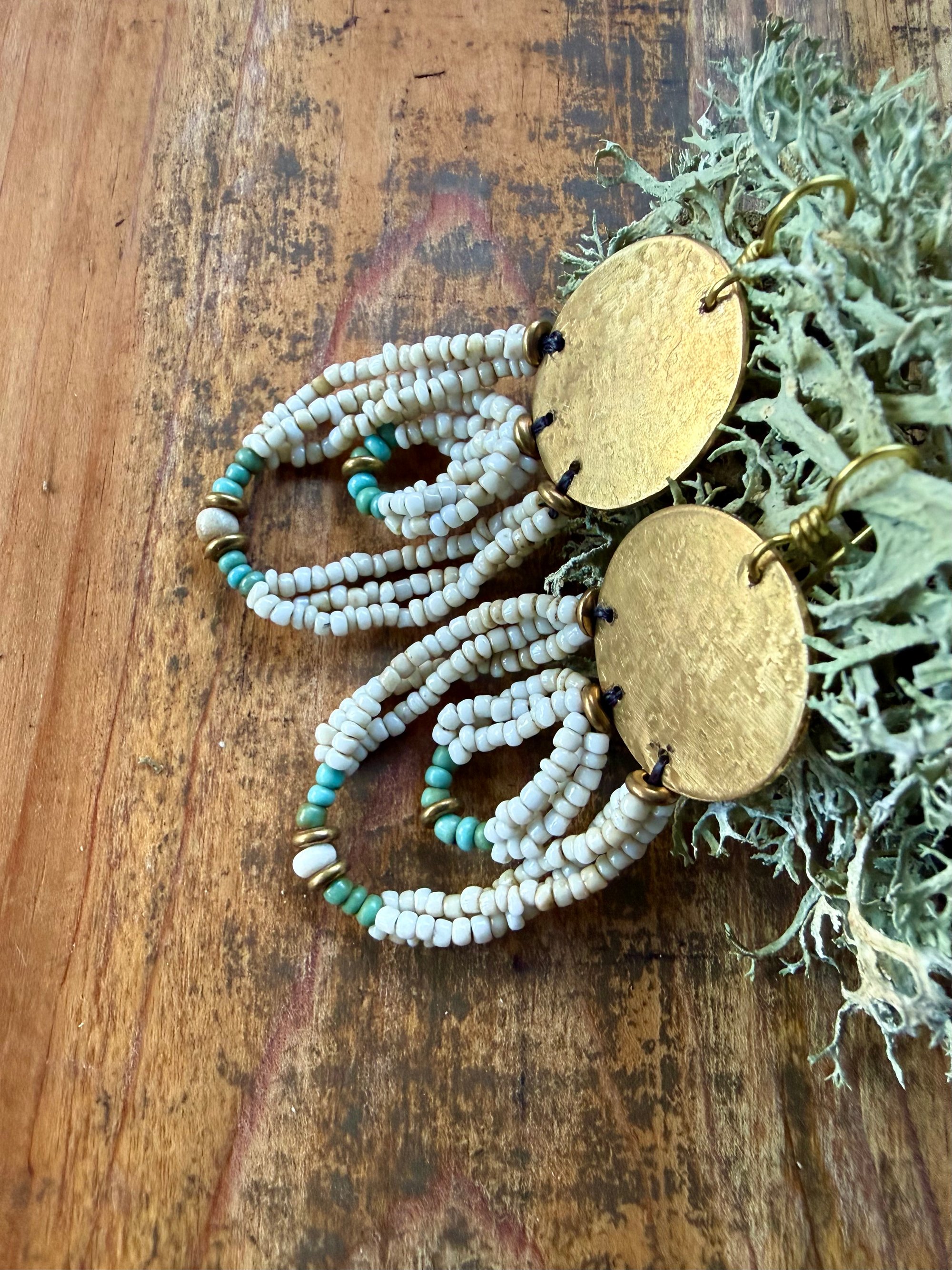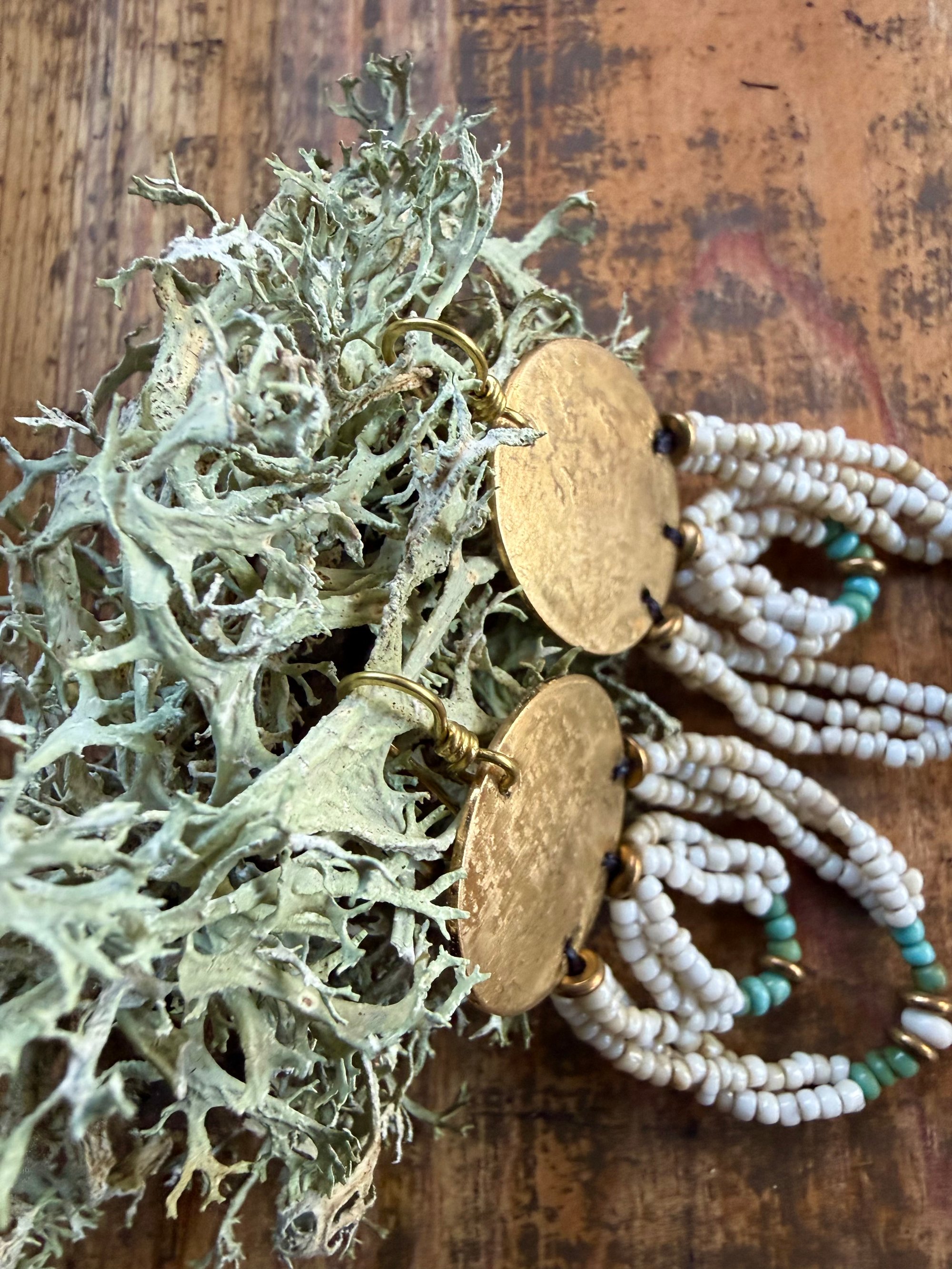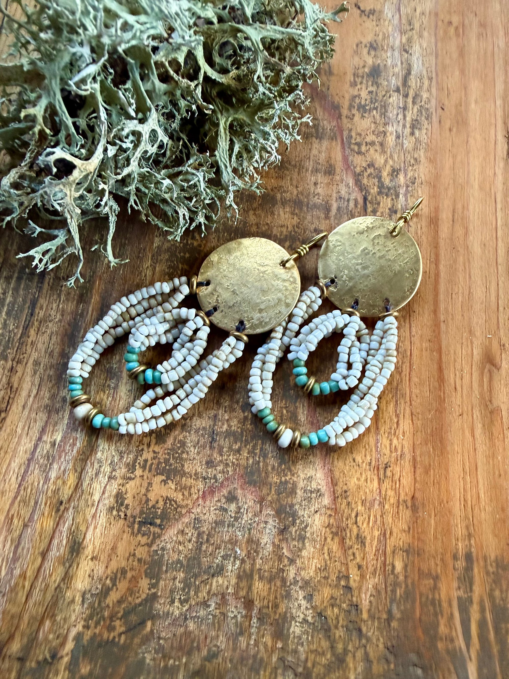 My handmade/ textured brass discs, brass ear wires and seed glass beads from Indonesian and Tibet and solid brass spacers.