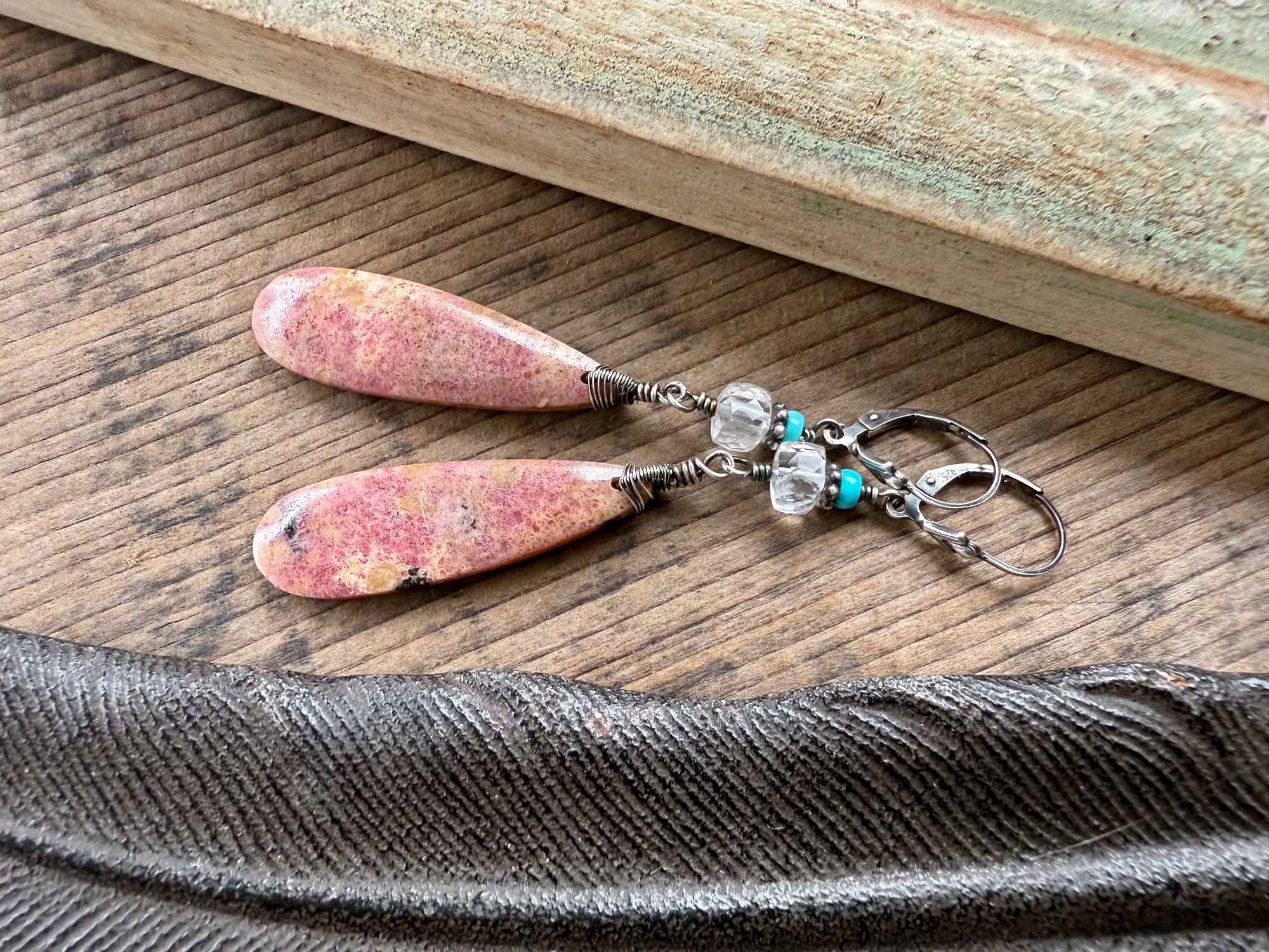 Rhodhonite, Quartz and Turquoise sterling silver earrings
