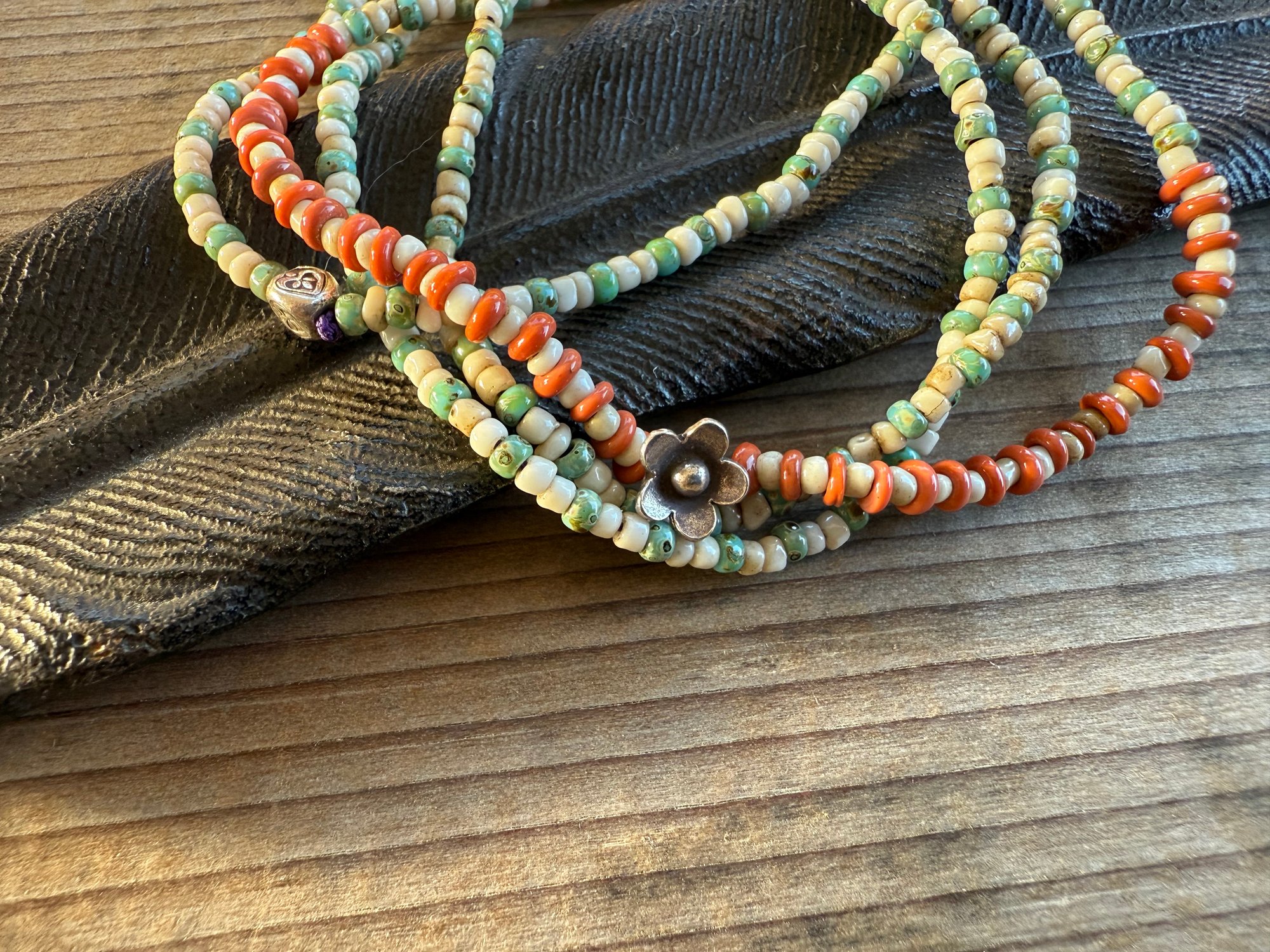 Seed glass beads, Indonesian glass and two solid sterling silver Karen Hill Tribe beads.