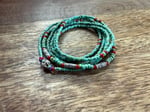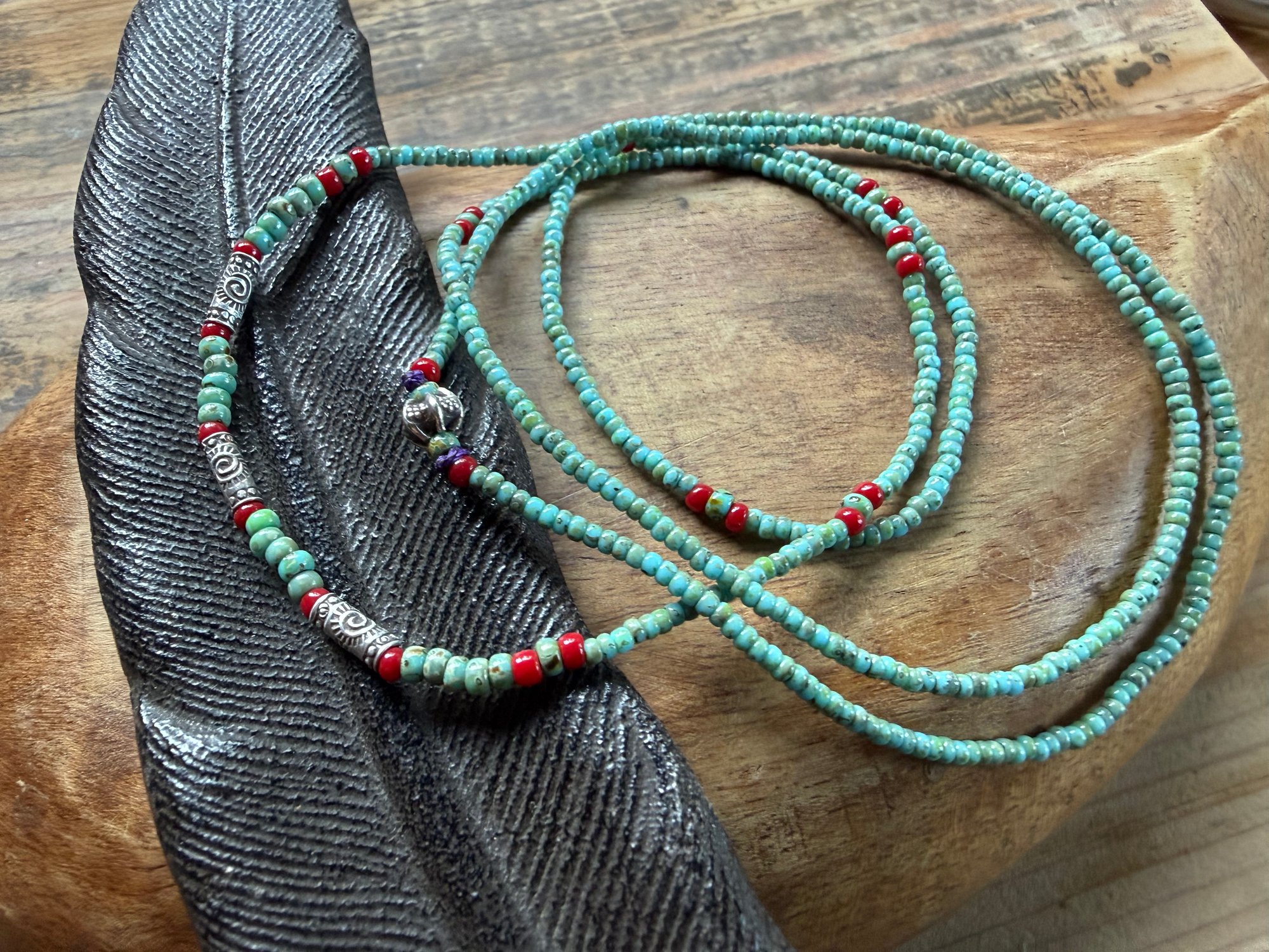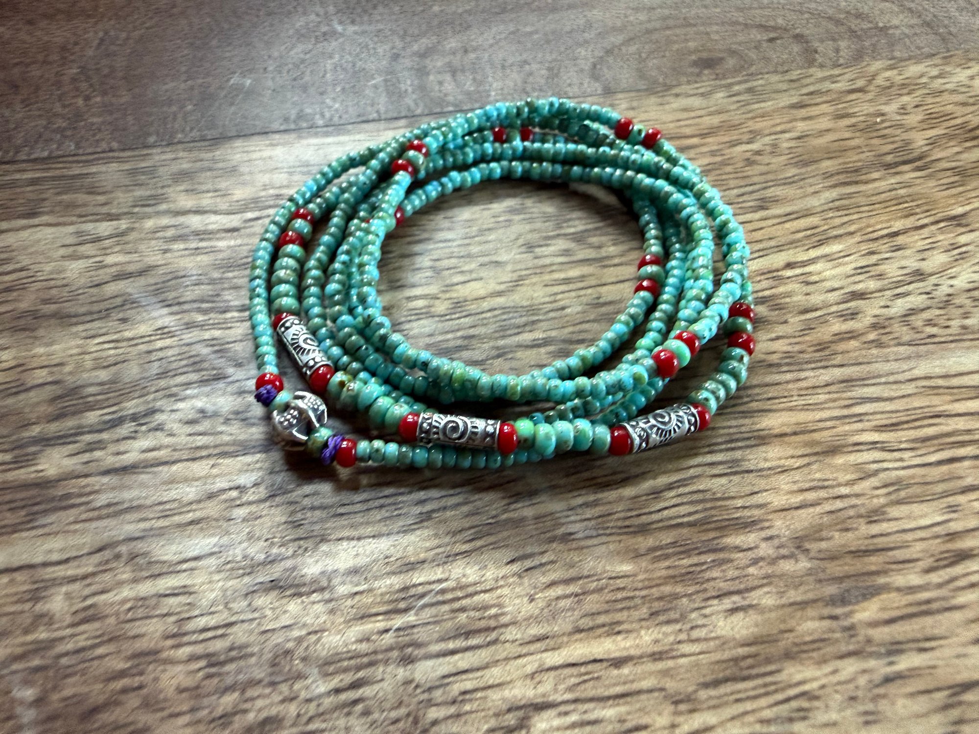 Indonesian glass and seed glass beads, seeds of love, and 3 solid sterling silver Karen Hill Tribe tube beads in the center and one in the closure behind.