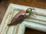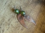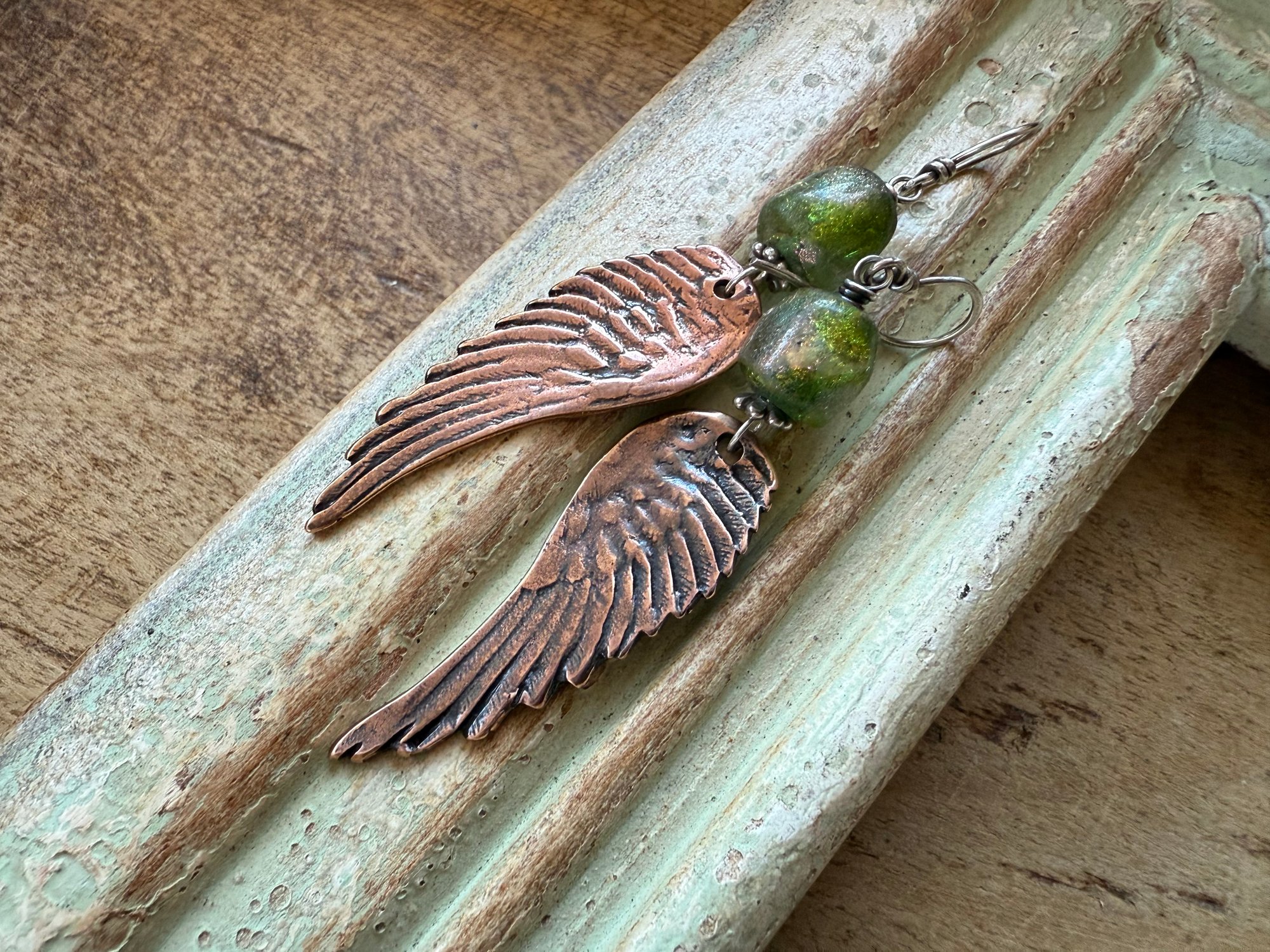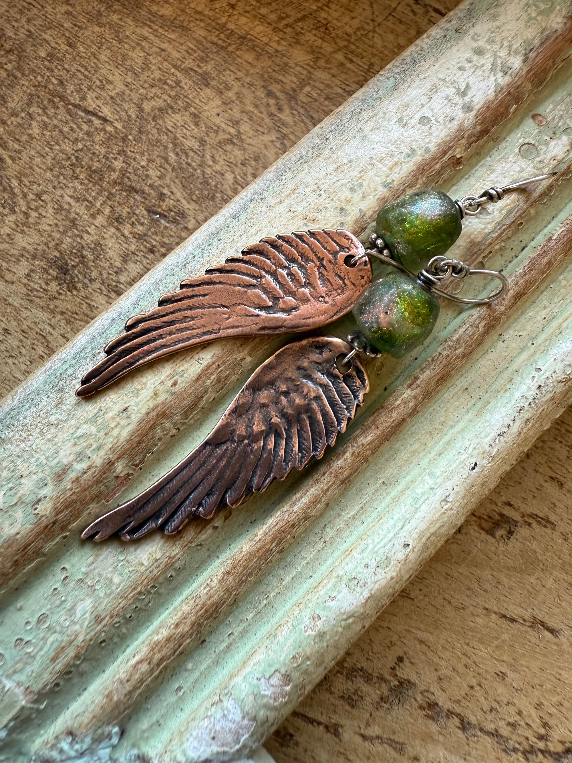 A gorgeous boho pair featuring a shimmering Basha bead and a hand cast solid copper angel wing. Sterling ear wires, wires and Bali spacer.