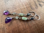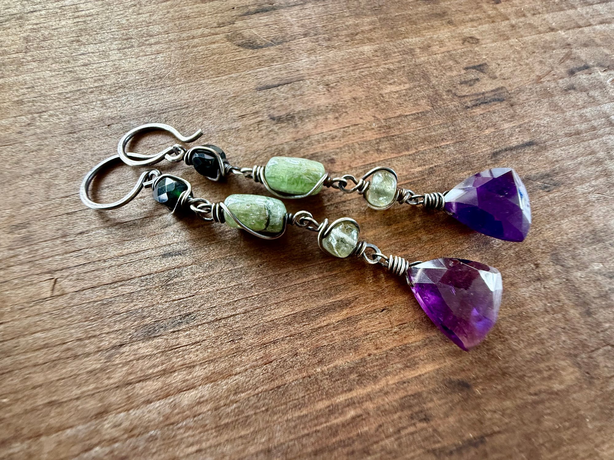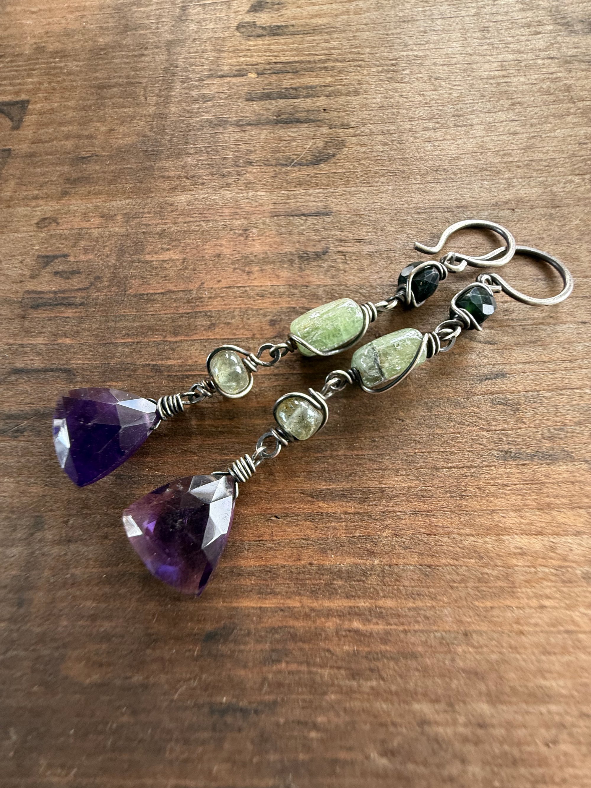 A triangular Amethyst, a green Kyanite, an Aquamarine nugget and a dark Vesuvianite squares stone, all gathered and wrapped in sterling silver wires, oxidized and polished for rustic finish. Sterling ear wires, 18 gauge.