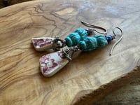 A carved Turquoise Owl is paired with a Lapis Lazuli stone and hold bellow a floral pottery from fairway seas.