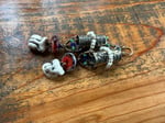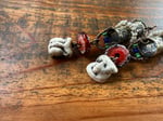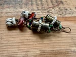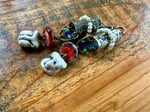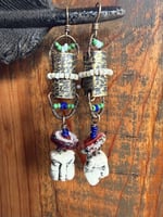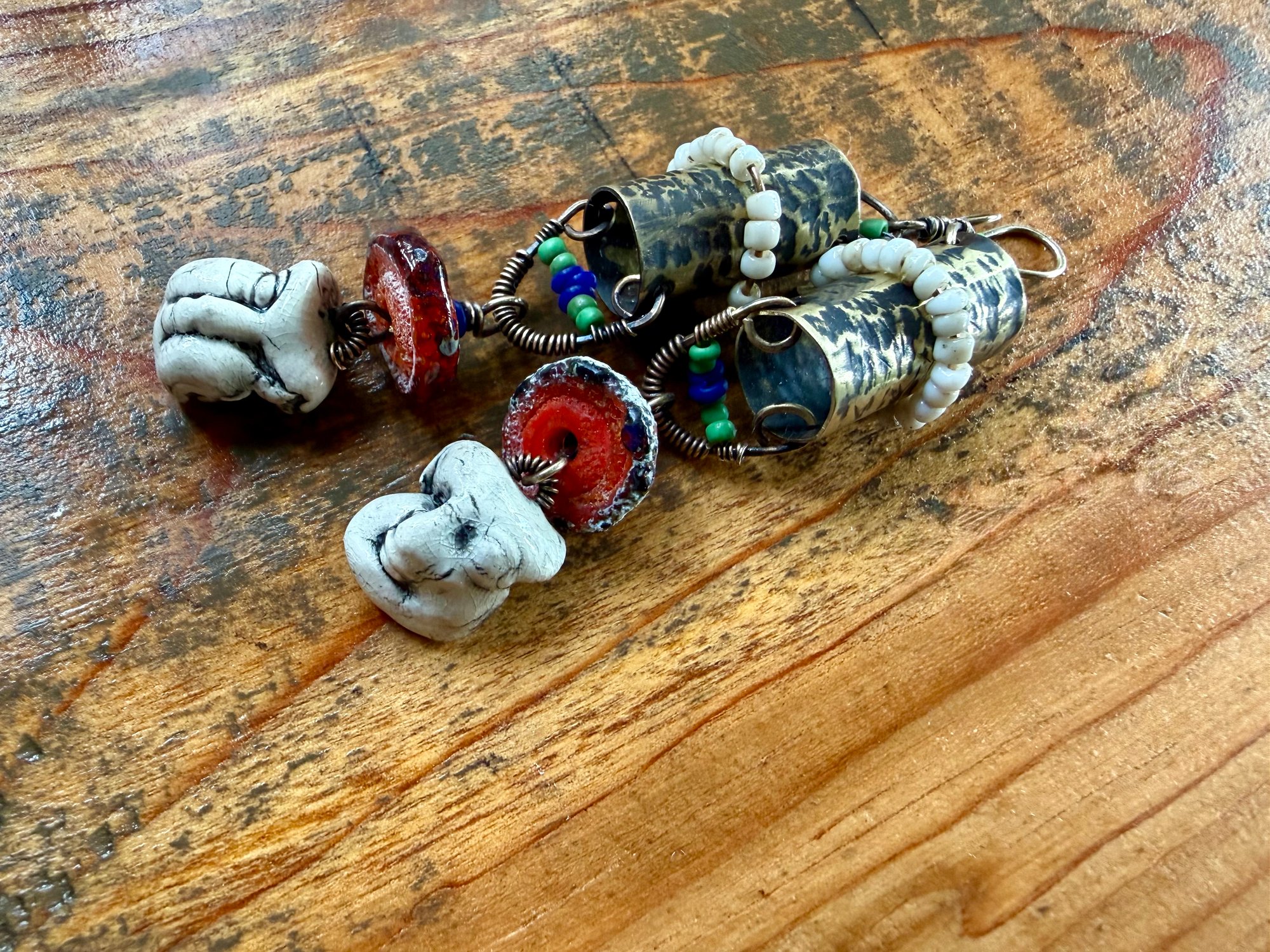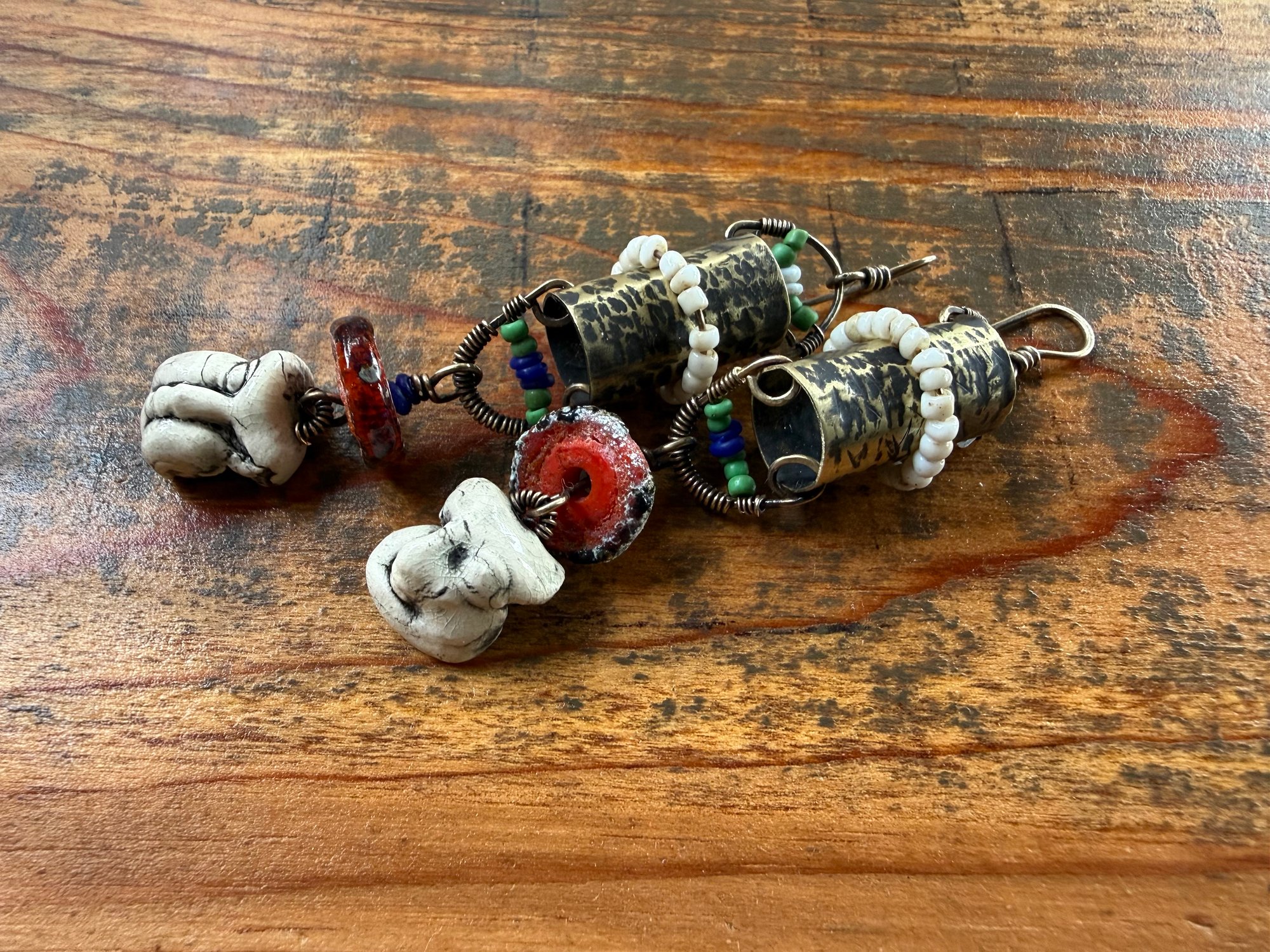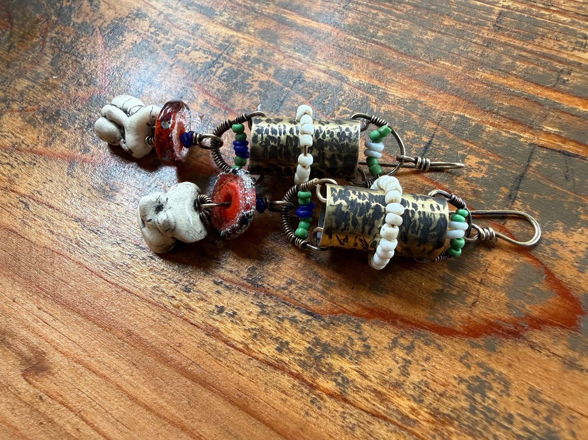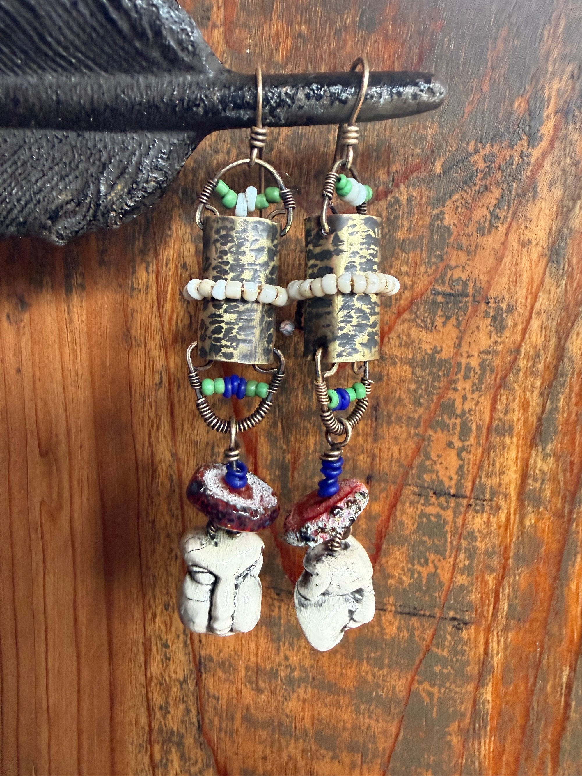 I got these Chinese ceramic mask and built a brass lantern to hold them. All metal is solid brass, textured, oxidized, polished. Ornate with Indonesian seed glass beads. An artisan, earthy and red lamp work as part of the composition and gives it a special touch. Brass ear wires.