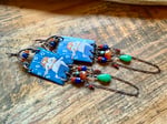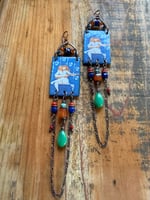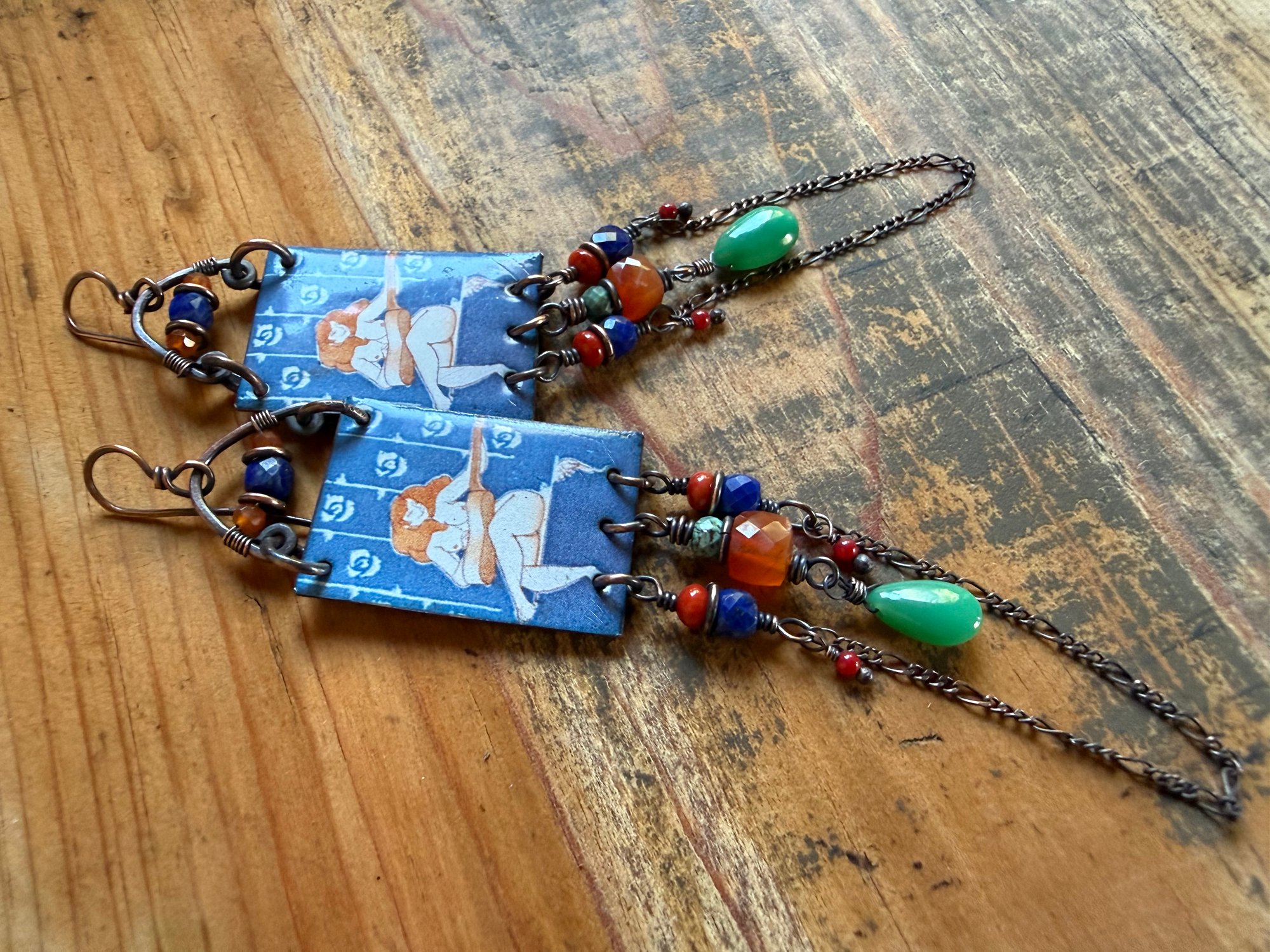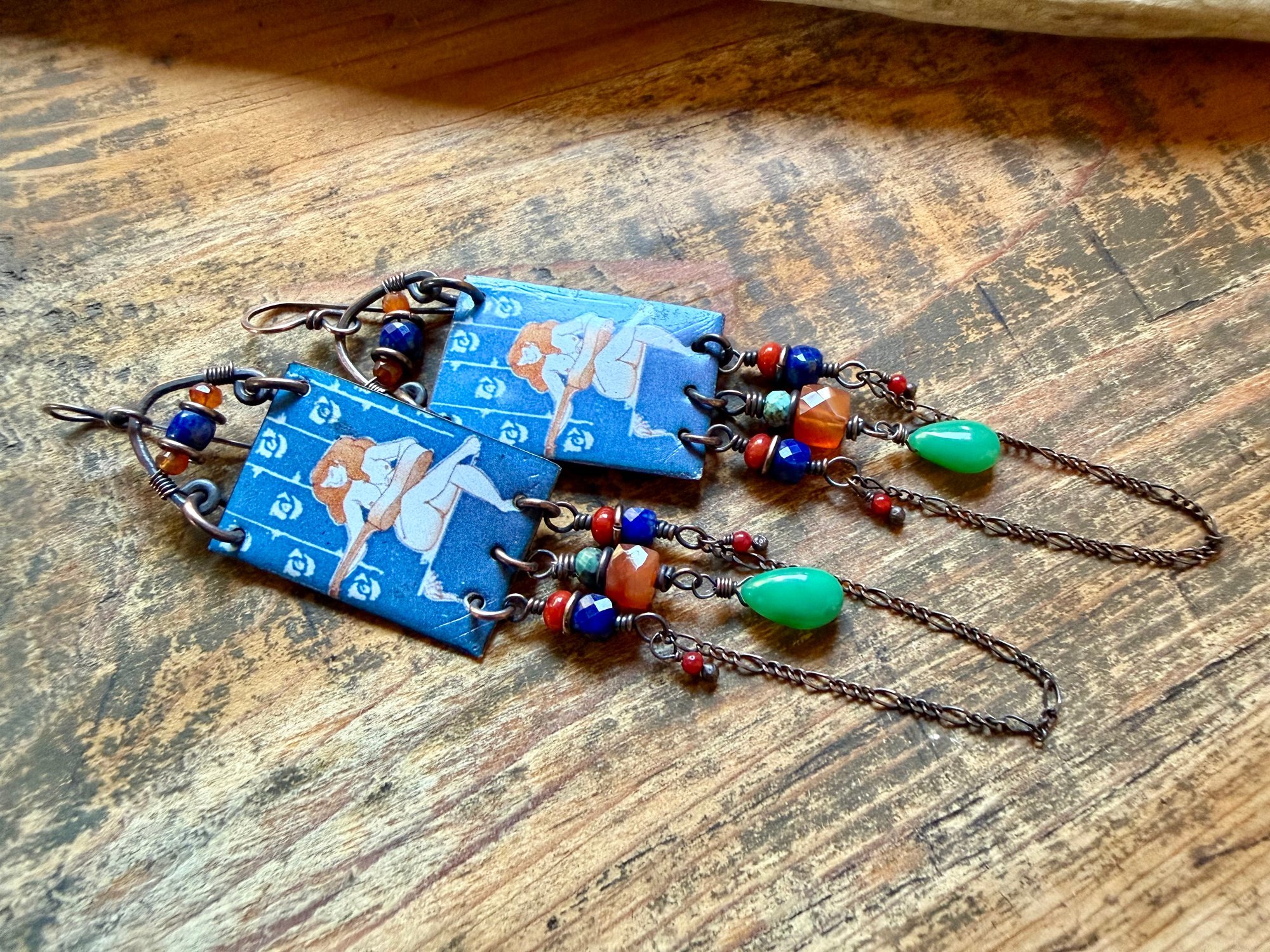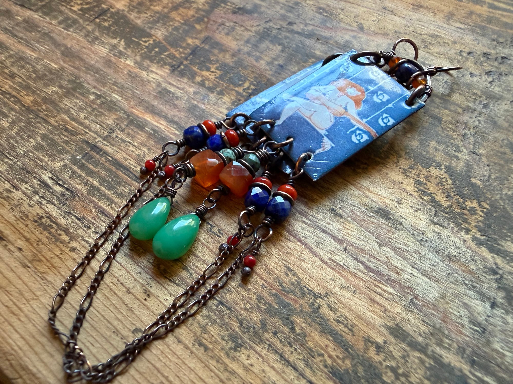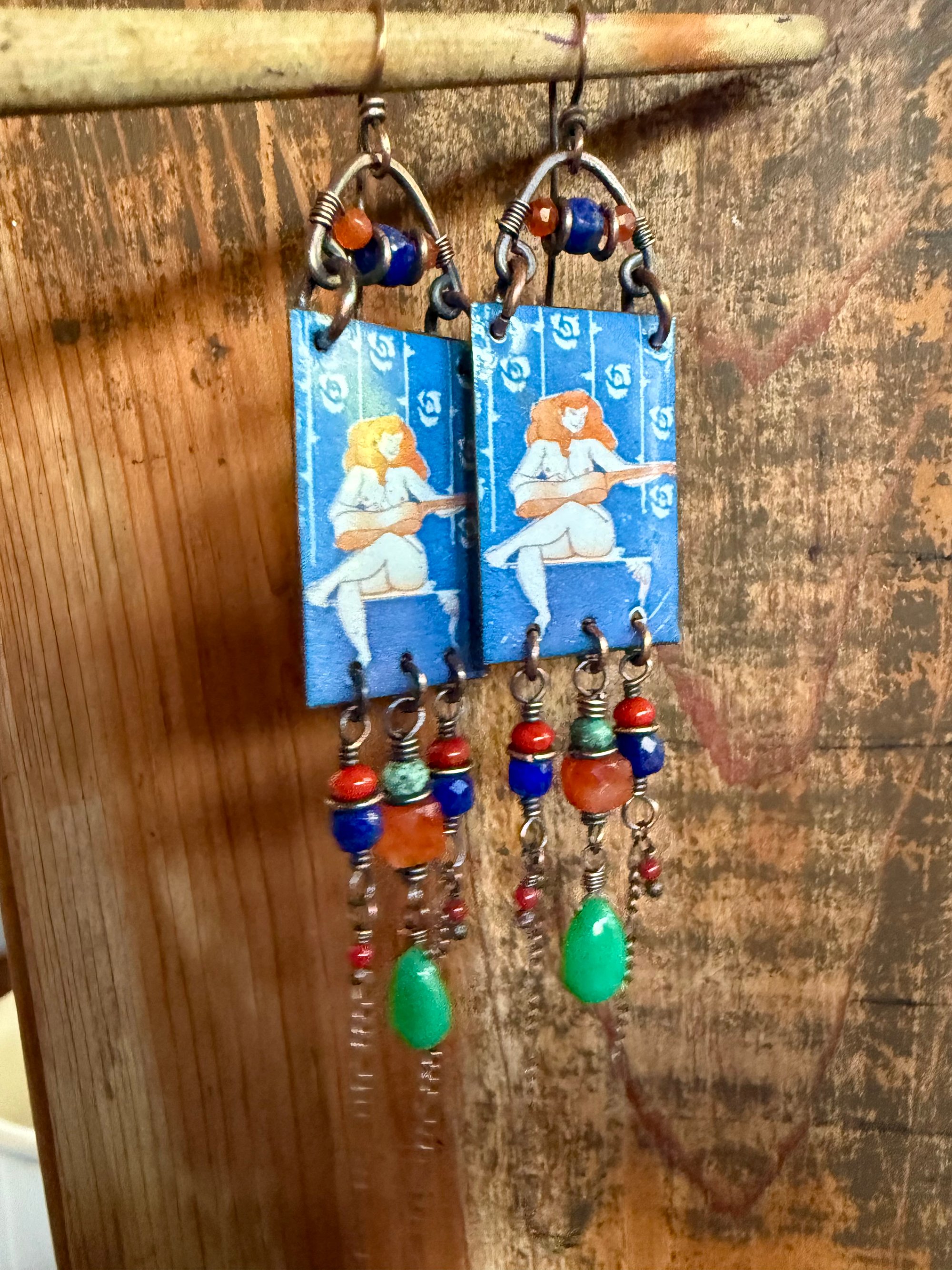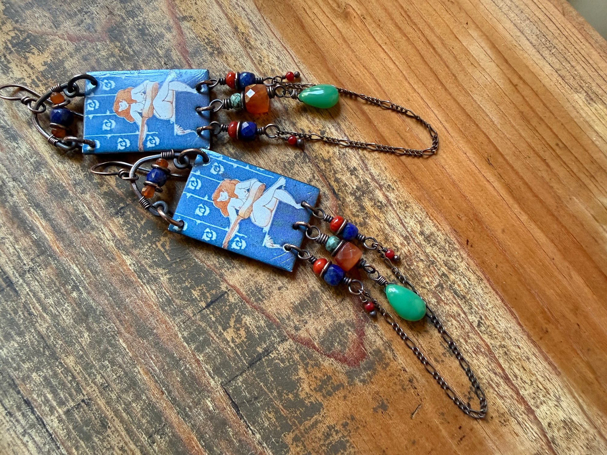 Artisan enamel picturing a female player ornate bellow with 3d square Carnelian stone, Chrysoprase drops, Lapis Lazuli, Corals in two different sizes, Turquoise and sections of antique copper chain. Focal enamel is hold about by a copper loop ornate with two Carnelian beads and a Lapis Lazuli. Finished with solid copper wire and ear wires.