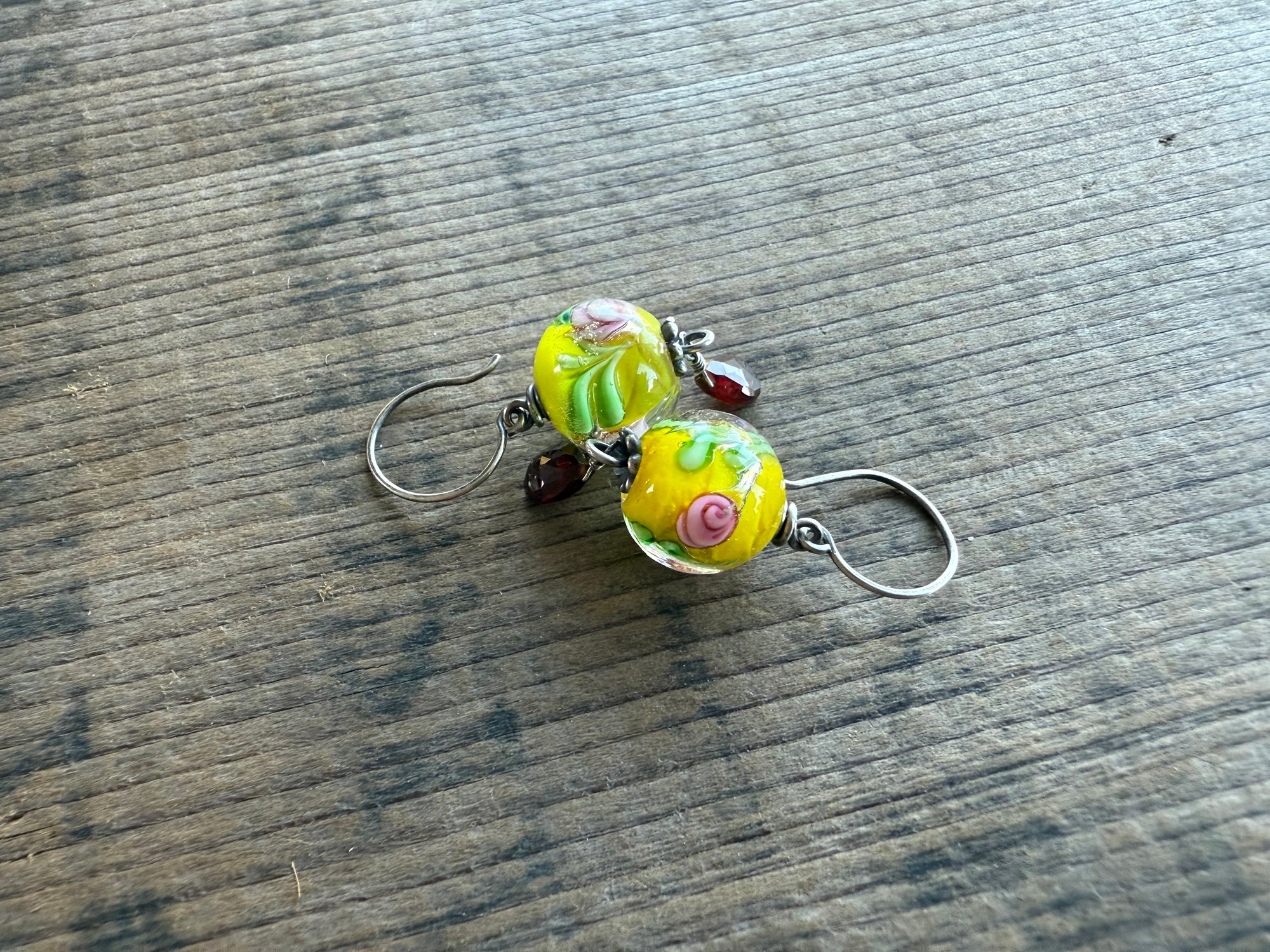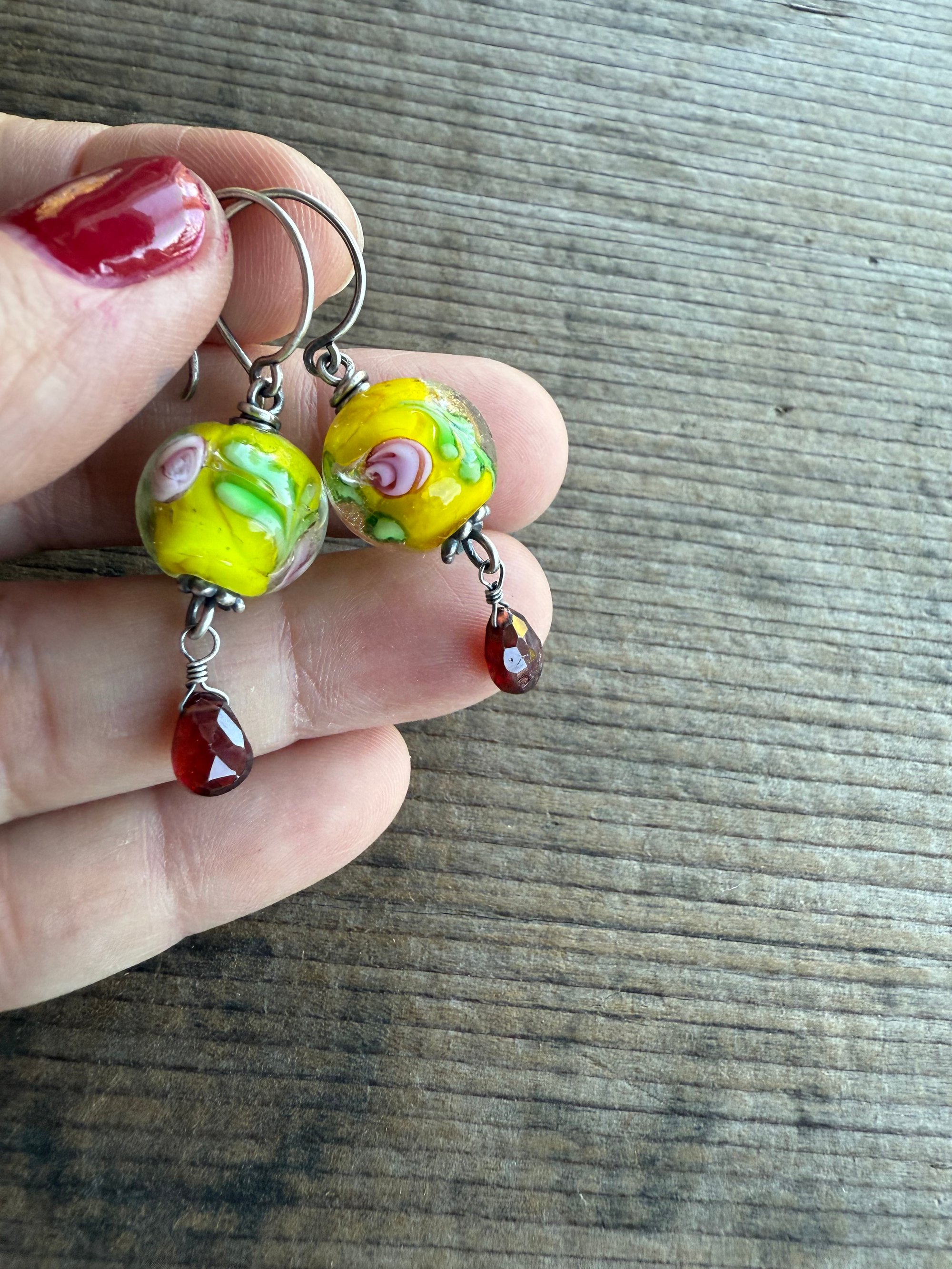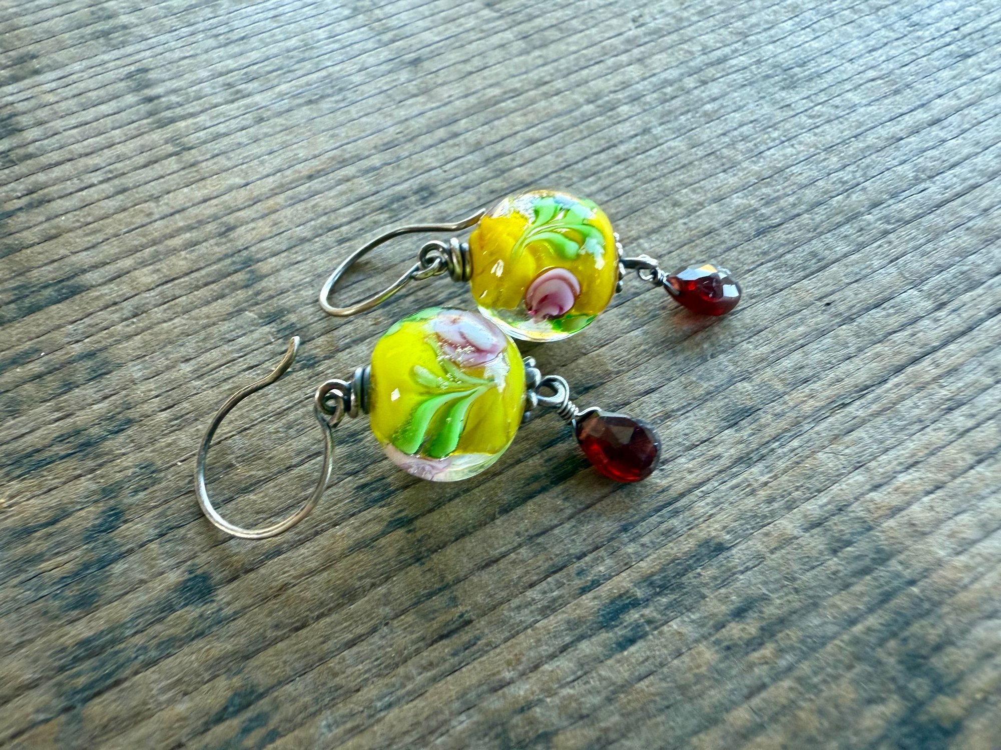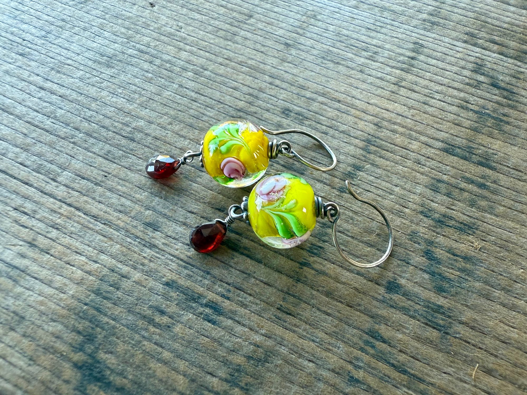 A vintage glass with roses paired with a Czech glass holds a Garnet droplet bellow. Bead caps, wires and ear wires are solid sterling silver, oxidized and polished for a rustic look.