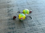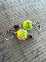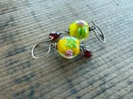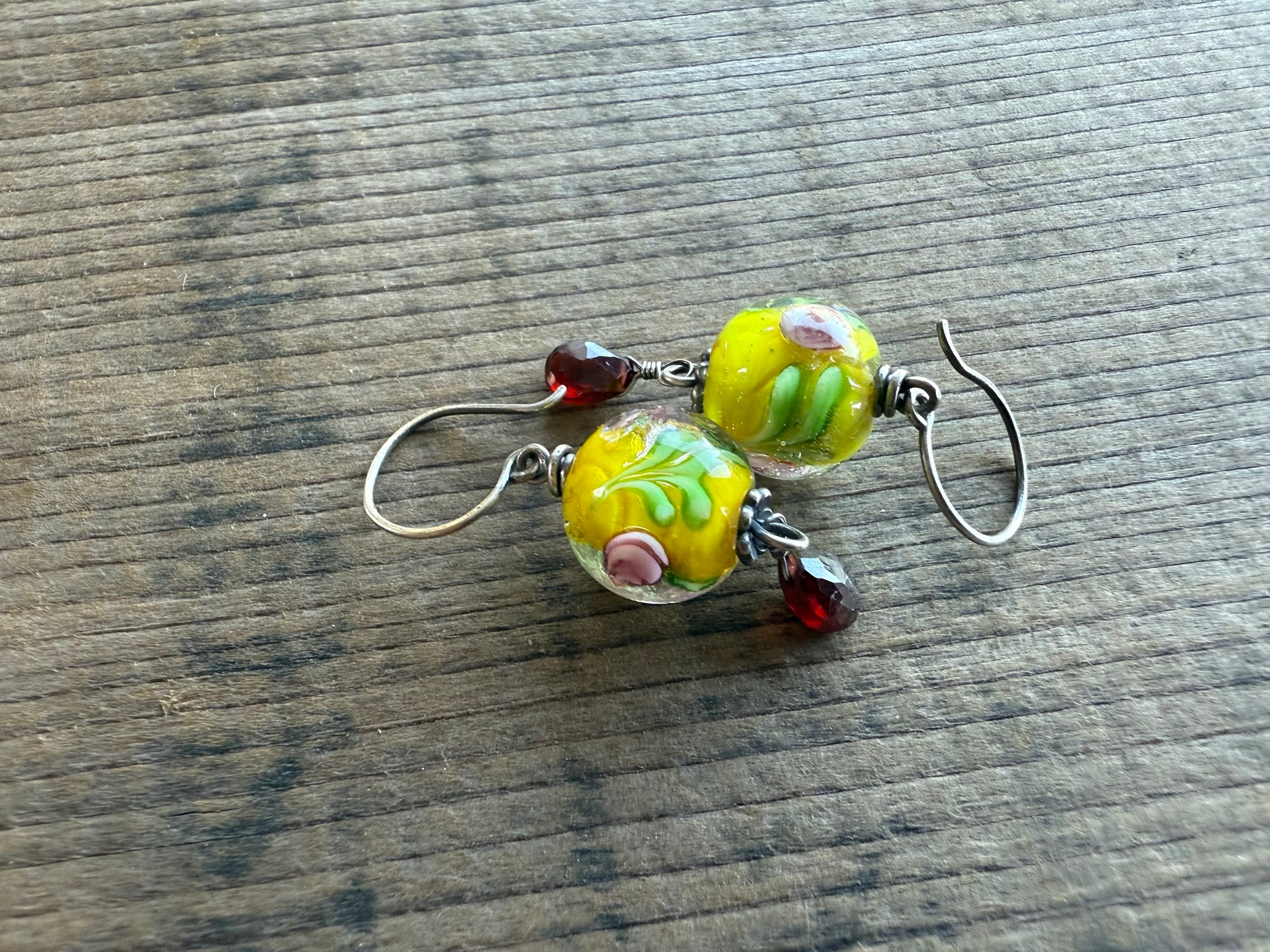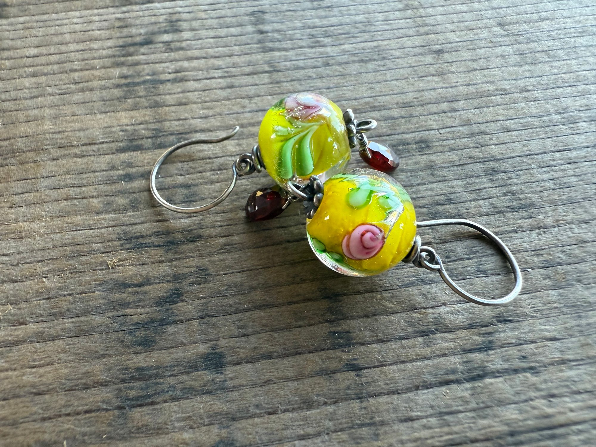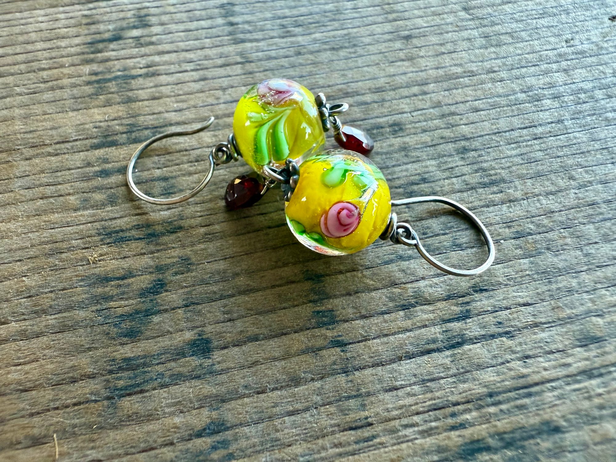 A vintage glass with roses paired with a Czech glass holds a Garnet droplet bellow. Bead caps, wires and ear wires are solid sterling silver, oxidized and polished for a rustic look.