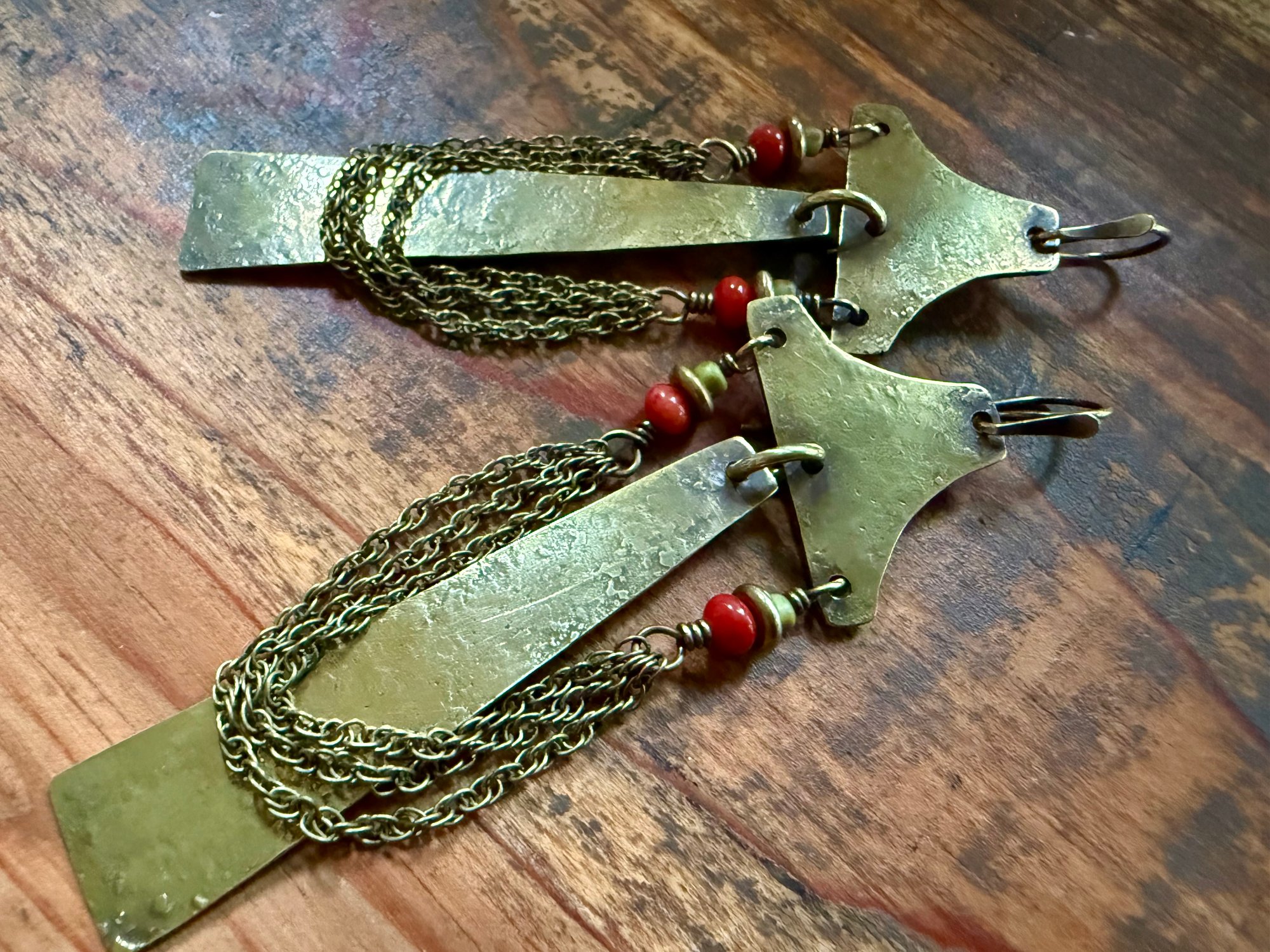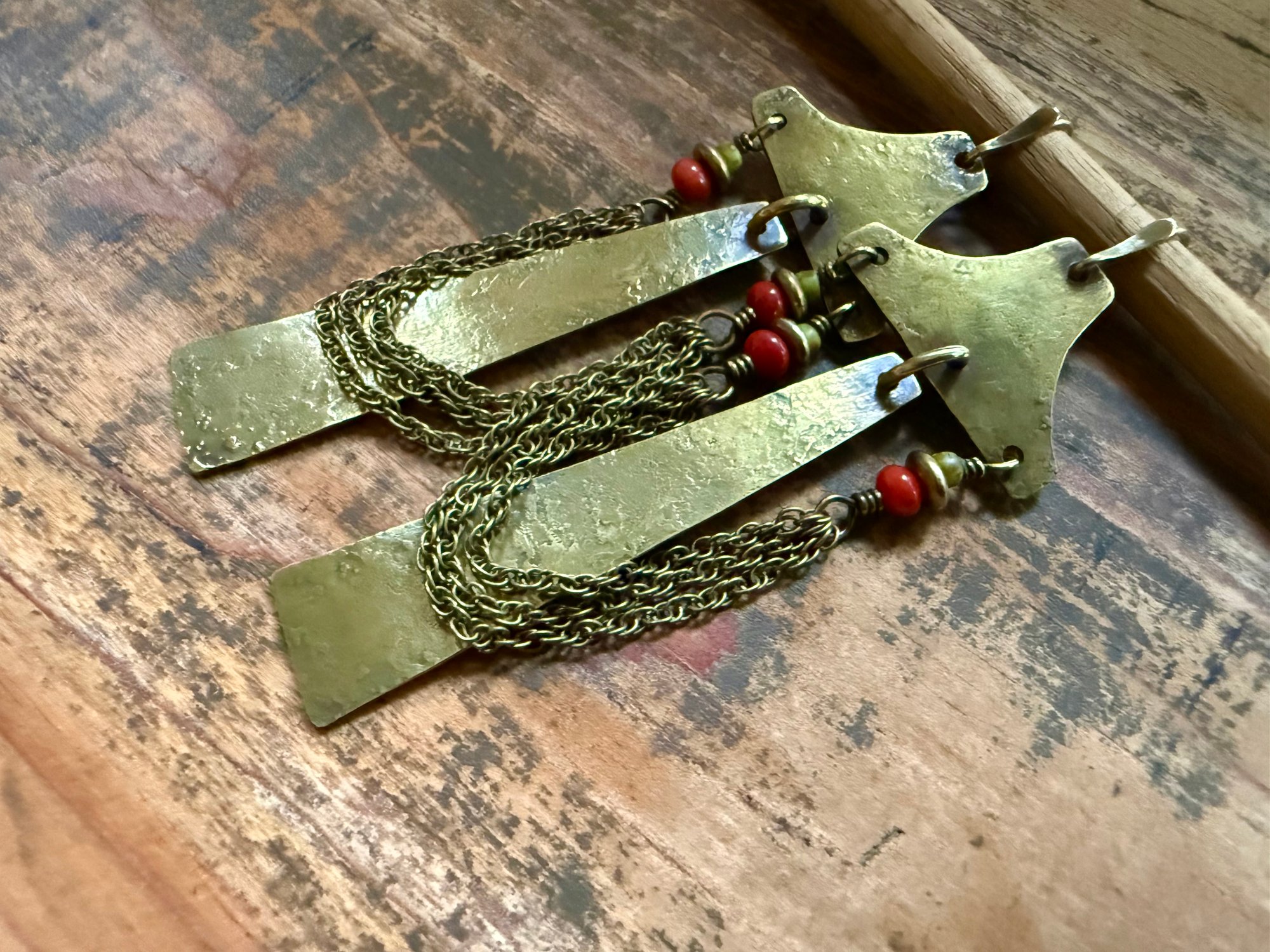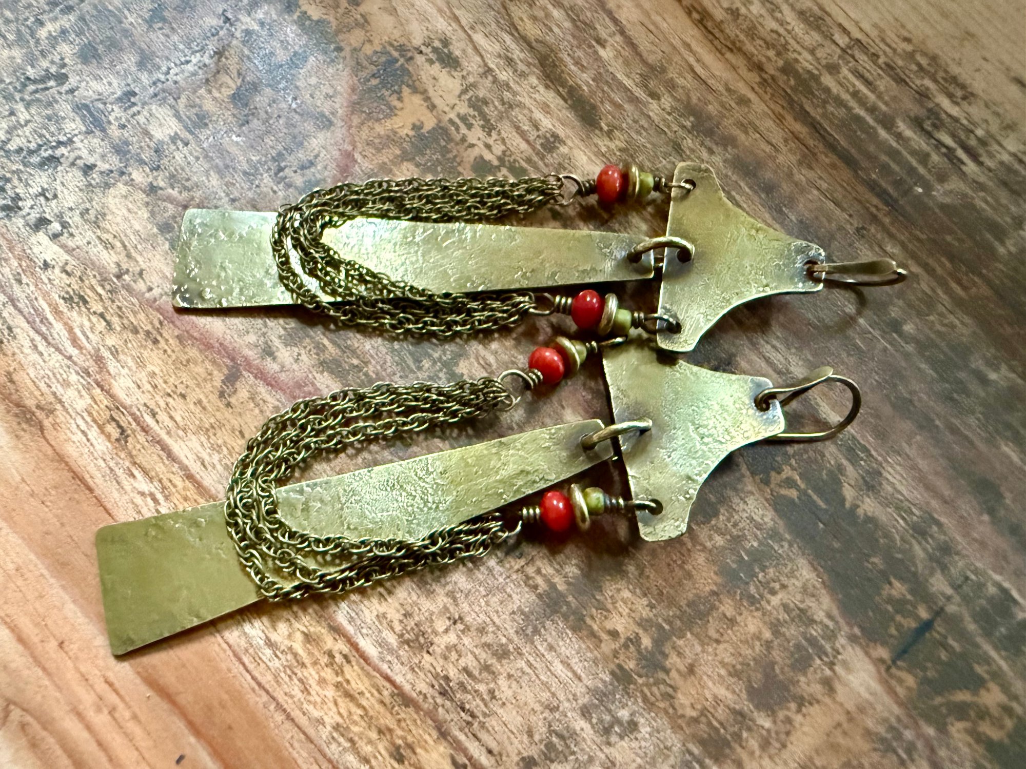 Brass elements were handmade by me.. cutting, texturing, polishing.. and then ornate with sections of antique chain, brass spacers and Coral beads. Brass ear wires.