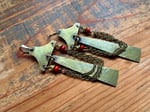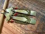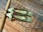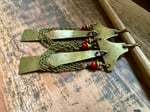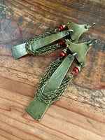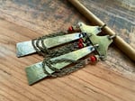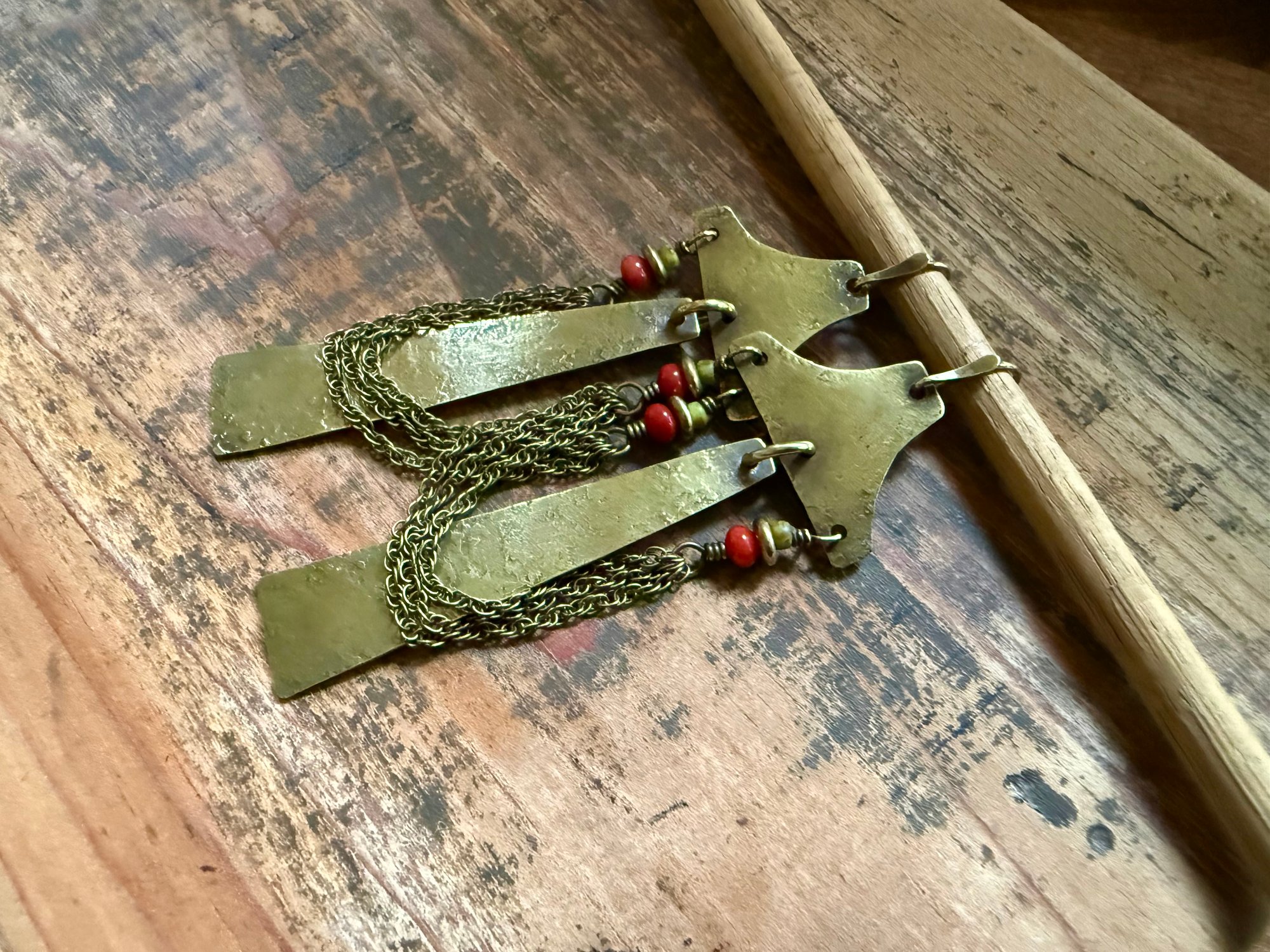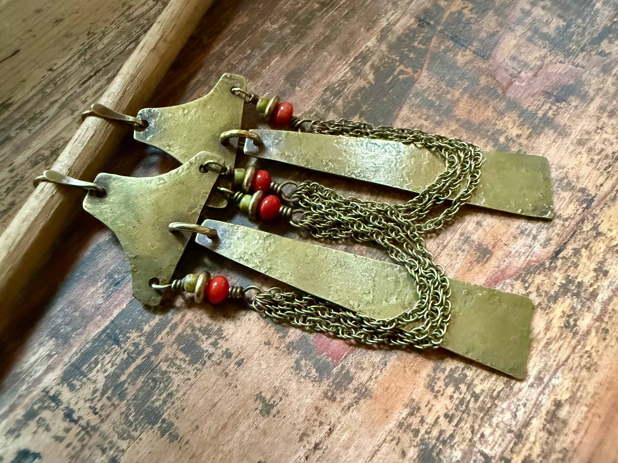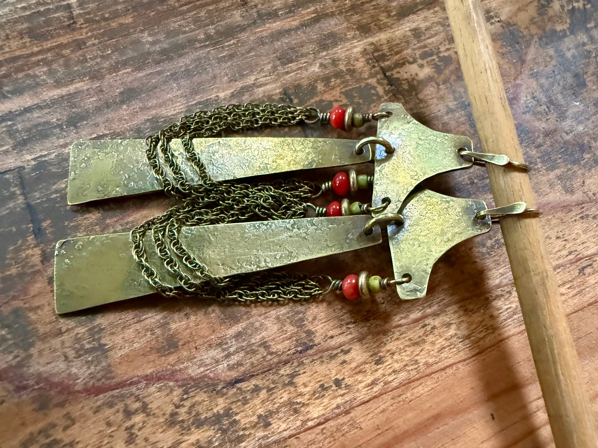 Brass elements were handmade by me.. cutting, texturing, polishing.. and then ornate with sections of antique chain, brass spacers and Coral beads. Brass ear wires.